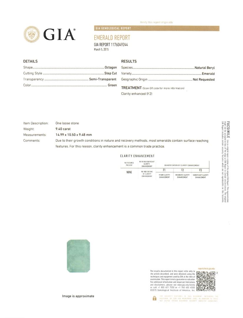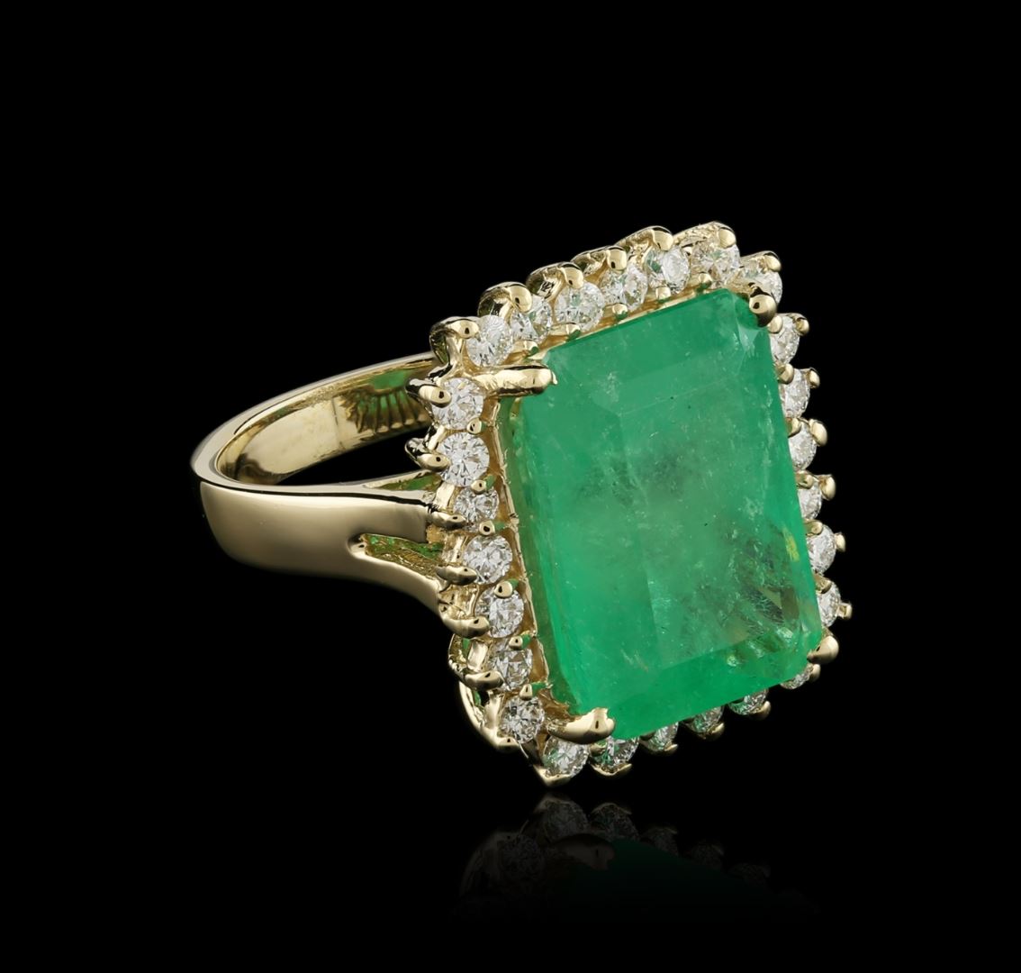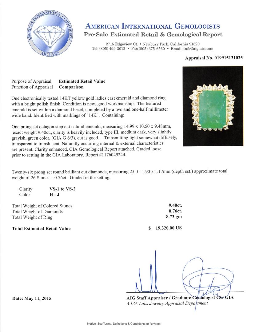 One electronically tested 14KT yellow gold ladies cast emerald and diamond ring with a bright polish finish. The featured emerald is set within a diamond bezel, completed by a two and one-half millimeter wide band. Identified with markings of "14K". Condition is new, good workmanship. Containing: One prong set octagon step cut natural emerald, measuring 14.99 x 10.50 x 9.48mm, exact weight 9.40ct., clarity is heavily included, type III, medium dark, very slightly grayish, green color, (GIA G 6/3), cut is good. Transmitting light somewhat diffusely, transparent to translucent. Naturally occurring internal & external characteristics are present. Clarity enhanced. GIA Gemological Report attached. Graded loose prior to setting in the GIA Laboratory, Report #1176049244.Twenty-Six prong set round brilliant cut diamonds, measuring 2.00 - 1.90 x 1.17mm (depth est.) approximate total weight of 26 Stones = 0.76ct. Graded in the setting. Clarity: VS-1 to VS-2. Color: H - J. Total Weight of Colored Stones 9.40ct. Total Weight of Diamonds 0.76ct. AIG Appraised at $19,320.00.