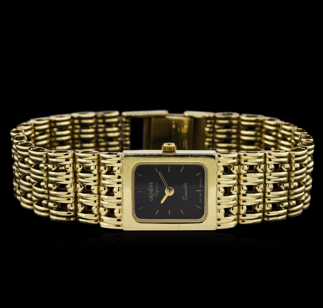 One 14KT Yellow Gold Geneve Supreme Wristwatch. Band: 14KT yellow gold. Dial: black marked swiss made.