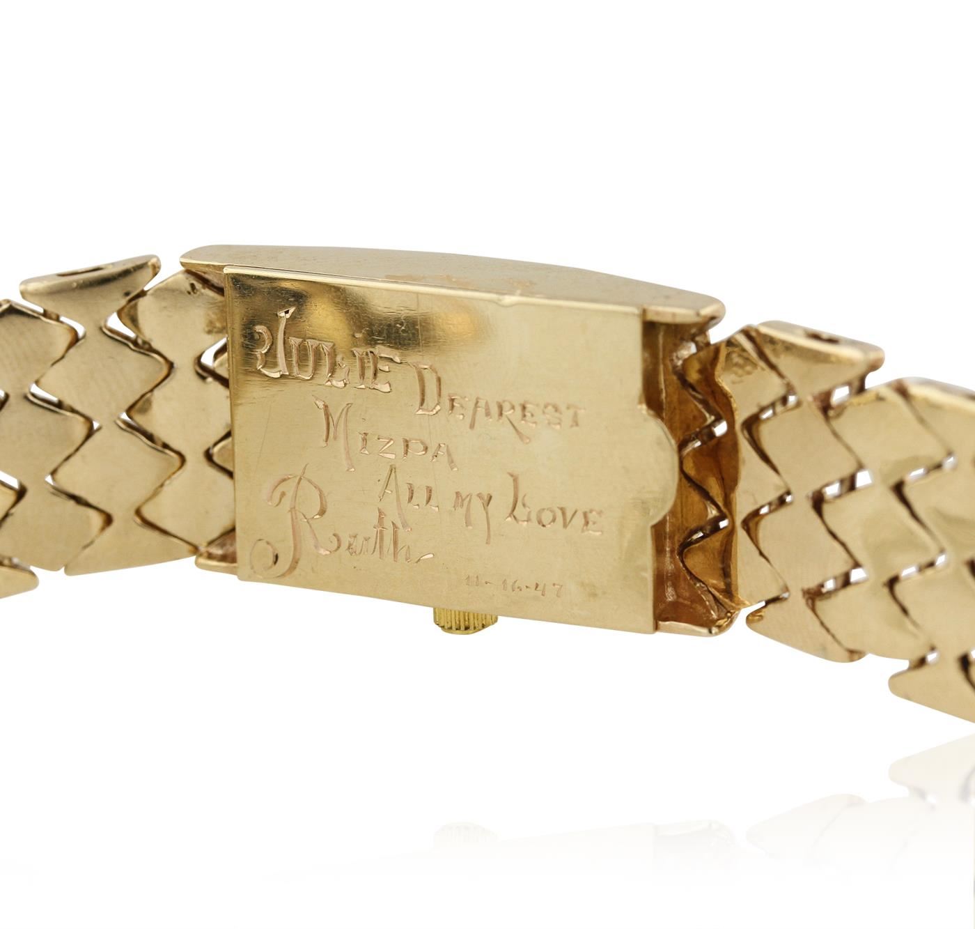 One Lady's hand crafted vintage JULES 14 karat yellow gold wristwatch electronically tested. Case: measures 25.00mm x 17.50mm with synthetic sapphire crystal. Quartz movement. Dial: silver in color with yellow gold markings and baton design hands. Bracelet: 14 karat yellow gold, mesh design with fold over buckle. 6.50 inch in length. Total Weight of Watch: 56.50gm. GGL Appraised at $4,200.00.