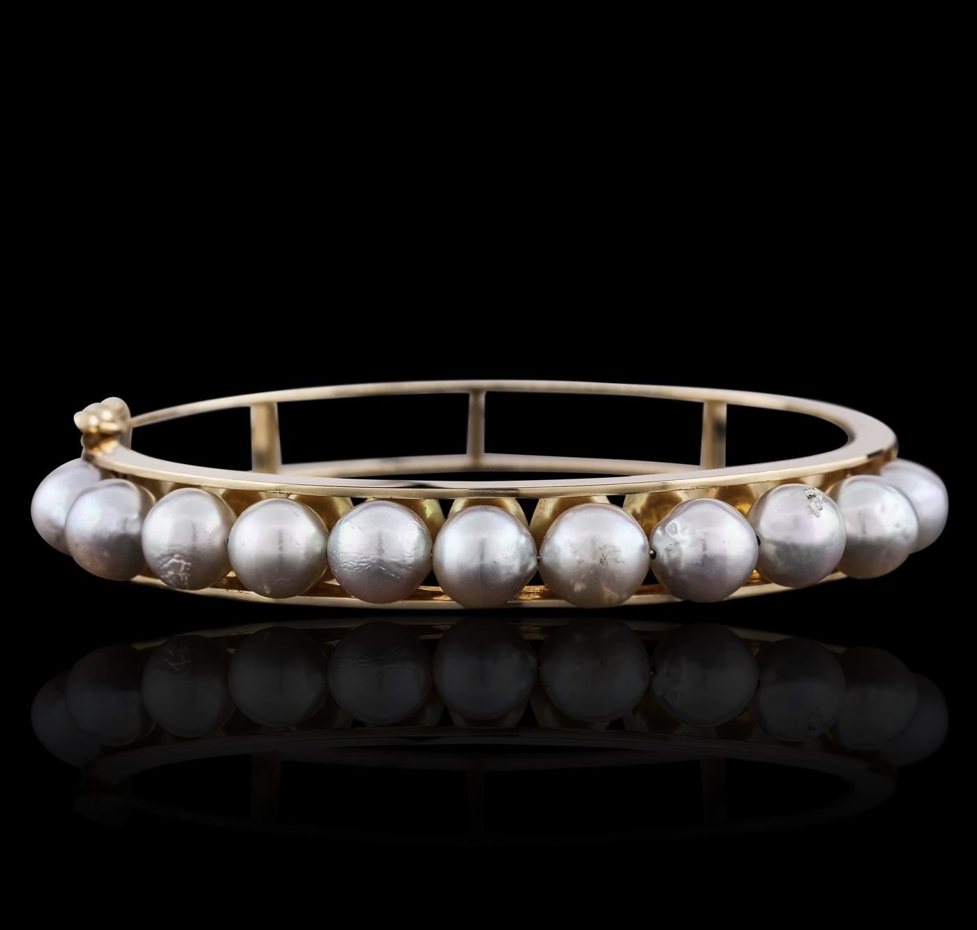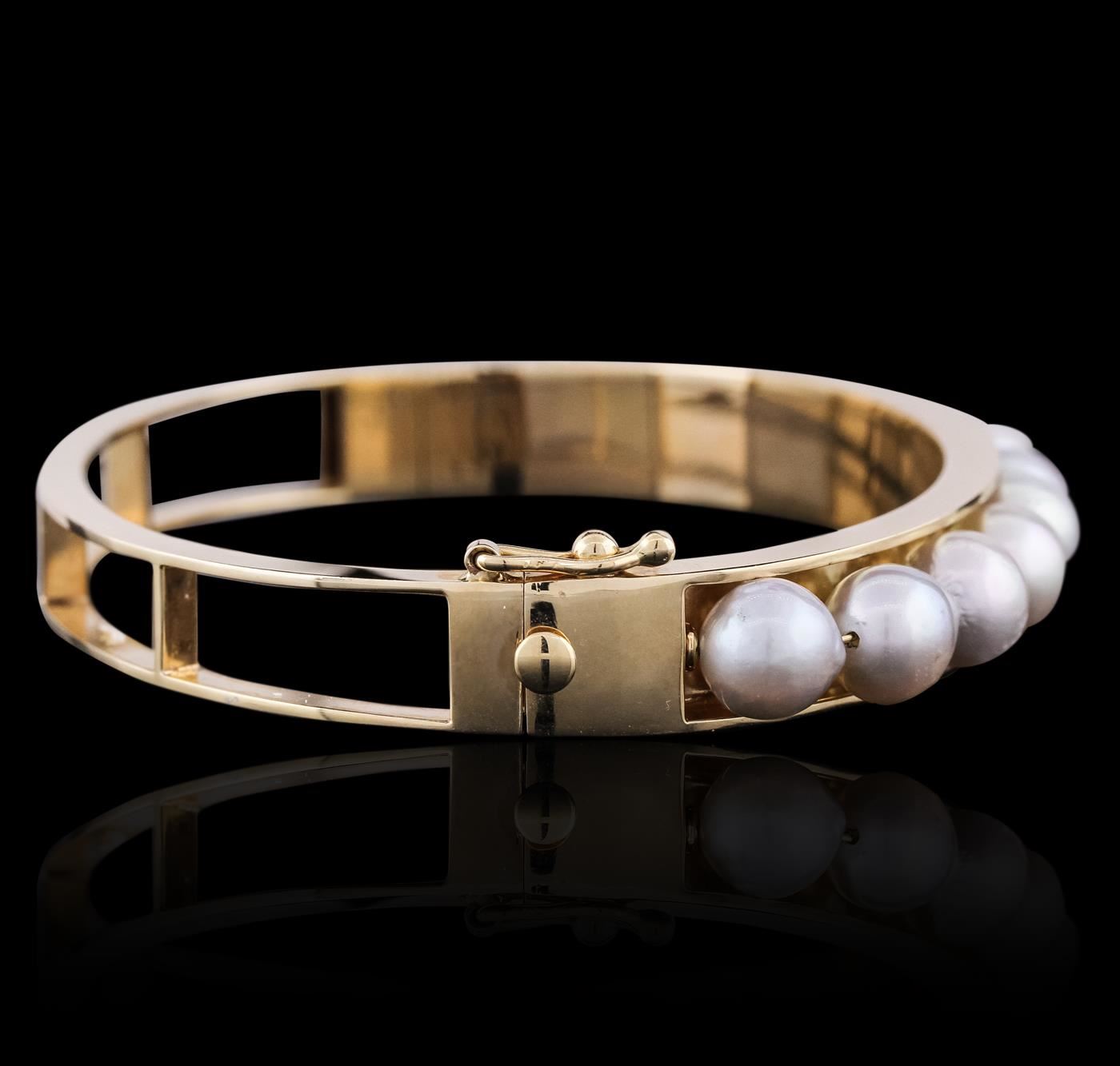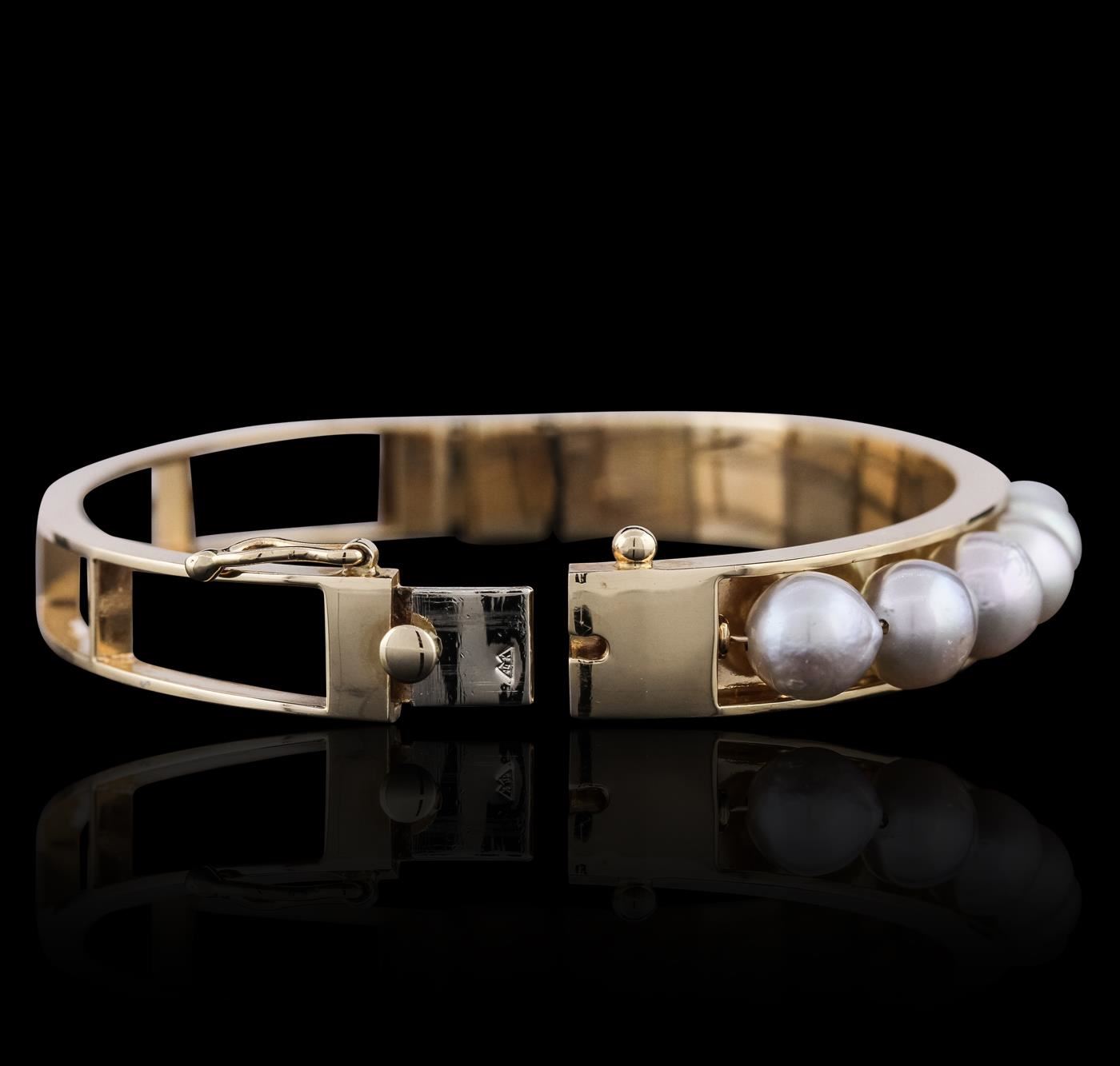 One bangle featuring: 14KT Yellow Gold with a total weight of 22.50 grams, and Pearls.