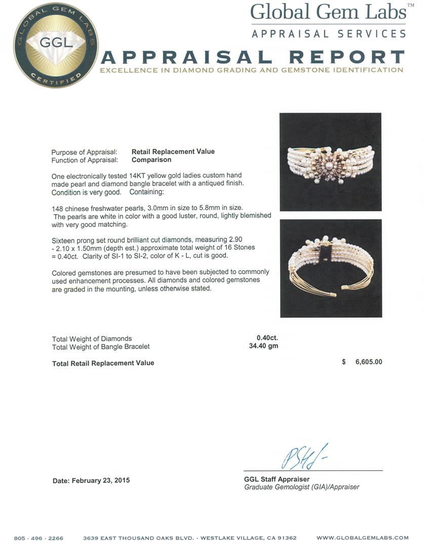 One electronically tested 14KT yellow gold ladies custom hand made pearl and diamond bangle bracelet with a antiqued finish. Condition is very good. Containing: 148 Chinese freshwater pearls, 3.0mm in size to 5.8mm in size. The pearls are white in color with a good luster, round, lightly blemished. Sixteen prong set round brilliant cut diamonds, measuring 2.90 - 2.10 x 1.50mm (depth est.) approximate total weight of 16 Stones = 0.40ct. Clarity: SI-1 to SI-2. Color: K - L, Cut is Good. Colored gemstones are presumed to have been subjected to commonly used enhancement processes. All diamonds and colored gemstones are graded in the mounting, unless otherwise stated. Total Weight of Diamonds 0.40ct. Total Weight of Bangle Bracelet 34.40 grams. GGL Appraised at $6,605.00.