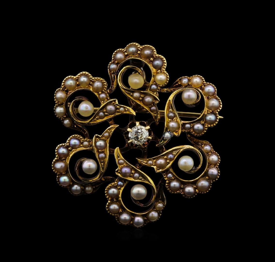 One electronically tested 14KT yellow gold ladies cast & assembled diamond and seed pearl brooch/pendant. The brooch/pendant features a diamond set within a stylized seed pearl lattice, completed by a horizontally placed pin and hidden bail. Bright polish finish with milgrain detailing. Identified with markings of "14K". Condition is good. Containing: One prong set Old European cut diamond, measuring 3.00 - 2.90 x 1.83mm (depth est.) approximate weight of 0.10ct. Cutting style circa early 19th century. Graded in the setting. Clarity: SI-1. Color: J 66 seed pearl pearls, 2.5mm in size to 1.0mm in size. The pearls are cream in color with a medium luster, off-round, lightly spotted with good uniformity Graded in the setting. A seed pearl is a small natural pearl, formed in either a saltwater oyster or fresh water mussel, that is usually less the a one-quarter grain in weight and smaller then 2mm in size and off-round in shape. In jewelry they are used as decorative borders, tiny accents in small patterns or in larger clusters woven together to make up an entire piece of jewelry. One of the most historically famous examples of seed pearl jewelry is that of a seed pearl suite (a necklace and two matching bracelets) purchased on April 28, 1862 from Tiffany and Co. for Mary Todd Lincoln from President Abraham Lincoln to wear to the first Lincoln inaugural ball. Total Weight of Diamonds 0.10ct. AIG Appraised at $1,500.00.