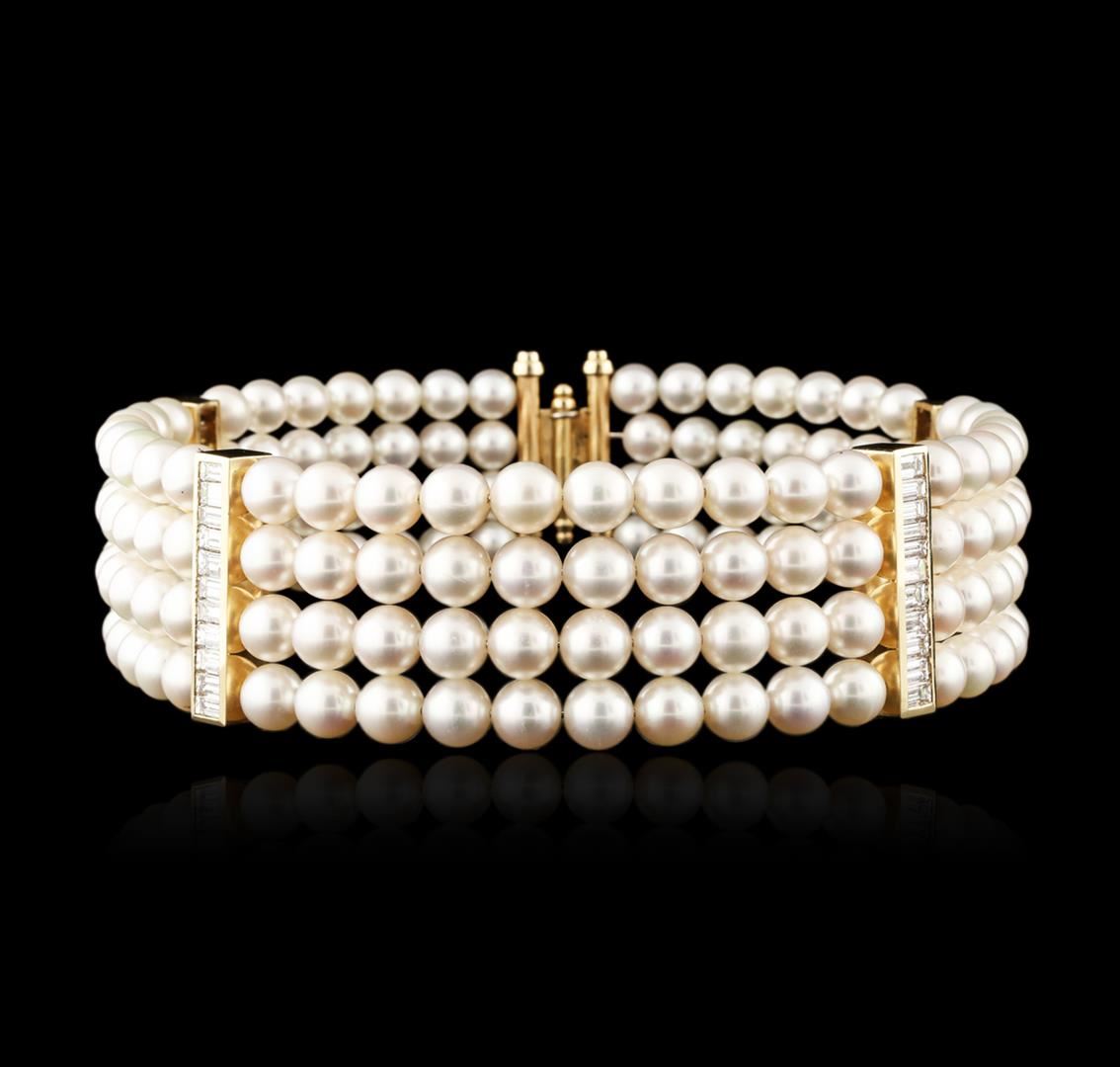 One electronically tested 14KT yellow gold ladies cast & assembled akoya cultured pearl and diamond choker. The twelve inch wearable length choker features a one and one-quarter inch wide four row akoya cultured pearl ribbon with four 14KT yellow gold diamond spacer bars, terminating in a 14KT yellow gold plunger style clasp. Bright polish finish. Condition is good. Containing: 160 akoya cultured pearls, 6.5mm in size to 7.0mm in size. The pearls are cream rose' in color with a high luster, thick nacre, all round, lightly spotted with good uniformity Graded in the setting. Akoya Cultured Pearls are farmed in the ocean waters around the countries of Japan and China. In Japan the main culturing areas are near Ehime, Kumamoto, and Nagasaki. In China, the main culturing areas are Hainan Island, Chenghai Guangdong, and Liusha Zhangjiang. Liusha is known in China as the Country of Akoya Pearls. The Akoya oyster Pinctada Fucata Martensii is the smallest pearl-producing oyster. The cultured pearl is produced by inserting a nuclei and a small piece of mantle tissue into the oyster. Akoya pearls tend to range in size from about 4 to 8 millimeters and consistently are round and or near-round. The Akoya pearl takes from two to three years to form. Akoya pearls are the pearls most often used in necklaces. They are generally white or cream colored, and have overtones of rose, pink, cream, and or green. The development of the modern pearl culturing technique is due to the work of one man, Kokichi Mikimoto who began work on this idea in the late 19th century. The Japanese Akoya cultured pearl became the first pearl to be cultured in a steady reliable production. Forty-Two channel set baguette cut diamonds, measuring from 4.40 x 2.30 x 1.61mm (depth est.) to 4.60 x 2.50 x 1.75mm (depth est.) approximate total weight of 42 Stones = 6.97ct. Graded in the setting. Clarity: VVS-2 to VS-2. Color: F - H. Total Weight of Diamonds 6.97ct. Total Weight of Choker121.73 grams. AIG Appraised at $33,620.00.