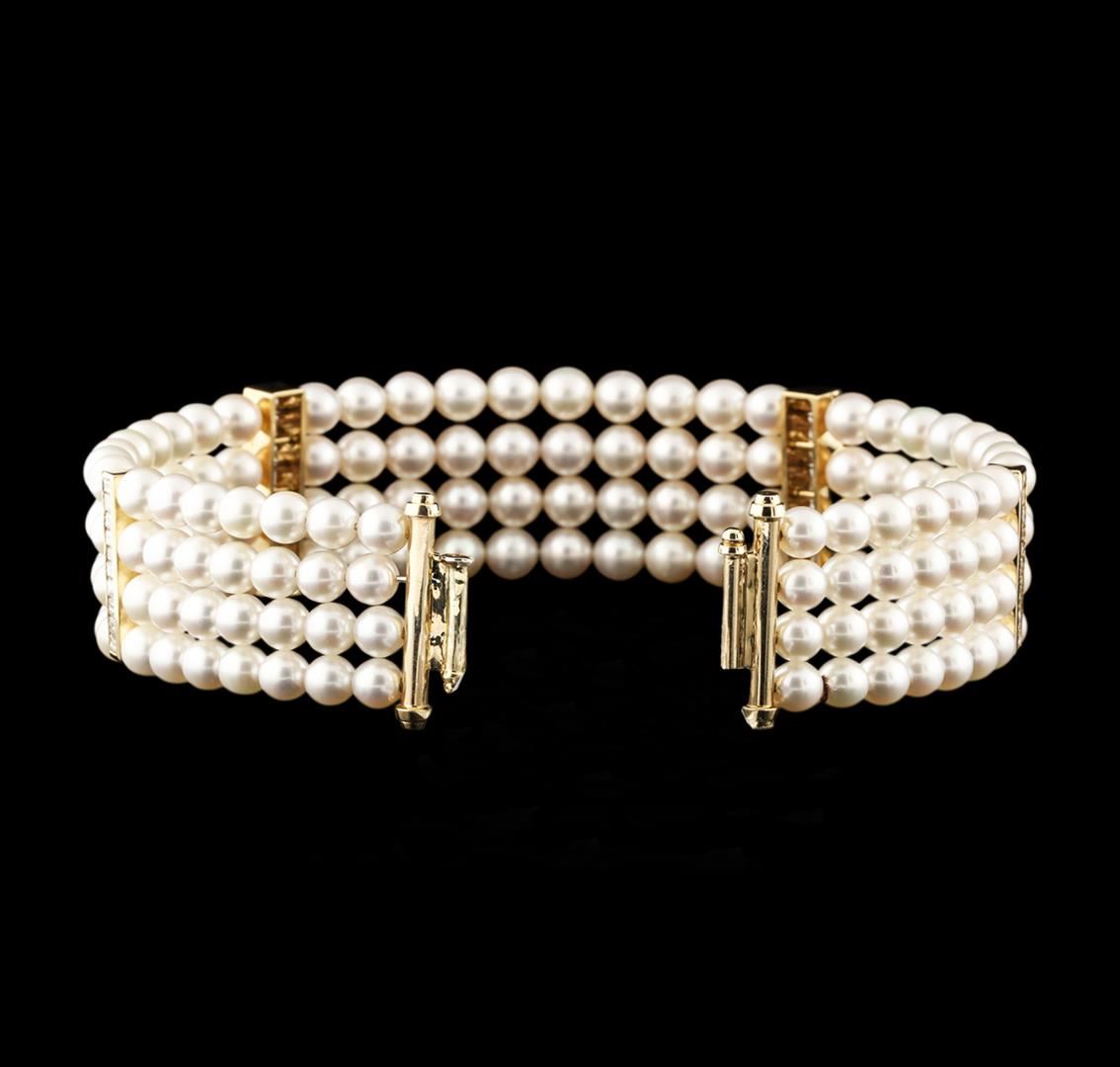 One electronically tested 14KT yellow gold ladies cast & assembled akoya cultured pearl and diamond choker. The twelve inch wearable length choker features a one and one-quarter inch wide four row akoya cultured pearl ribbon with four 14KT yellow gold diamond spacer bars, terminating in a 14KT yellow gold plunger style clasp. Bright polish finish. Condition is good. Containing: 160 akoya cultured pearls, 6.5mm in size to 7.0mm in size. The pearls are cream rose' in color with a high luster, thick nacre, all round, lightly spotted with good uniformity Graded in the setting. Akoya Cultured Pearls are farmed in the ocean waters around the countries of Japan and China. In Japan the main culturing areas are near Ehime, Kumamoto, and Nagasaki. In China, the main culturing areas are Hainan Island, Chenghai Guangdong, and Liusha Zhangjiang. Liusha is known in China as the Country of Akoya Pearls. The Akoya oyster Pinctada Fucata Martensii is the smallest pearl-producing oyster. The cultured pearl is produced by inserting a nuclei and a small piece of mantle tissue into the oyster. Akoya pearls tend to range in size from about 4 to 8 millimeters and consistently are round and or near-round. The Akoya pearl takes from two to three years to form. Akoya pearls are the pearls most often used in necklaces. They are generally white or cream colored, and have overtones of rose, pink, cream, and or green. The development of the modern pearl culturing technique is due to the work of one man, Kokichi Mikimoto who began work on this idea in the late 19th century. The Japanese Akoya cultured pearl became the first pearl to be cultured in a steady reliable production. Forty-Two channel set baguette cut diamonds, measuring from 4.40 x 2.30 x 1.61mm (depth est.) to 4.60 x 2.50 x 1.75mm (depth est.) approximate total weight of 42 Stones = 6.97ct. Graded in the setting. Clarity: VVS-2 to VS-2. Color: F - H. Total Weight of Diamonds 6.97ct. Total Weight of Choker121.73 grams. AIG Appraised at $33,620.00.
