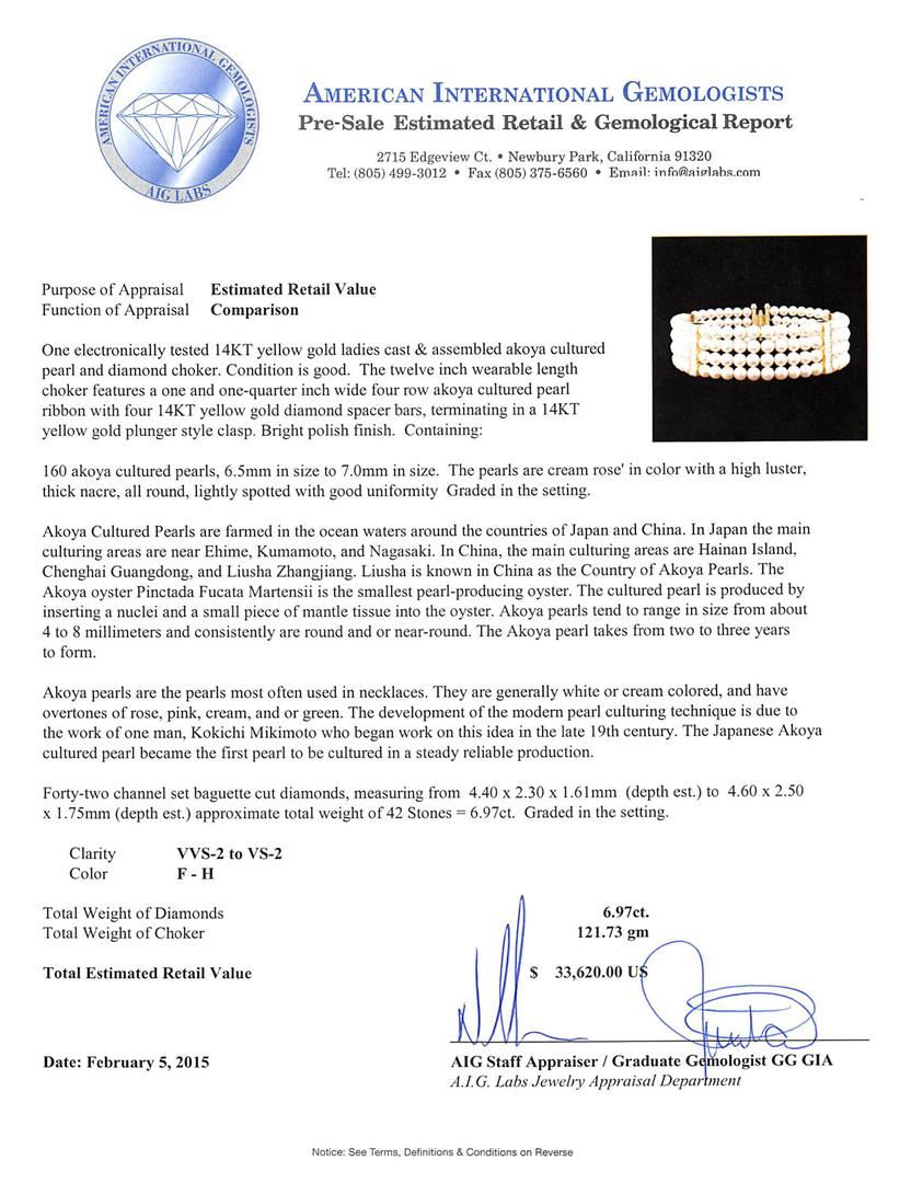 One electronically tested 14KT yellow gold ladies cast & assembled akoya cultured pearl and diamond choker. The twelve inch wearable length choker features a one and one-quarter inch wide four row akoya cultured pearl ribbon with four 14KT yellow gold diamond spacer bars, terminating in a 14KT yellow gold plunger style clasp. Bright polish finish. Condition is good. Containing: 160 akoya cultured pearls, 6.5mm in size to 7.0mm in size. The pearls are cream rose' in color with a high luster, thick nacre, all round, lightly spotted with good uniformity Graded in the setting. Akoya Cultured Pearls are farmed in the ocean waters around the countries of Japan and China. In Japan the main culturing areas are near Ehime, Kumamoto, and Nagasaki. In China, the main culturing areas are Hainan Island, Chenghai Guangdong, and Liusha Zhangjiang. Liusha is known in China as the Country of Akoya Pearls. The Akoya oyster Pinctada Fucata Martensii is the smallest pearl-producing oyster. The cultured pearl is produced by inserting a nuclei and a small piece of mantle tissue into the oyster. Akoya pearls tend to range in size from about 4 to 8 millimeters and consistently are round and or near-round. The Akoya pearl takes from two to three years to form. Akoya pearls are the pearls most often used in necklaces. They are generally white or cream colored, and have overtones of rose, pink, cream, and or green. The development of the modern pearl culturing technique is due to the work of one man, Kokichi Mikimoto who began work on this idea in the late 19th century. The Japanese Akoya cultured pearl became the first pearl to be cultured in a steady reliable production. Forty-Two channel set baguette cut diamonds, measuring from 4.40 x 2.30 x 1.61mm (depth est.) to 4.60 x 2.50 x 1.75mm (depth est.) approximate total weight of 42 Stones = 6.97ct. Graded in the setting. Clarity: VVS-2 to VS-2. Color: F - H. Total Weight of Diamonds 6.97ct. Total Weight of Choker121.73 grams. AIG Appraised at $33,620.00.