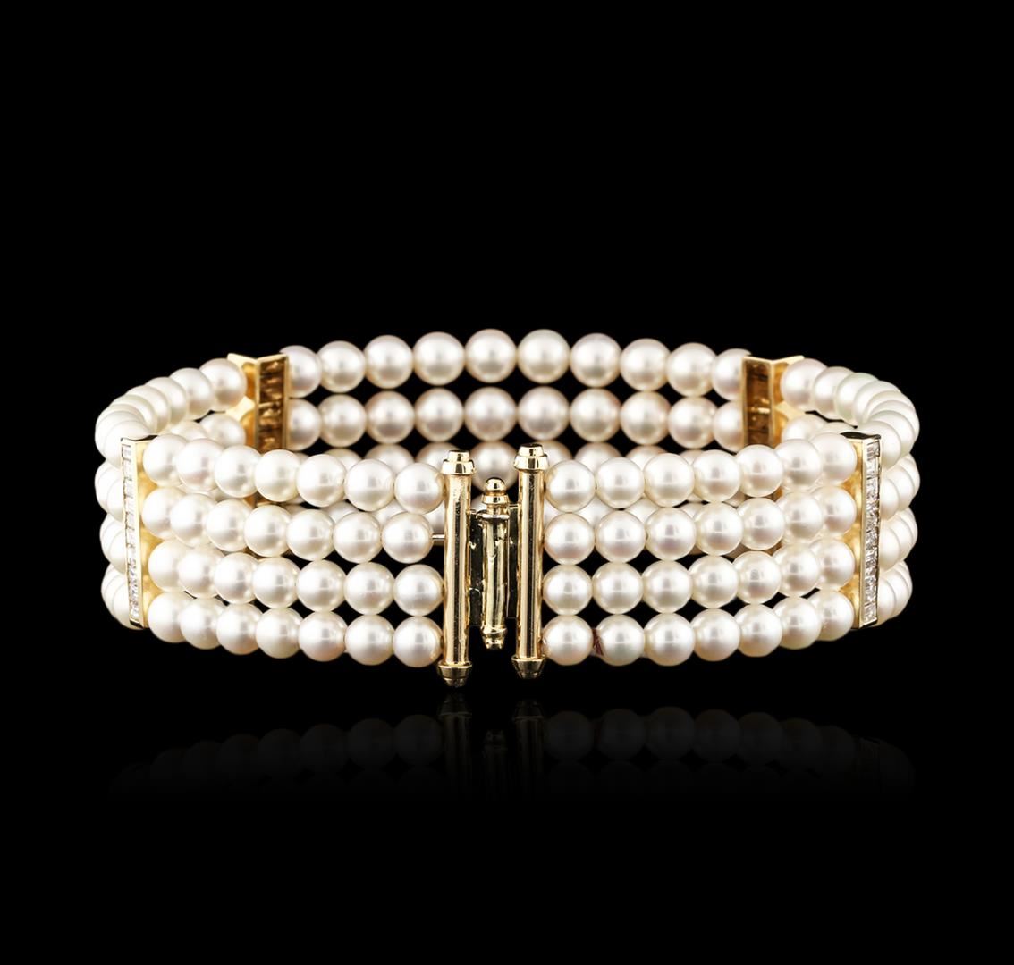 One electronically tested 14KT yellow gold ladies cast & assembled akoya cultured pearl and diamond choker. The twelve inch wearable length choker features a one and one-quarter inch wide four row akoya cultured pearl ribbon with four 14KT yellow gold diamond spacer bars, terminating in a 14KT yellow gold plunger style clasp. Bright polish finish. Condition is good. Containing: 160 akoya cultured pearls, 6.5mm in size to 7.0mm in size. The pearls are cream rose' in color with a high luster, thick nacre, all round, lightly spotted with good uniformity Graded in the setting. Akoya Cultured Pearls are farmed in the ocean waters around the countries of Japan and China. In Japan the main culturing areas are near Ehime, Kumamoto, and Nagasaki. In China, the main culturing areas are Hainan Island, Chenghai Guangdong, and Liusha Zhangjiang. Liusha is known in China as the Country of Akoya Pearls. The Akoya oyster Pinctada Fucata Martensii is the smallest pearl-producing oyster. The cultured pearl is produced by inserting a nuclei and a small piece of mantle tissue into the oyster. Akoya pearls tend to range in size from about 4 to 8 millimeters and consistently are round and or near-round. The Akoya pearl takes from two to three years to form. Akoya pearls are the pearls most often used in necklaces. They are generally white or cream colored, and have overtones of rose, pink, cream, and or green. The development of the modern pearl culturing technique is due to the work of one man, Kokichi Mikimoto who began work on this idea in the late 19th century. The Japanese Akoya cultured pearl became the first pearl to be cultured in a steady reliable production. Forty-Two channel set baguette cut diamonds, measuring from 4.40 x 2.30 x 1.61mm (depth est.) to 4.60 x 2.50 x 1.75mm (depth est.) approximate total weight of 42 Stones = 6.97ct. Graded in the setting. Clarity: VVS-2 to VS-2. Color: F - H. Total Weight of Diamonds 6.97ct. Total Weight of Choker121.73 grams. AIG Appraised at $33,620.00.