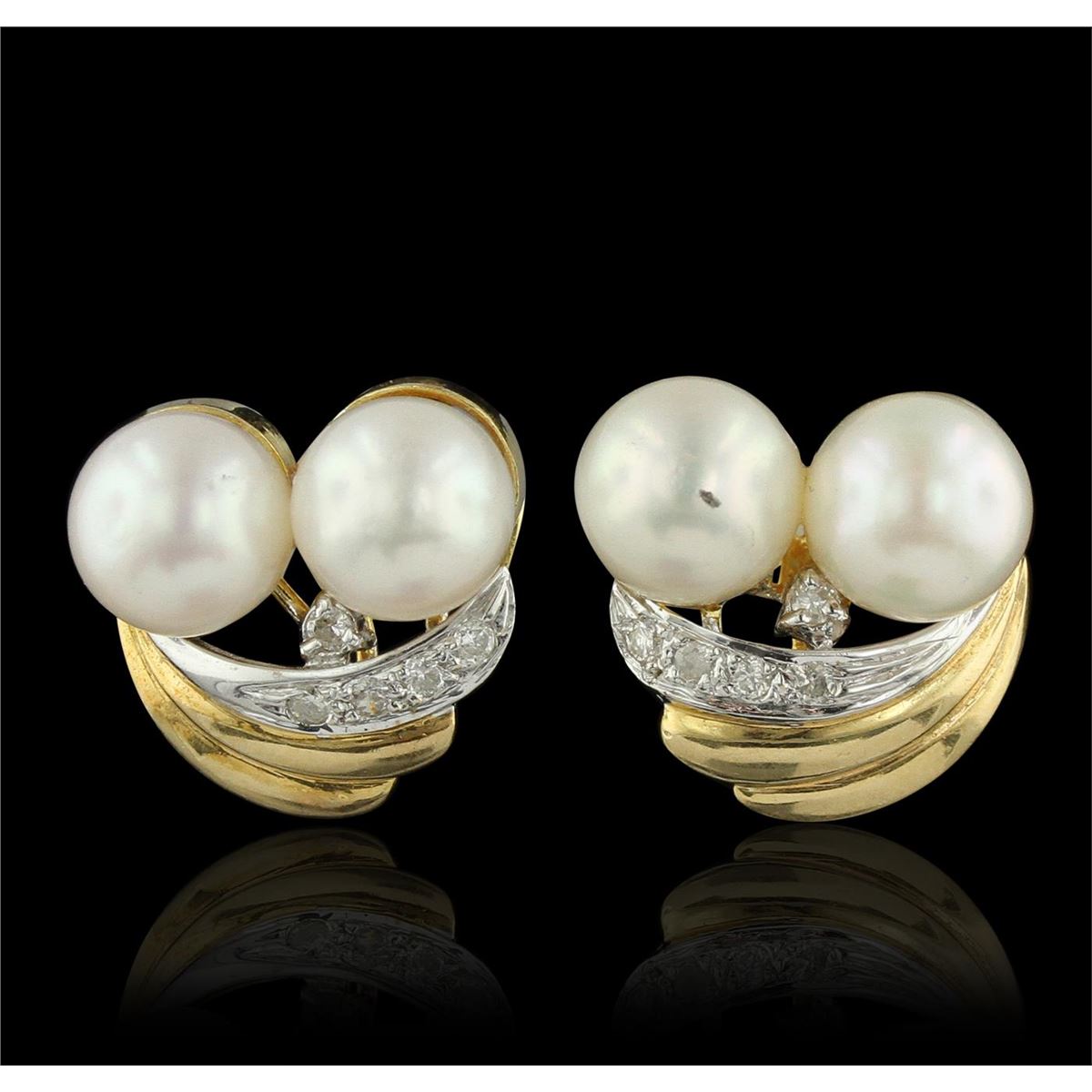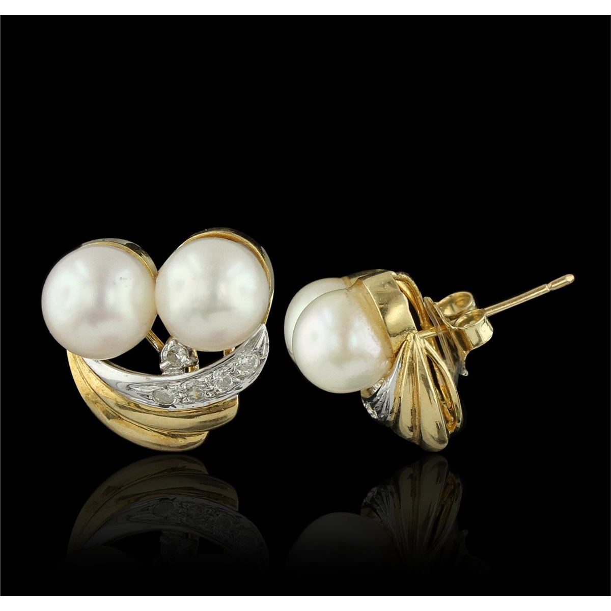 One pair of earrings featuring: 14KT Yellow Gold with a total weight of 6.40 grams, Pearl, and diamonds with a total weight of 0.08ctw.