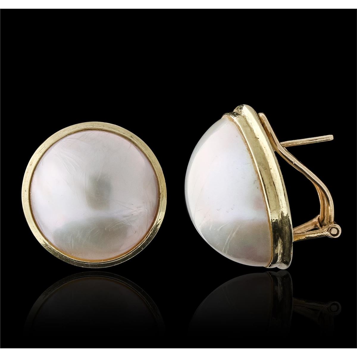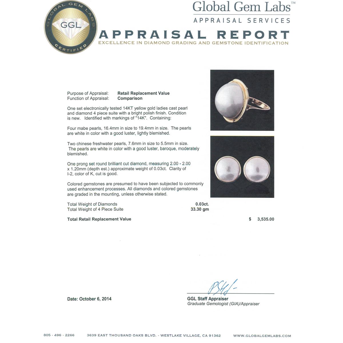 One set electronically tested 14KT yellow gold ladies cast pearl and diamond 4 piece suite with a bright polish finish. Identified with markings of "14K". Condition is new. Containing: Four mabe pearls, 16.4mm in size to 19.4mm in size. The pearls are white in color with a good luster, lightly blemished. Two Chinese freshwater pearls, 7.6mm in size to 5.5mm in size. The pearls are white in color with a good luster, baroque, moderately blemished. One prong set round brilliant cut diamond, measuring 2.00 - 2.00 x 1.20mm (depth est.) approximate weight of 0.03ct. Clarity: I-2. Color: K, Cut is Good. Colored gemstones are presumed to have been subjected to commonly used enhancement processes. All diamonds and colored gemstones are graded in the mounting, unless otherwise stated. Total Weight of Diamonds 0.03ct. Total Weight of 4 Piece Suite 33.30 grams. GGL Appraised at $3,535.00.
