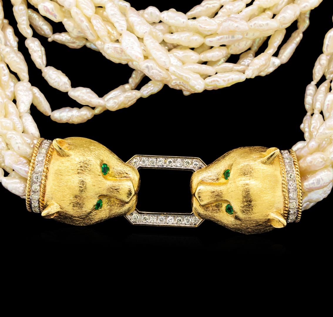 One electronically tested 14KT yellow gold ladies cast & assembled Keshi pearl and diamond necklace. Thirty five inch wearable length necklace features twelve Keshi pearl strands terminating in a stylized clasp. The clasp features mirroring panther heads with emerald accented eyes and diamond studded collars. Each panther is gripping a diamond set rectangular link. The clasp opens by pushing a lever under the head of one of the panthers. Bright polish finish with rhodium accents. Identified with markings of "14K 585". Condition is good. Containing: One twelve strand pearl necklace 35.0" unknotted, containing 124 keshi pearls, The pearls are cream rose' in color and exhibiting orient with a high luster, baroque with good uniformity Graded in the strand. A Keshi pearl, meaning "poppy seed" in Japanese, is a non-nucleated pearl formed by accidents as a by-product of the pearl culturing process. Keshi may form in either saltwater or freshwater pearls. They are generally small in size and their shapes vary widely. Due to their solid-nacre composition, Keshi come in a wide variety of colors, usually have high luster and orient. Thirty-Eight bead set round brilliant cut diamonds, measuring 1.60 - 1.50 x 0.93mm (depth est.) approximate total weight of 38 Stones = 0.61ct. Graded in the setting. Clarity: SI-1 to I-1. Color: H - J. Total Weight of Diamonds 0.61ct. Total Weight of Necklace158.31 grams. AIG Appraised at $15,700.00.