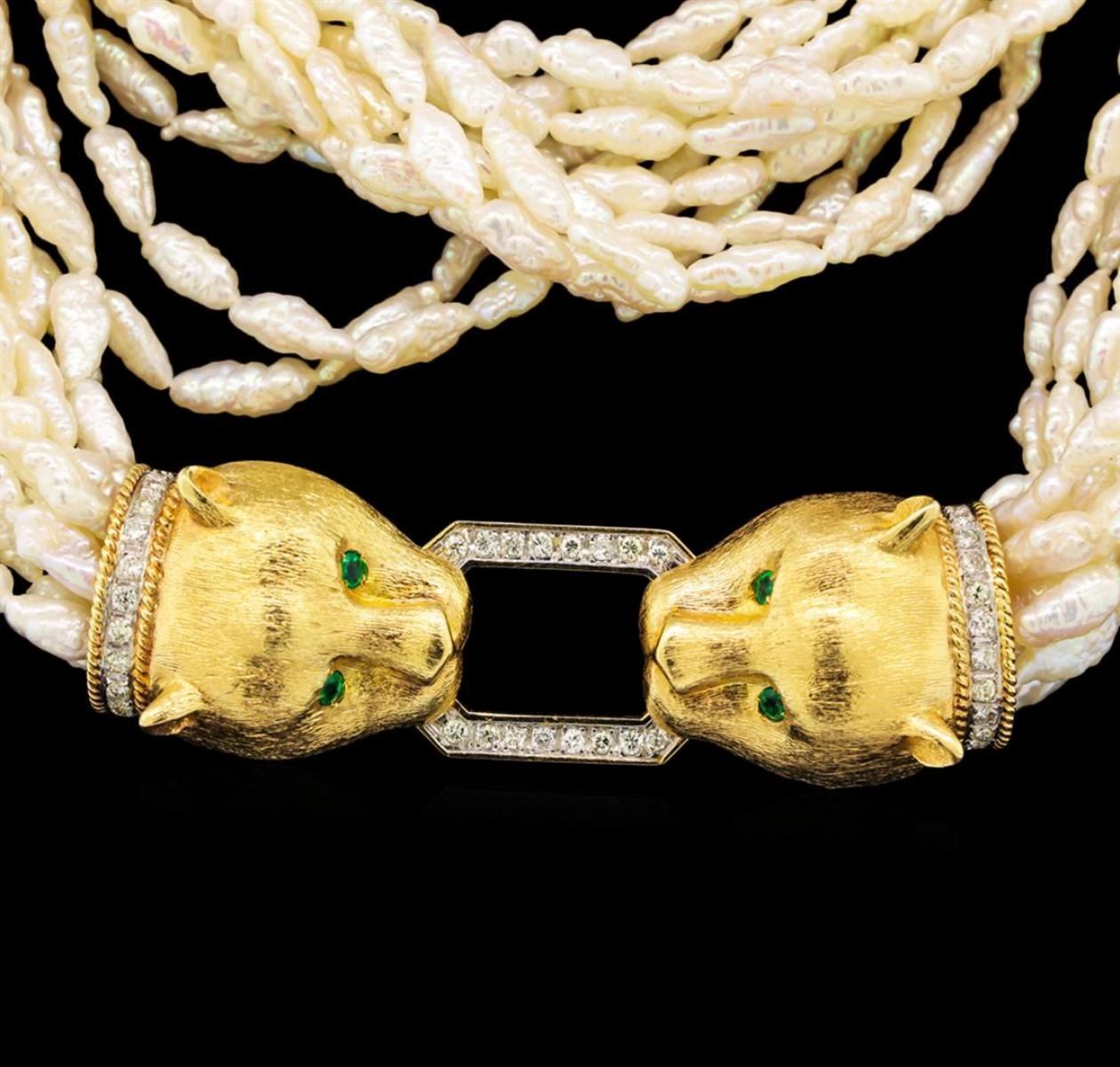 One electronically tested 14KT yellow gold ladies cast & assembled Keshi pearl and diamond necklace. Thirty five inch wearable length necklace features twelve Keshi pearl strands terminating in a stylized clasp. The clasp features mirroring panther heads with emerald accented eyes and diamond studded collars. Each panther is gripping a diamond set rectangular link. The clasp opens by pushing a lever under the head of one of the panthers. Bright polish finish with rhodium accents. Identified with markings of "14K 585". Condition is good. Containing: One twelve strand pearl necklace 35.0" unknotted, containing 124 keshi pearls, The pearls are cream rose' in color and exhibiting orient with a high luster, baroque with good uniformity Graded in the strand. A Keshi pearl, meaning "poppy seed" in Japanese, is a non-nucleated pearl formed by accidents as a by-product of the pearl culturing process. Keshi may form in either saltwater or freshwater pearls. They are generally small in size and their shapes vary widely. Due to their solid-nacre composition, Keshi come in a wide variety of colors, usually have high luster and orient. Thirty-Eight bead set round brilliant cut diamonds, measuring 1.60 - 1.50 x 0.93mm (depth est.) approximate total weight of 38 Stones = 0.61ct. Graded in the setting. Clarity: SI-1 to I-1. Color: H - J. Total Weight of Diamonds 0.61ct. Total Weight of Necklace158.31 grams. AIG Appraised.