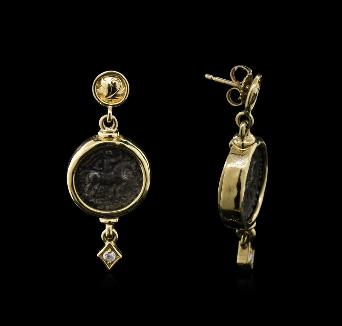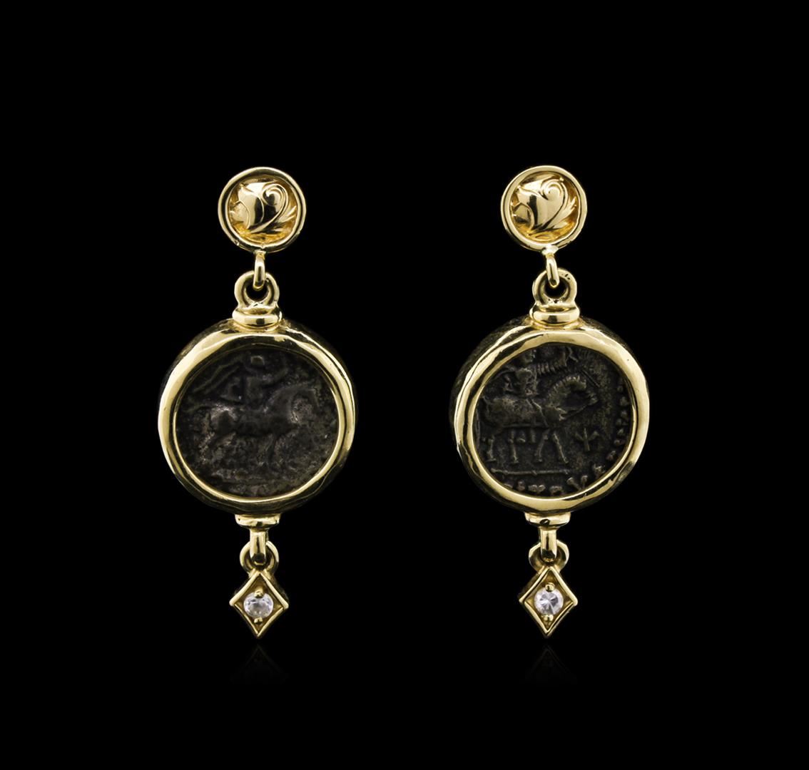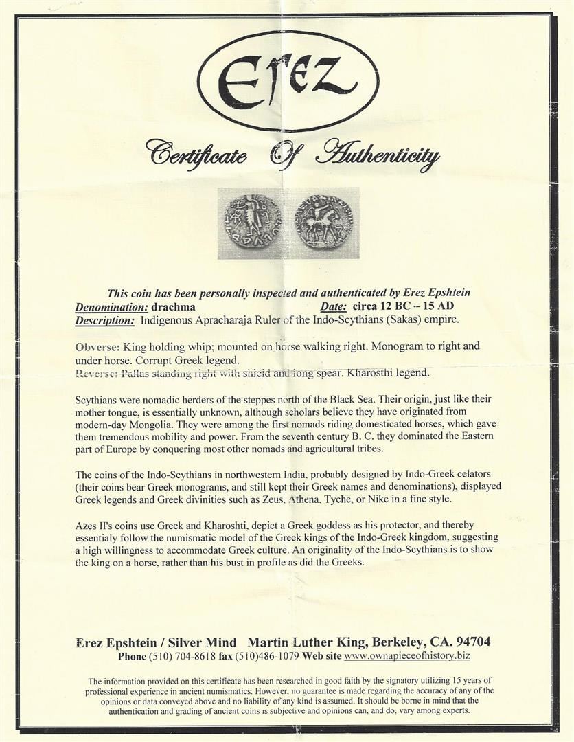 11.3 grams total weight; Rare & unique! Comes with Certificate of Authenticity; Coin Info: Denomination: Drachma; Date: circa 12 BC - 15 AD; Description: Indigenous Apracharaja Ruler of the Indo-Scythians (Sakas) empire; Obverse: King holding whip; mounted on horse walking right. Monogram to right and under horse. Corrupt Greek legend; Reverse: Pallas standing right with shield and long spear. Kharosthi legend. Contain two diamonds.