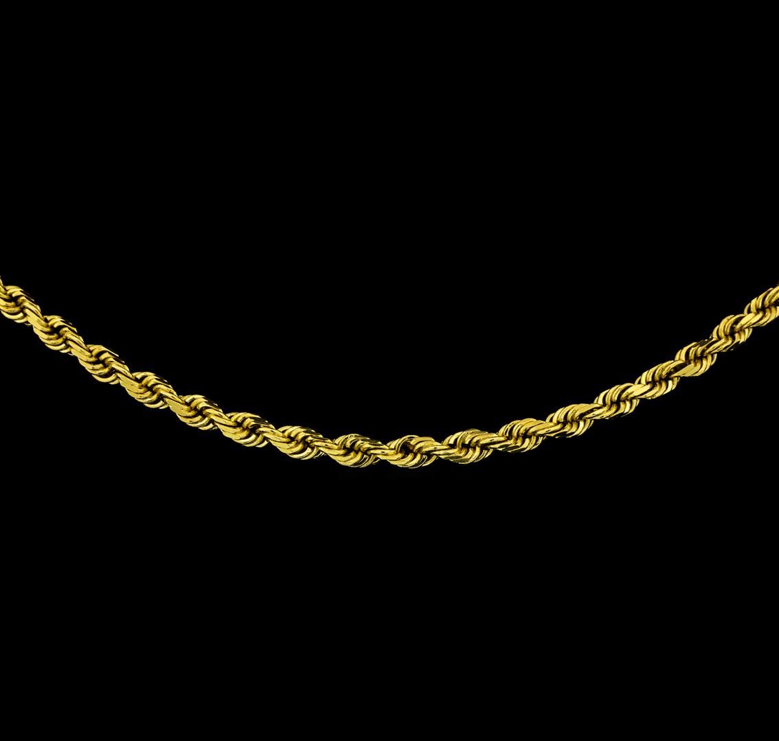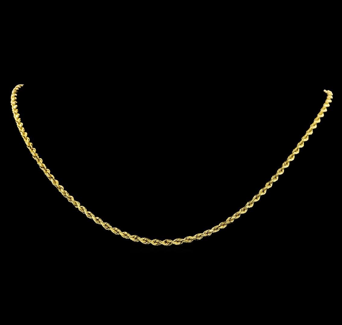 One twenty inch rope chain featuring: 14KT yellow gold weighing 15.14 grams.