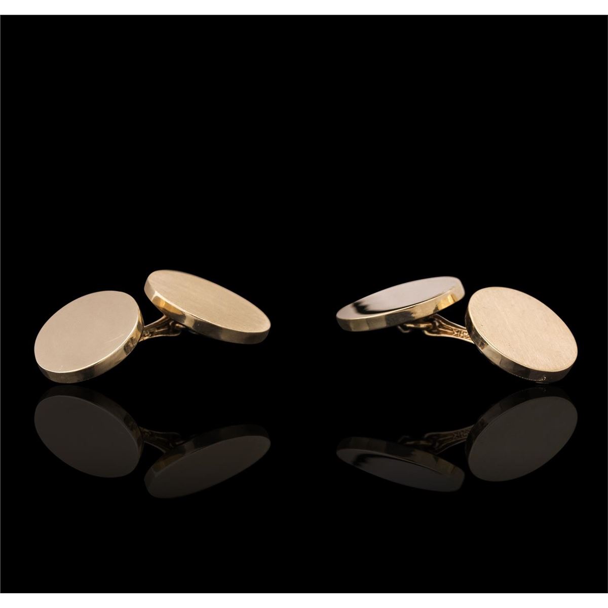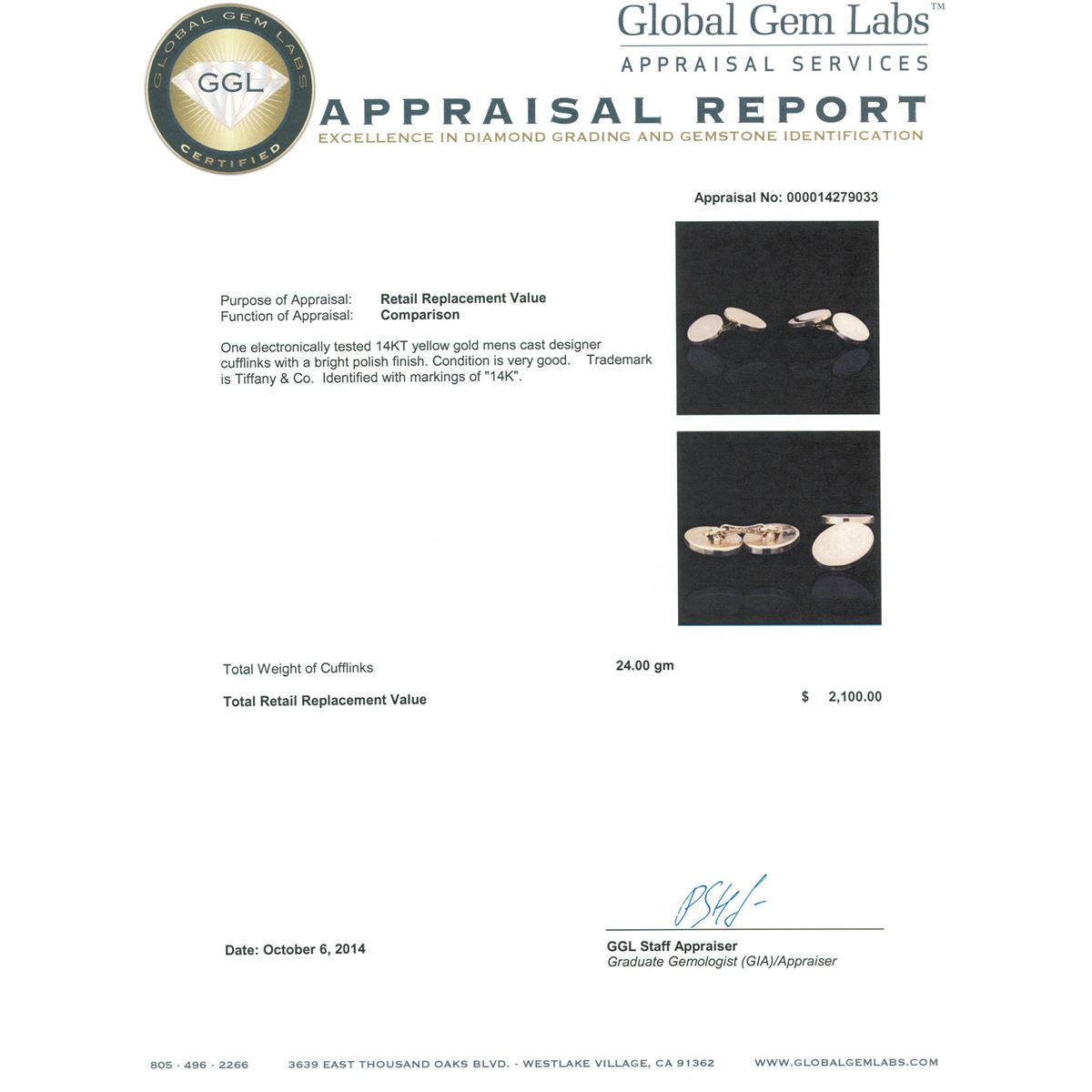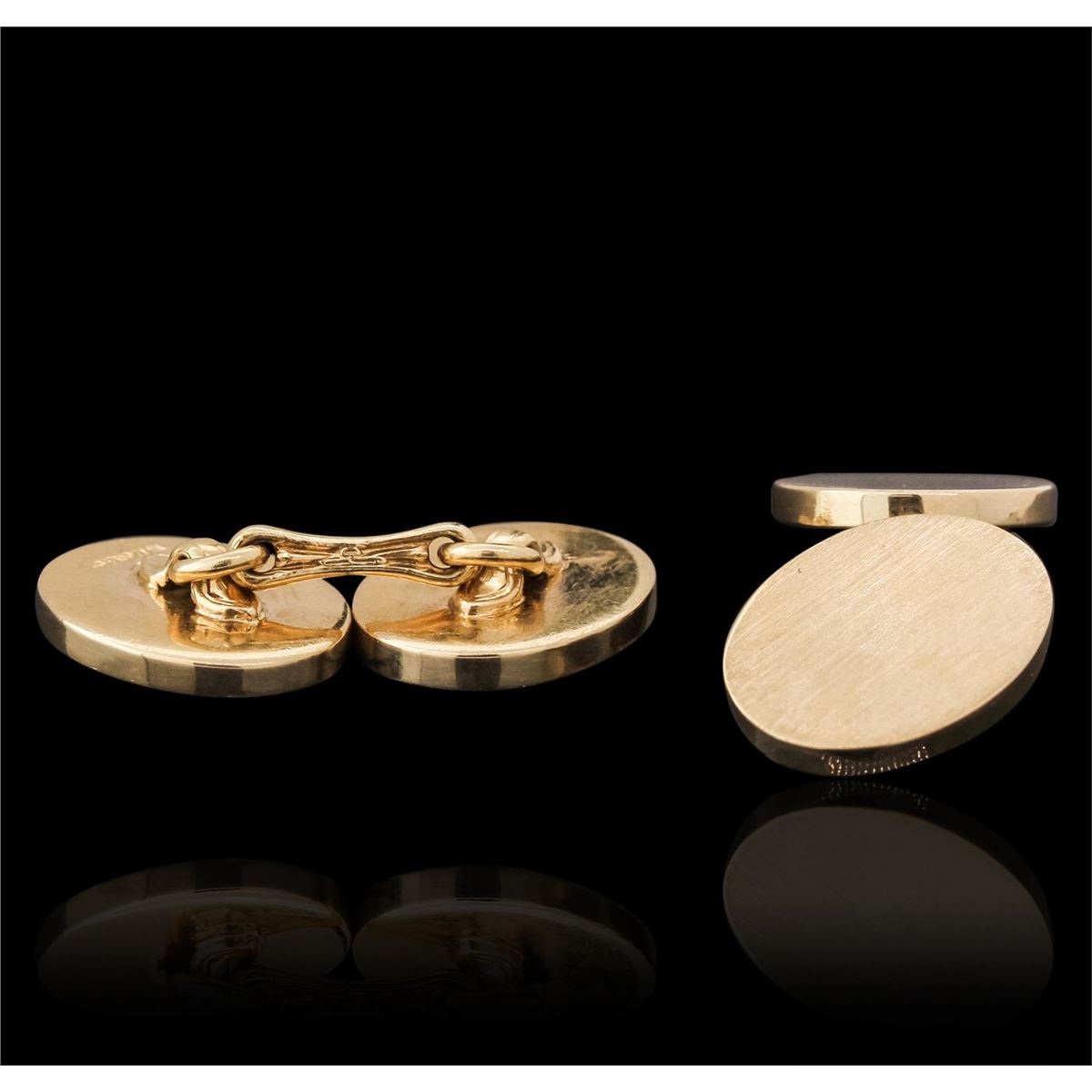 One electronically tested 14KT yellow gold mens cast designer cufflinks with a bright polish finish. Trademark is Tiffany & Co. Identified with markings of "14K". Condition is very good. Total Weight of Cufflinks 24.00 grams. GGL Appraised at $2,100.00.