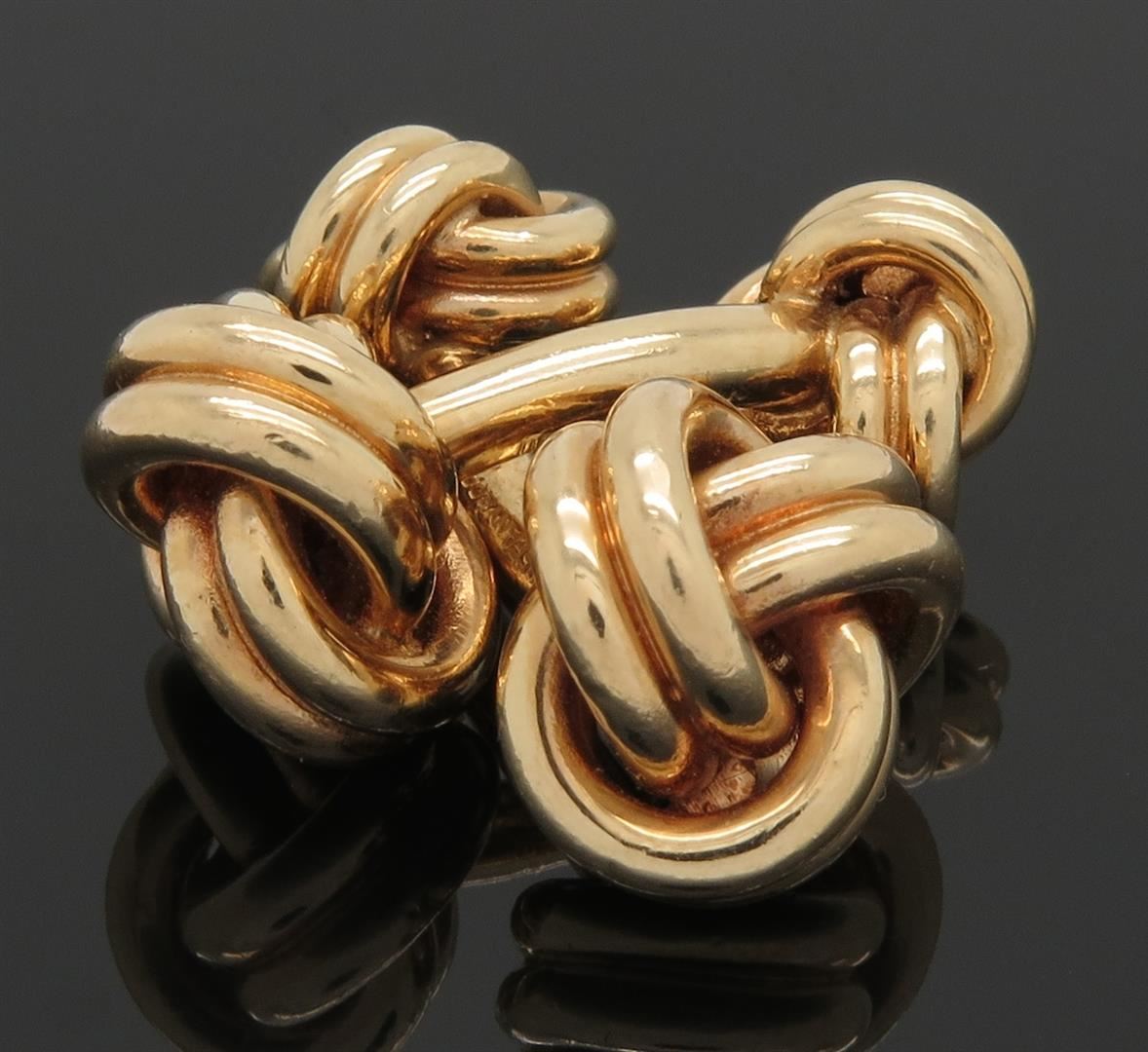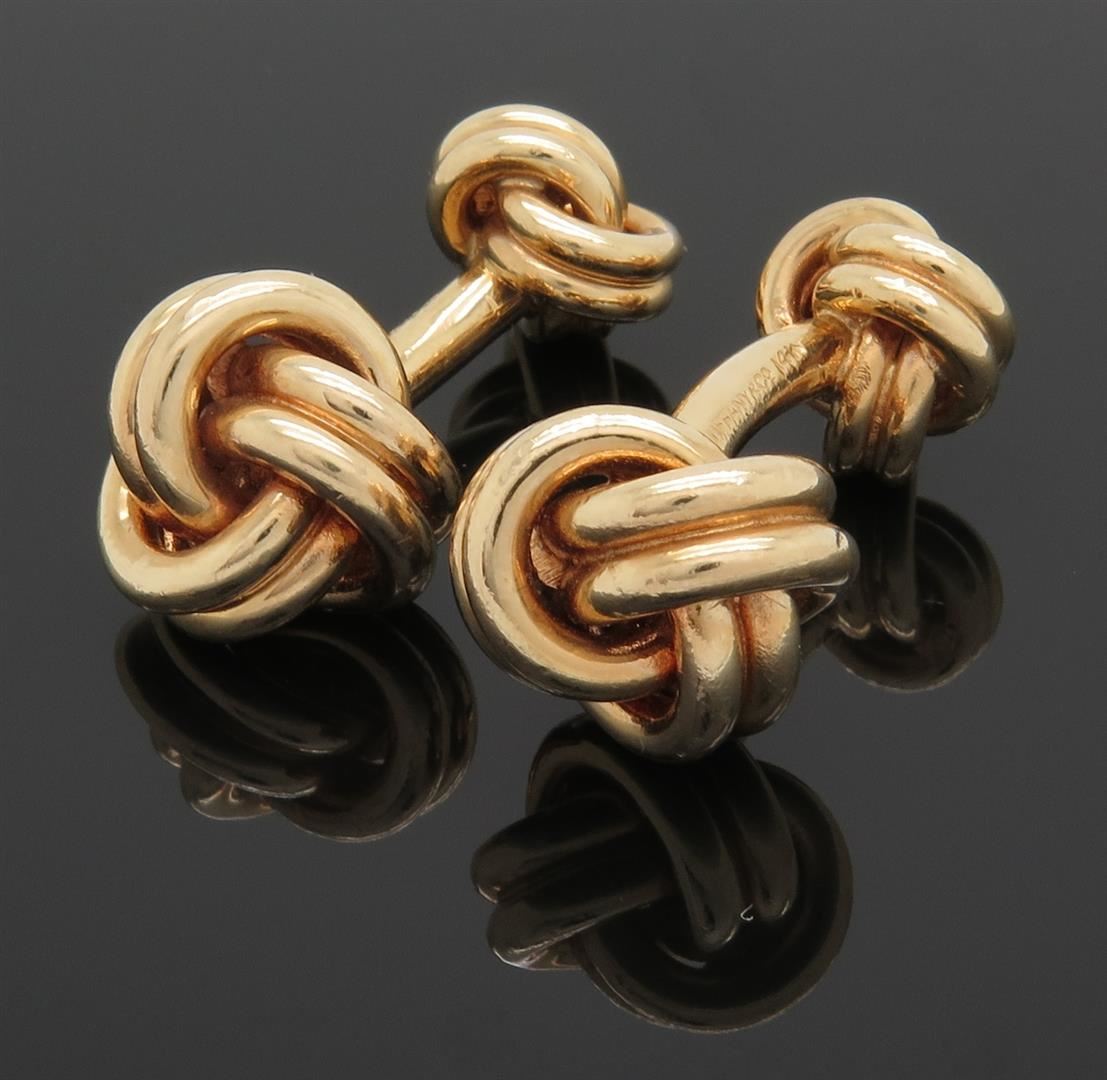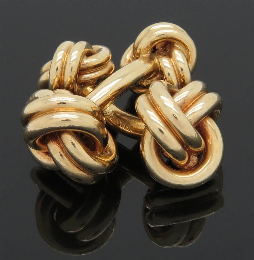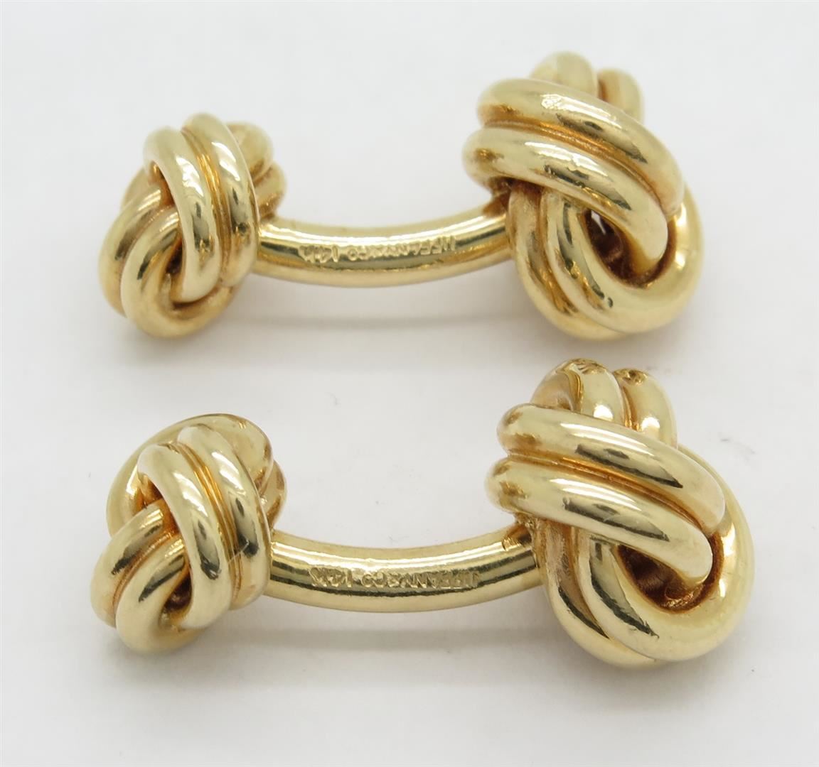 Two tested 14K yellow gold designer Tiffany & Co. cuff links. Size: 1 1/8", Weight: 22 grams. Original box included.