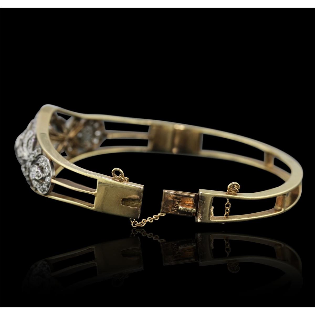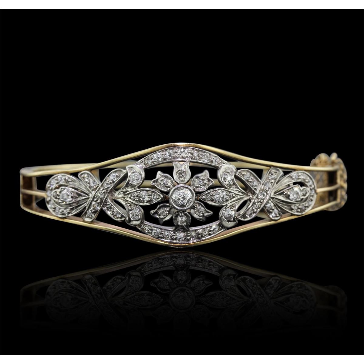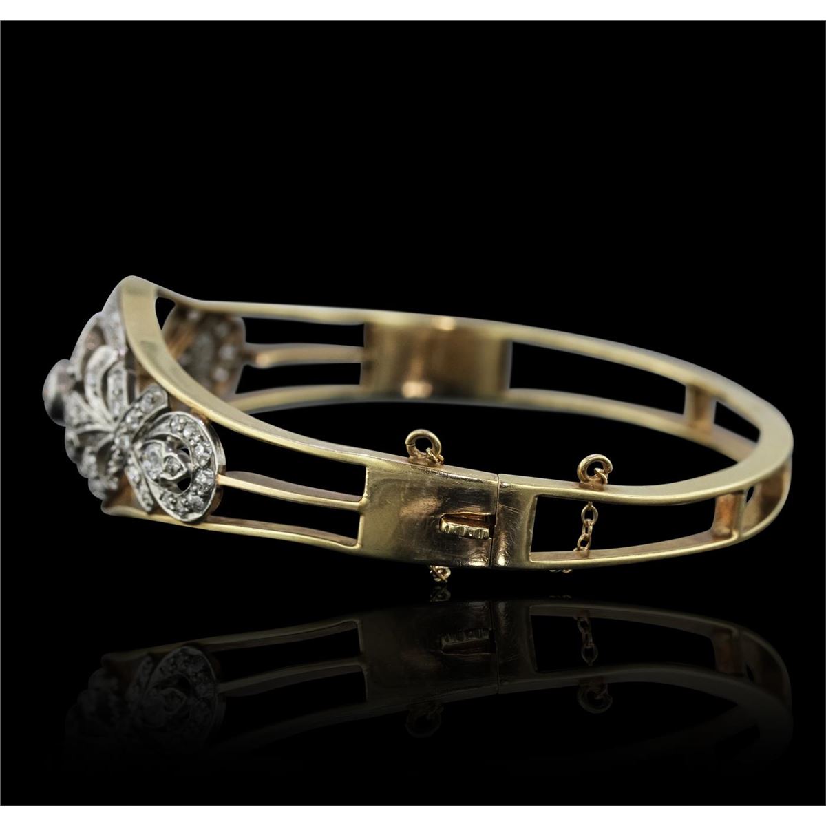 One electronically tested 14KT yellow and white gold ladies cast & assembled diamond bangle bracelet with a bright polish finish. Condition is good. Six and one-half inch wearable length bangle bracelet features a diamond set lattice gallery supported by a hinged shoulder, terminating in a concealed clasp with safety chain. Identified with markings of "14K". Containing: One bezel set Old European cut diamond, measuring 3.80 - 3.70 x 2.50mm (depth est.) approximate weight of 0.25ct. Cutting style circa late 19th century. Graded in the setting. Clarity: SI-1. Color: I Eight bead set Old European cut diamonds, measuring 2.90 - 2.50 x 1.67mm (depth est.) approximate. Total Weight of 8 Stones = 0.69ct. Cutting style circa late 19th century. Graded in the setting. Clarity: VS-2 to SI-1. Color: I - J Fifty-Eight bead set Old European cut diamonds, measuring 1.70 - 1.50 x 0.99mm (depth est.) approximate. Total Weight of 58 Stones = 0.99ct. Cutting style circa late 19th century. Graded in the setting. Clarity: VS-2 to SI-2. Color: H - J. Total Weight of Diamonds 1.93ct. Total Weight of Bangle Bracelet 20.70 grams. AIG Appraised at $9,365.00.