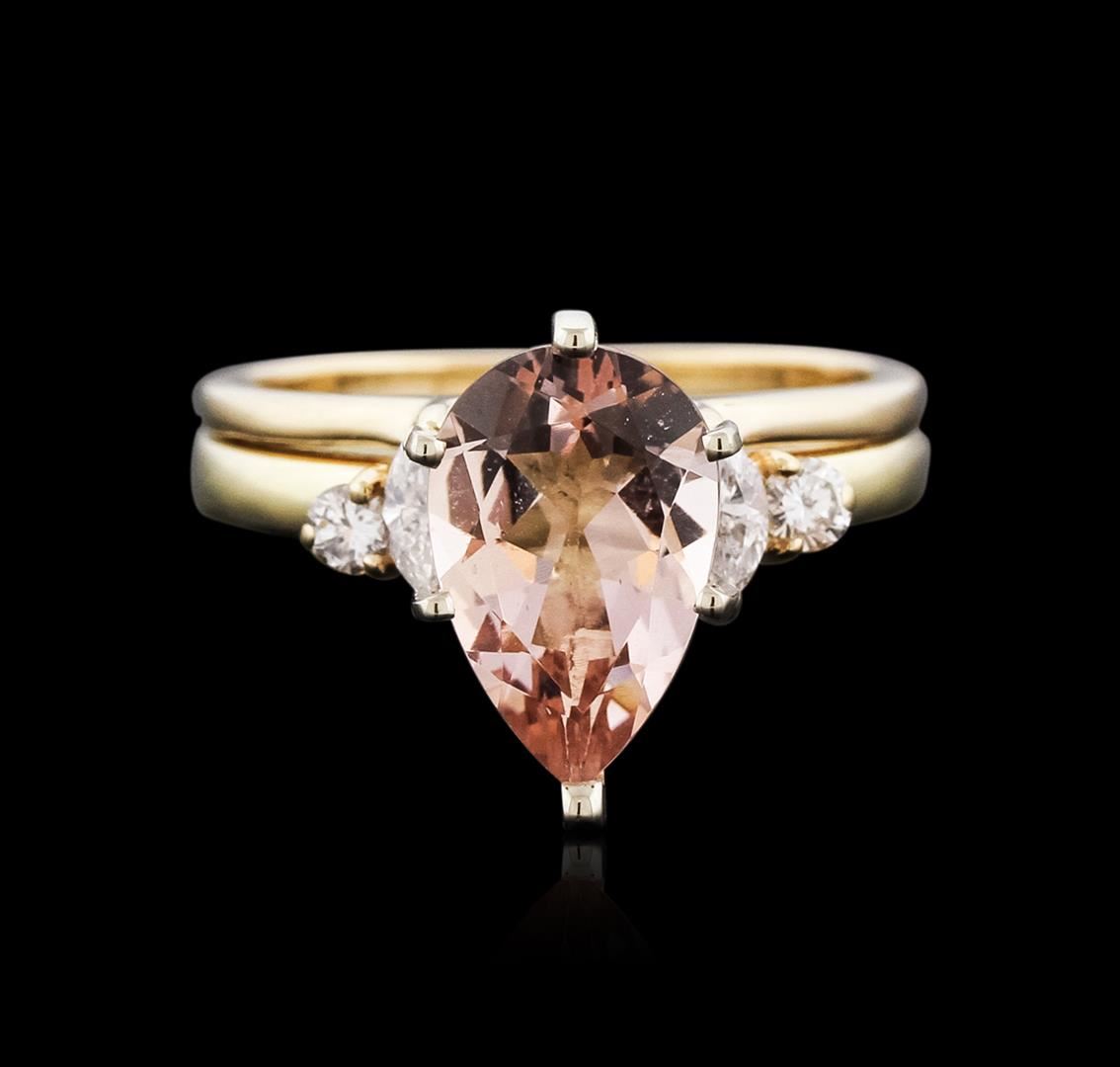 One ring featuring: 14KT yellow and white gold weighing 4.3 grams containing one pear cut morganite center weighing 2.21ct and diamonds weighing a total of 0.20ct.