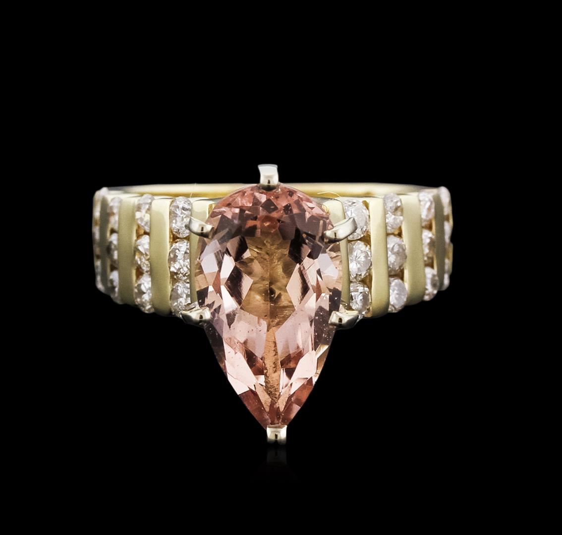 One ring featuring: 14KT yellow and white gold weighing 6.17 grams containing one pear cut morganite center weighing 3.18ct and round diamonds weighing a total of 0.50ct.