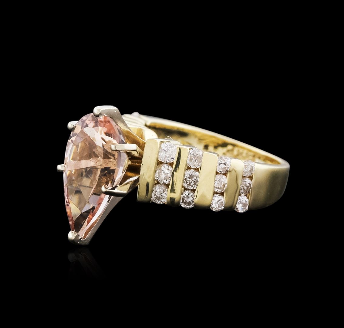 One ring featuring: 14KT yellow and white gold weighing 6.17 grams containing one pear cut morganite center weighing 3.18ct and round diamonds weighing a total of 0.50ct.