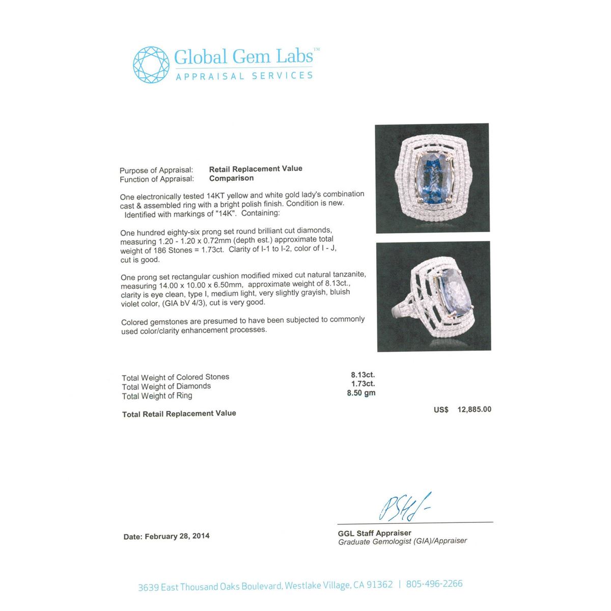 One electronically tested 14KT yellow and white gold Ladies combination cast & assembled ring with a bright polish finish. Condition is new. Identified with markings of "14K". Containing: One Hundred Eighty-Six prong set round brilliant cut diamonds, measuring 1.20 - 1.20 x 0.72mm (depth est.) approximate. Total Weight of 186 Stones = 1.73ct. Clarity: I-1 to I-2. Color: I - J, Cut is Good. One prong set rectangular cushion modified mixed cut natural tanzanite, measuring 14.00 x 10.00 x 6.50mm, approximate weight of 8.13ct., clarity is eye clean, type I, medium light, very slightly grayish, bluish violet color, (GIA bV 4/3), cut is very good. Colored gemstones are presumed to have been subjected to commonly used color/clarity enhancement processes. Total Weight of Colored Stones 8.13ct. Total Weight of Diamonds 1.73ct. Total Weight of Ring 8.50 grams. GGL Appraised at $12,885.00.