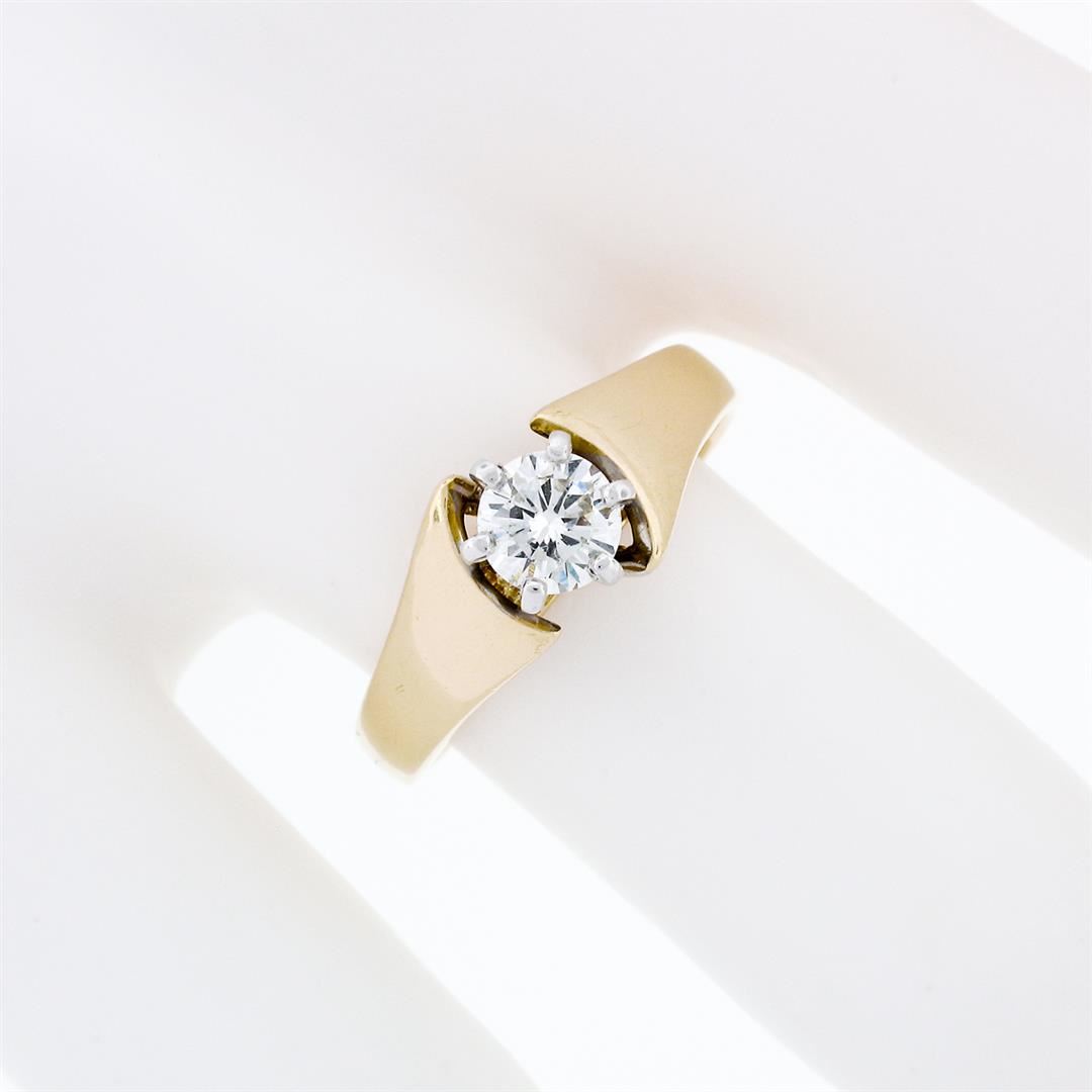 A two tone solid 14k gold solitaire engagement ring with 1 ideal round brilliant cut natural diamond (H - VS1; 0.47ct). The ring is size 6.0, weighs a total of 3.86 grams, and measures 7.62mm wide.