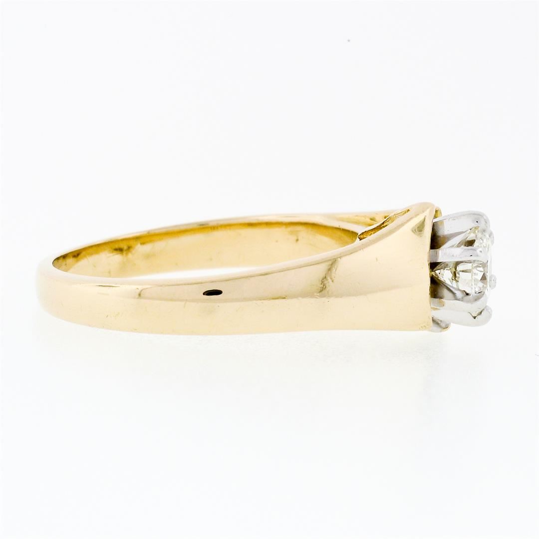 A two tone solid 14k gold solitaire engagement ring with 1 ideal round brilliant cut natural diamond (H - VS1; 0.47ct). The ring is size 6.0, weighs a total of 3.86 grams, and measures 7.62mm wide.
