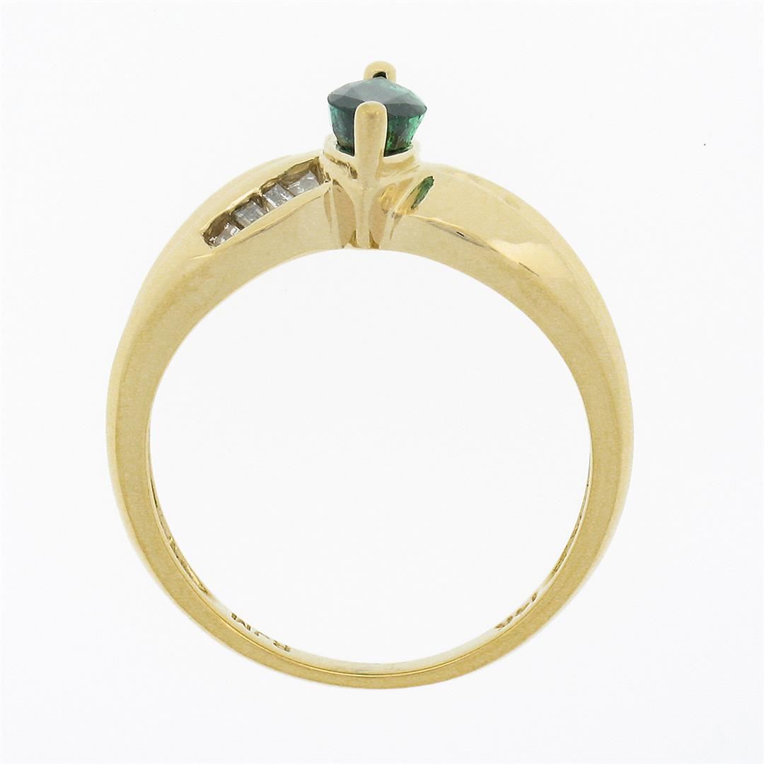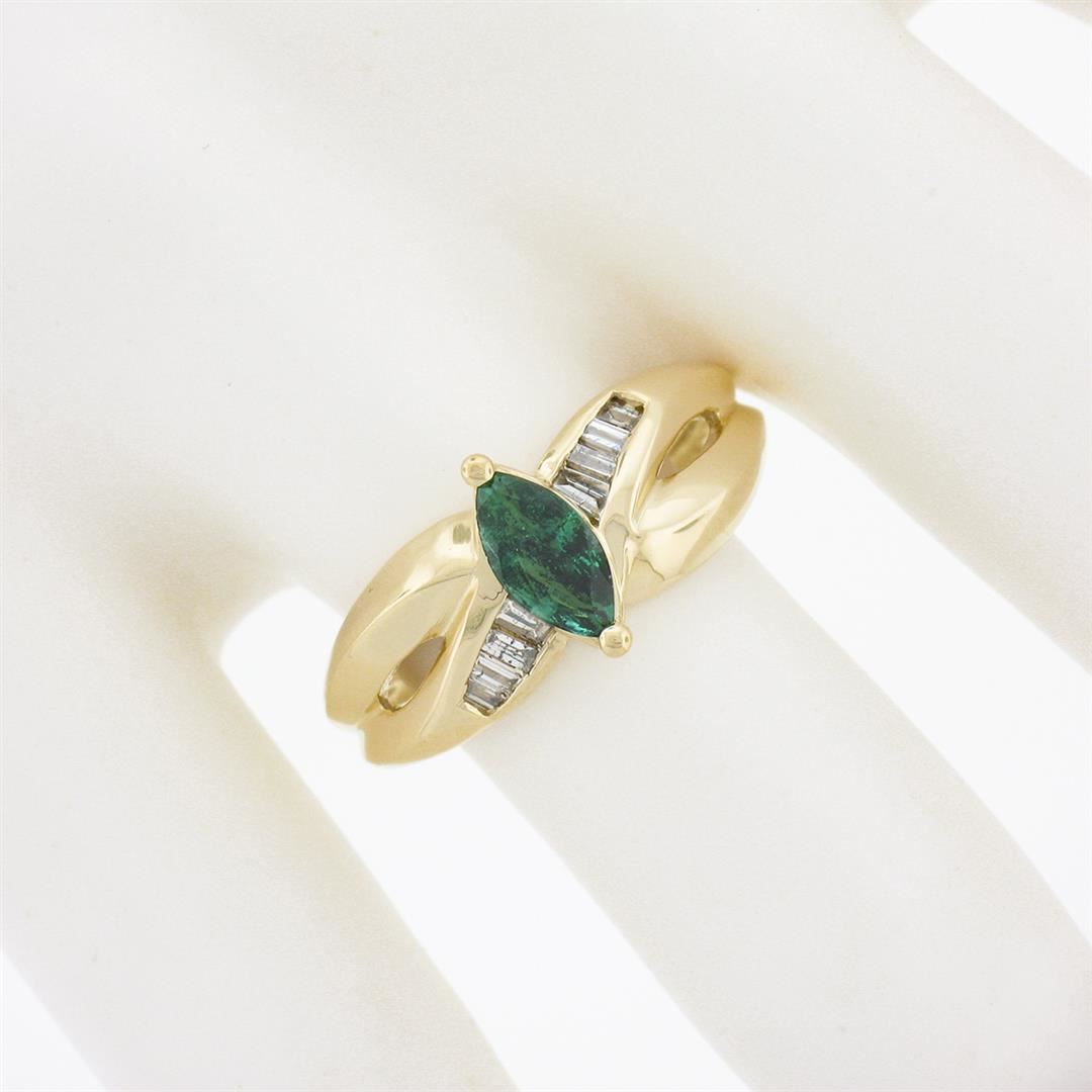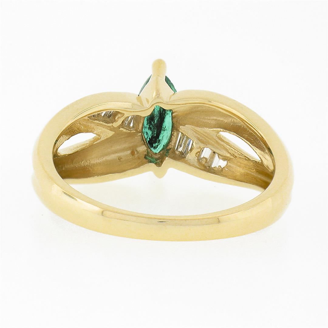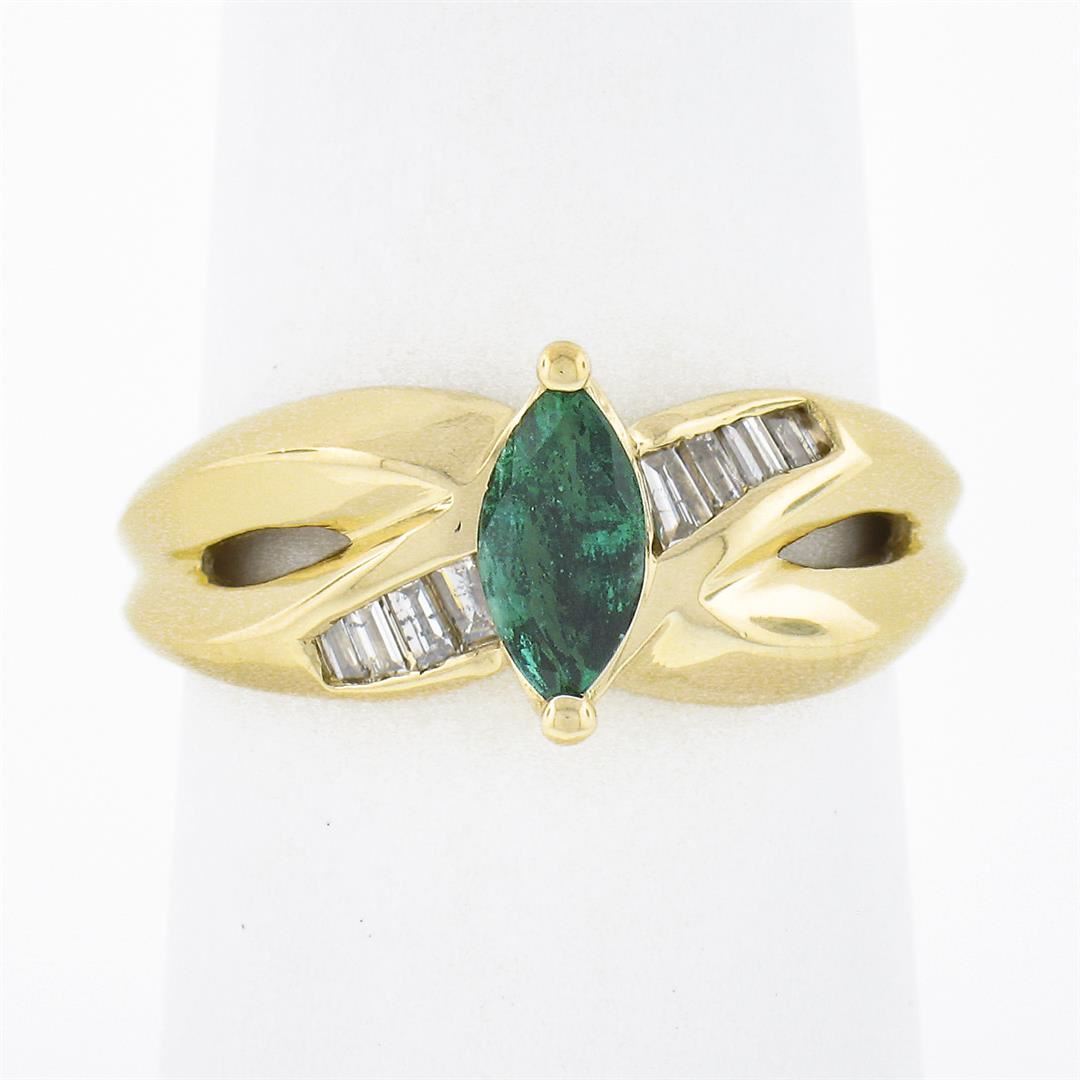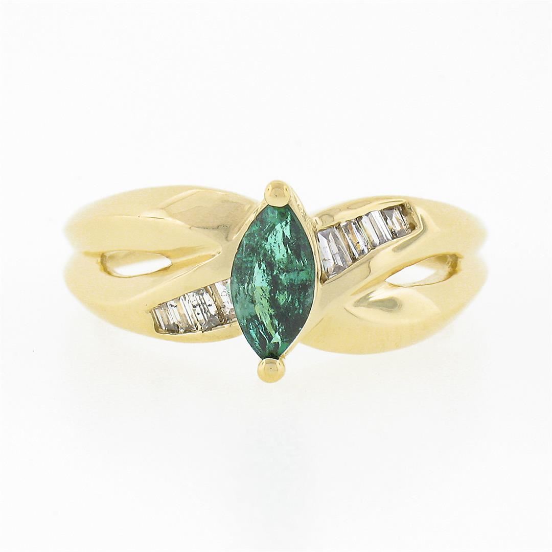A solid 14k yellow gold ring, with 1 marquise cut natural emerald (7.2x3.8mm - 0.50ct), and 8 baguette cut natural diamonds (G/H - SI1/SI2 ; 0.16ctw). The ring is size 7.0, weighs a total of 3.65 grams, and measures 9.30mm wide.