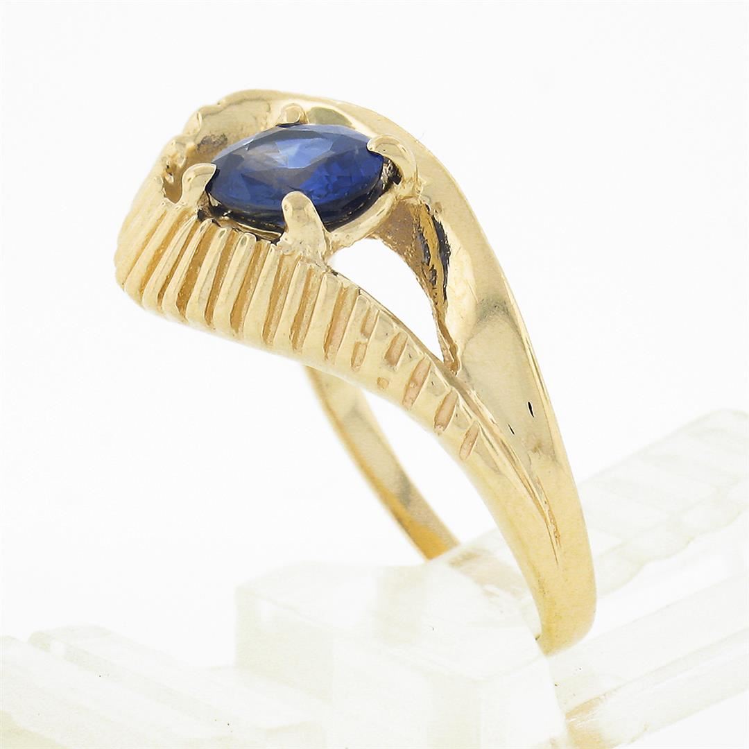 A solid 14k yellow gold ring, with 1 oval cut natural sapphire (0.80ct). The ring is size 4.0, weighs a total of 3.78 grams, and measures 11.90mm wide.