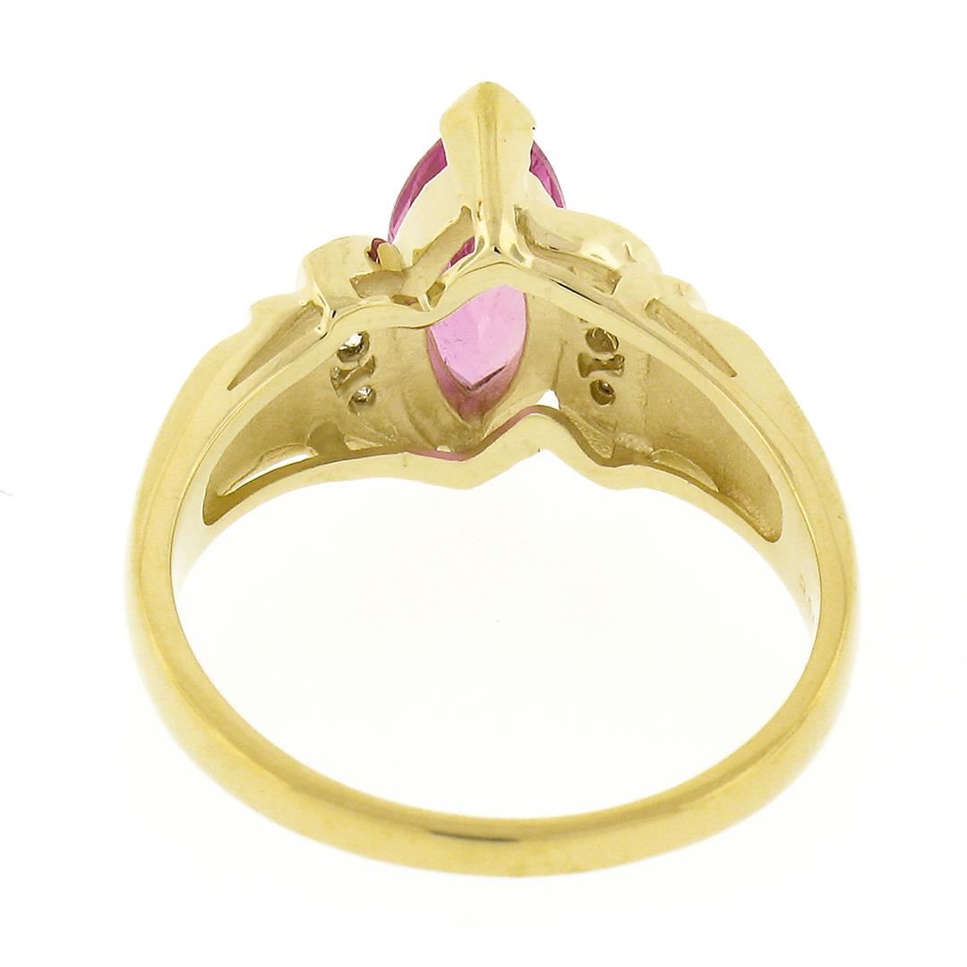 A solid 14k yellow gold ring, with 1 marquise cut natural tourmaline (10x5mm - 0.90ct), accented with 6 round brilliant cut natural diamonds (G/H - VS1/VS2 ; 0.10ctw). The ring is size 6.5, weighs a total of 4.46 grams, and measures 11.35mm wide.