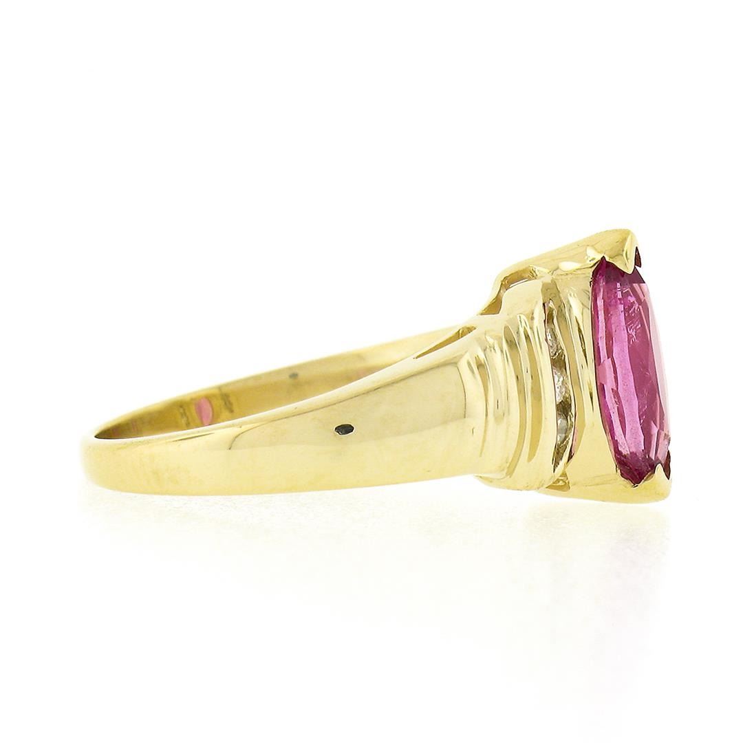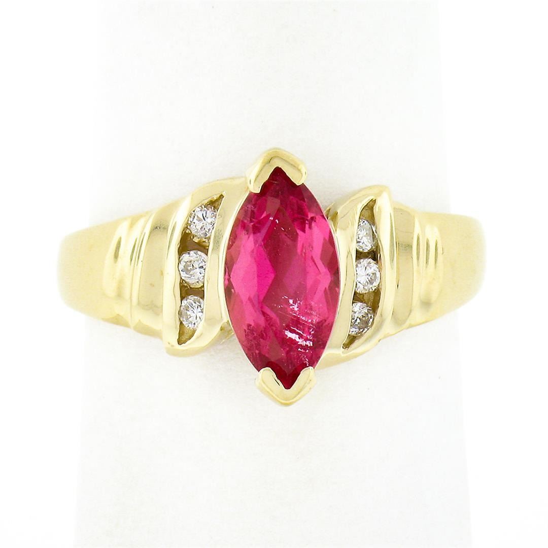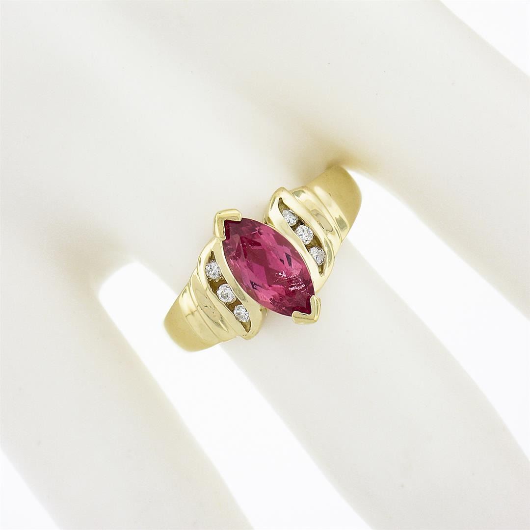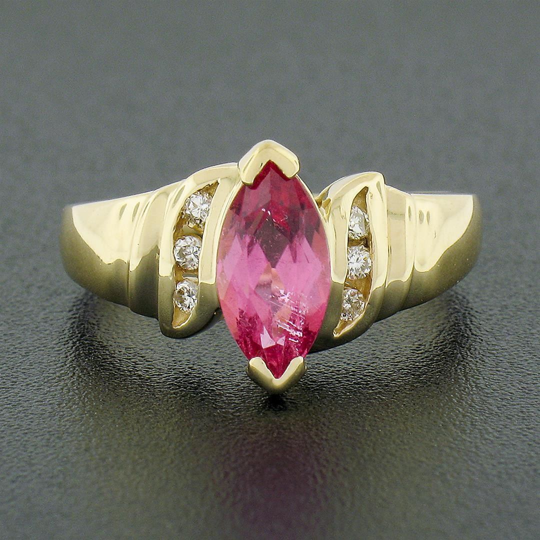 A solid 14k yellow gold ring, with 1 marquise cut natural tourmaline (10x5mm - 0.90ct), accented with 6 round brilliant cut natural diamonds (G/H - VS1/VS2 ; 0.10ctw). The ring is size 6.5, weighs a total of 4.46 grams, and measures 11.35mm wide.