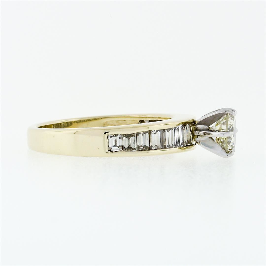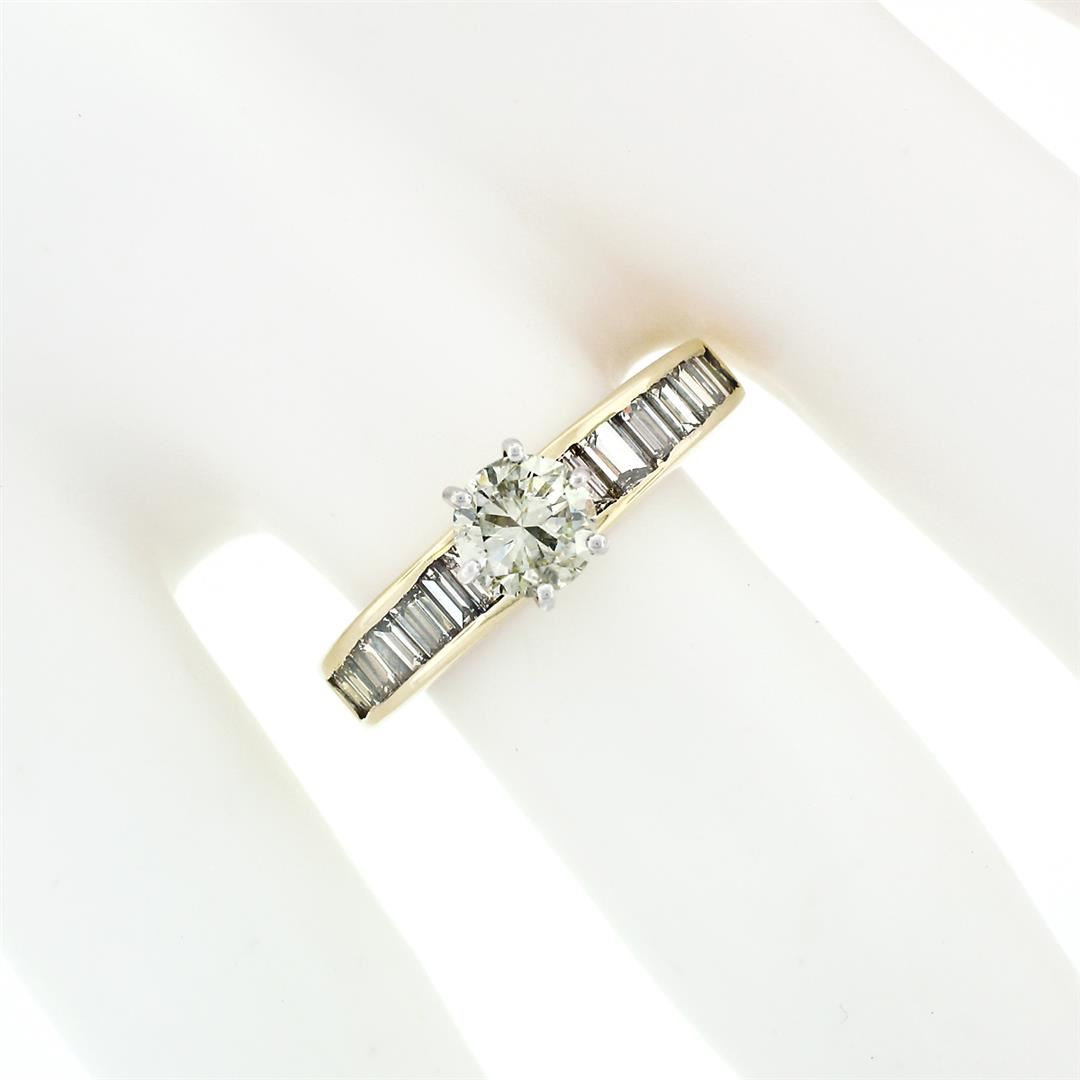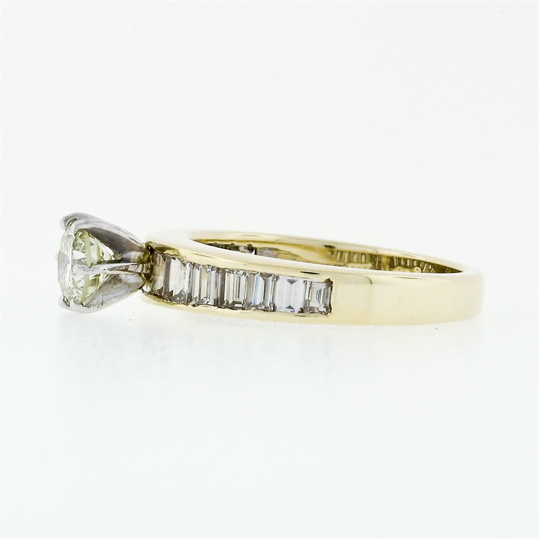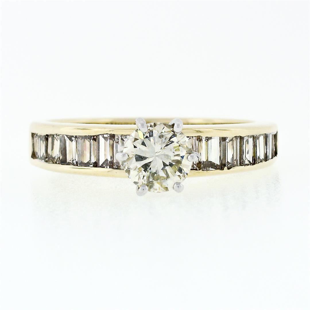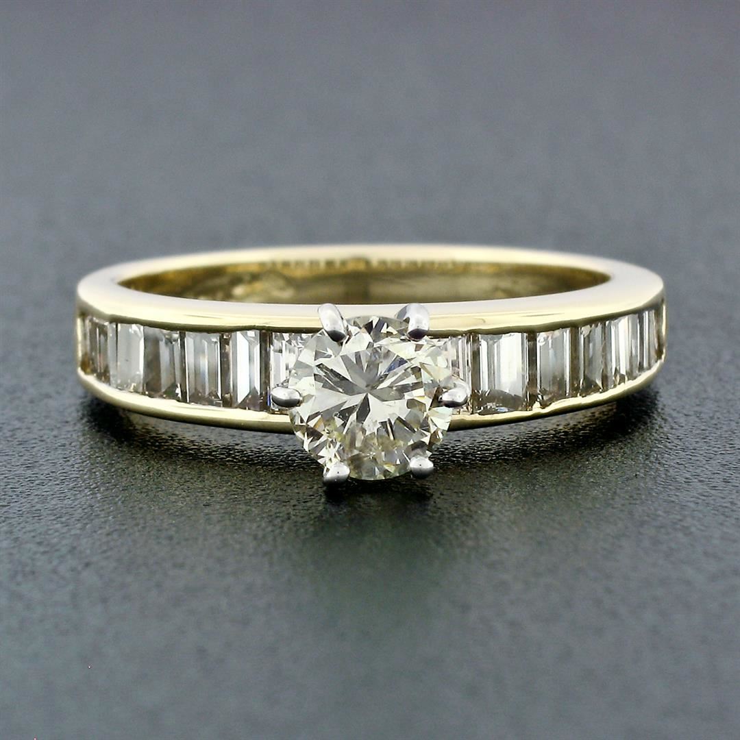 An estate solid 14k yellow gold solitaire ring, with 1 round brilliant cut natural diamond (J - SI2 : 0.64ct), accented with 14 straight baguette cut natural diamonds ( I/J - VS1/VS2 ; 0.78ctw). The ring is size 6.5, weighs a total of 4.91 grams, and measures 6mm wide.