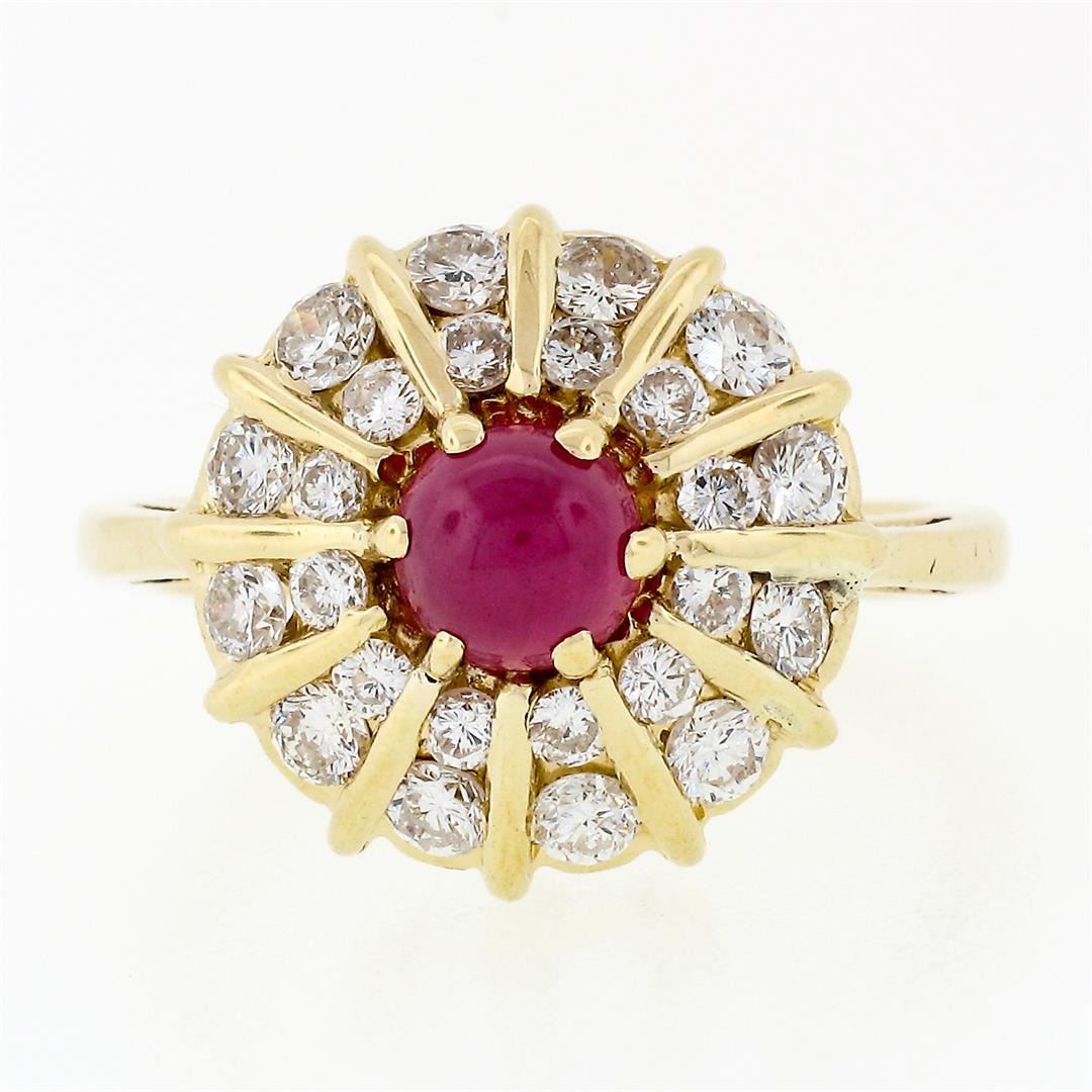 A solid 14k yellow gold platter ring, with 1 round cabochon cut natural ruby (5.2mm - 0.83ct), surrounded with 24 round brilliant cut natural diamonds (F/G - VS1/VS2; 0.84ctw). The ring is size 6.0, weighs a total of 5.73 grams, and measures 15mm wide.