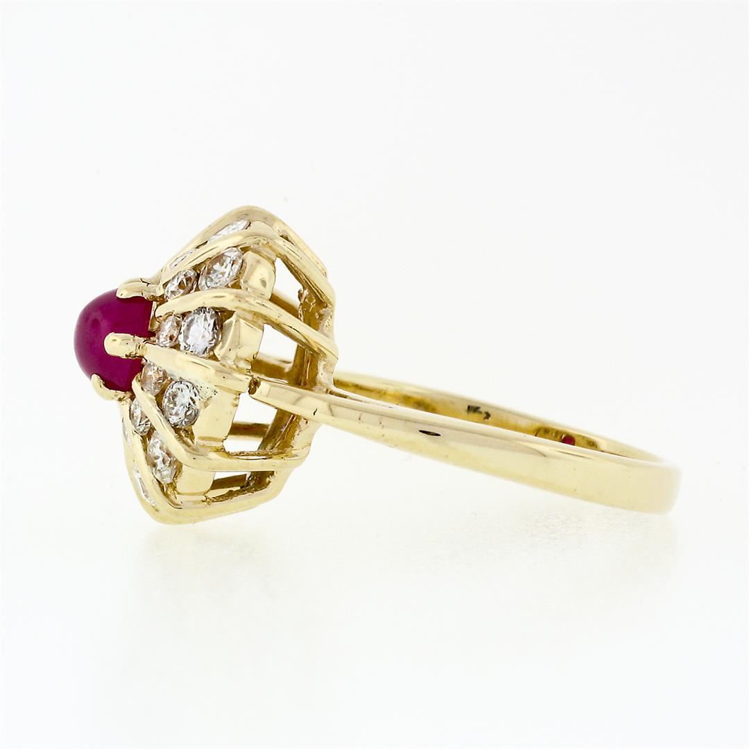 A solid 14k yellow gold platter ring, with 1 round cabochon cut natural ruby (5.2mm - 0.83ct), surrounded with 24 round brilliant cut natural diamonds (F/G - VS1/VS2; 0.84ctw). The ring is size 6.0, weighs a total of 5.73 grams, and measures 15mm wide.