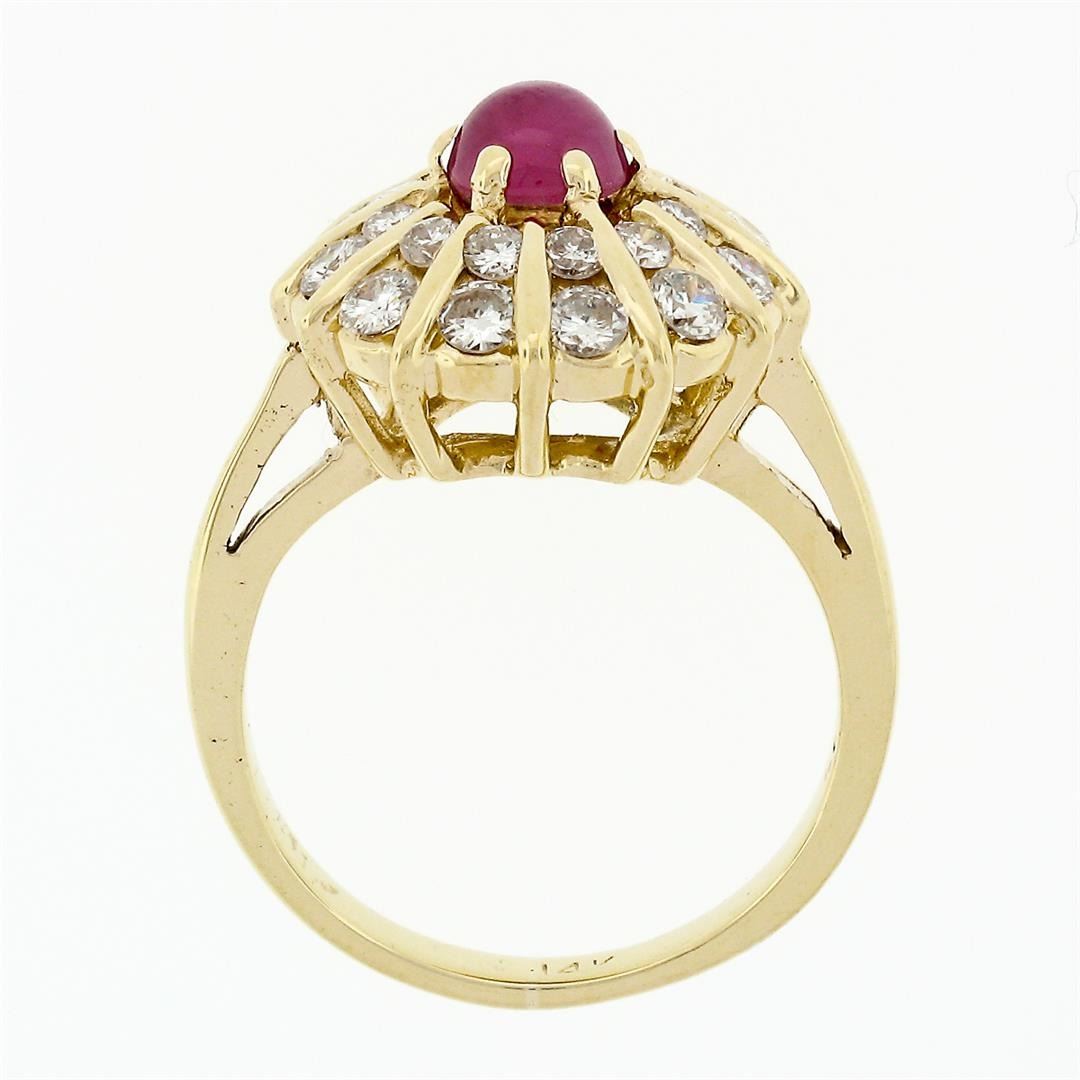 A solid 14k yellow gold platter ring, with 1 round cabochon cut natural ruby (5.2mm - 0.83ct), surrounded with 24 round brilliant cut natural diamonds (F/G - VS1/VS2; 0.84ctw). The ring is size 6.0, weighs a total of 5.73 grams, and measures 15mm wide.