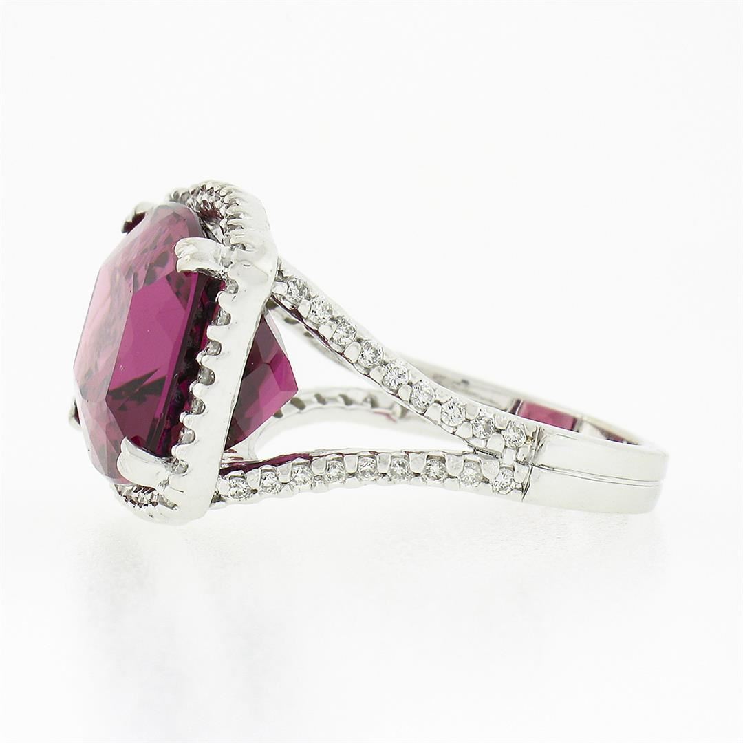 A solid 14k white gold cocktail ring, with 1 Gia certified cushion cut natural tourmaline (12.75ct), and a halo of 90 round brilliant cut natural diamonds (G/H - VS1/VS2 ; 1.00ctw). The ring is size 6.5, weighs a total of 7.76 grams, and measures 15.50mm