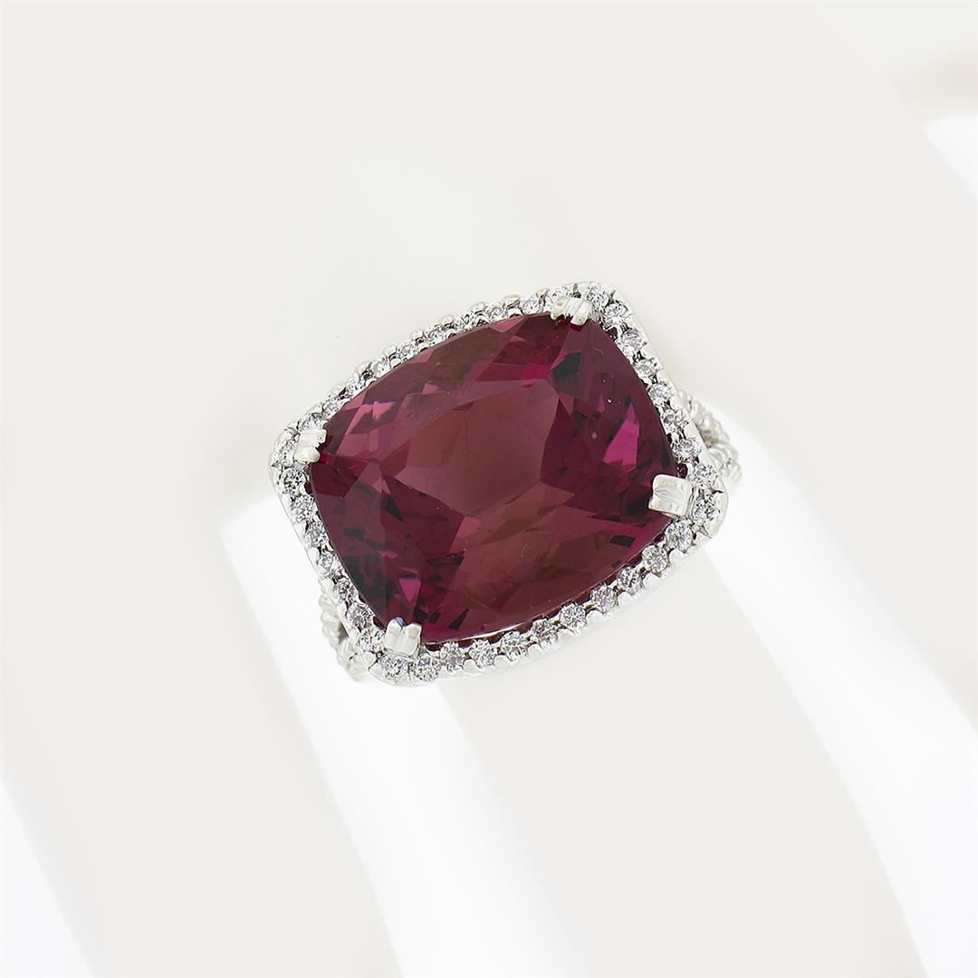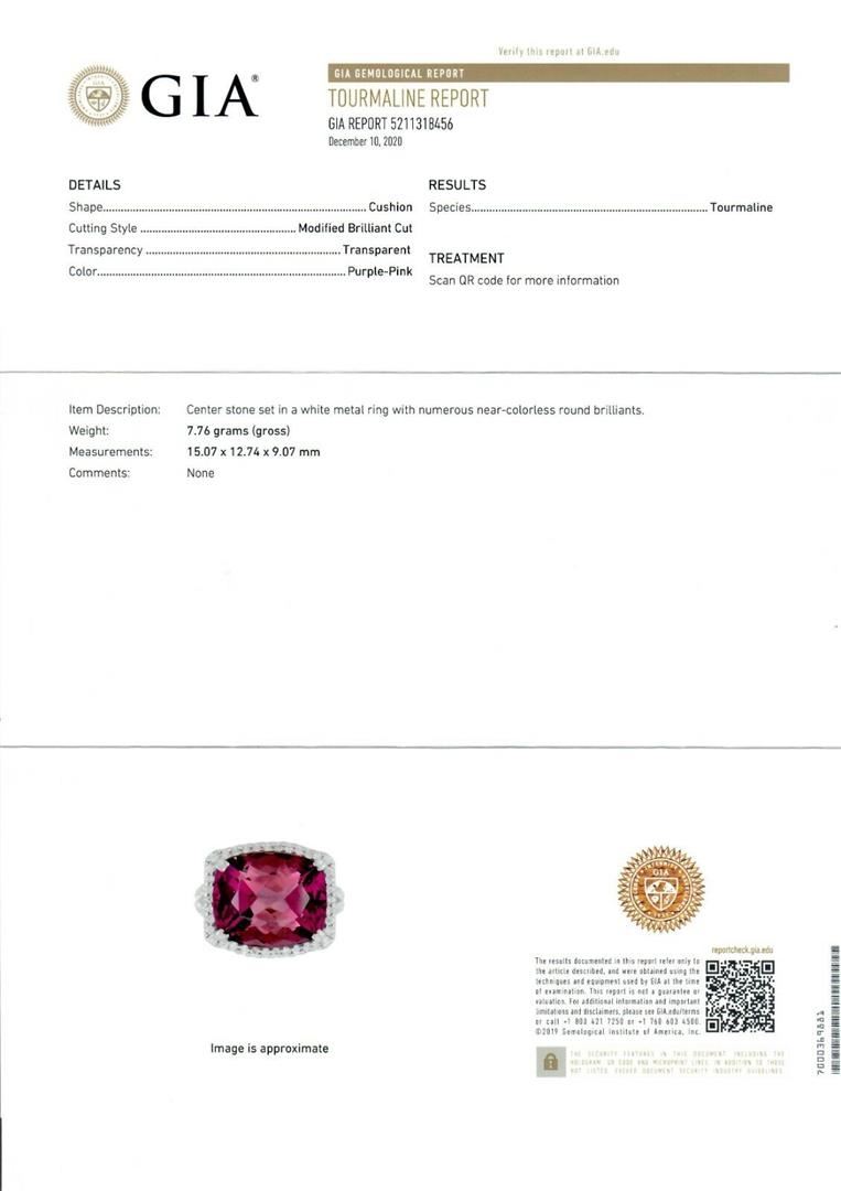A solid 14k white gold cocktail ring, with 1 Gia certified cushion cut natural tourmaline (12.75ct), and a halo of 90 round brilliant cut natural diamonds (G/H - VS1/VS2 ; 1.00ctw). The ring is size 6.5, weighs a total of 7.76 grams, and measures 15.50mm