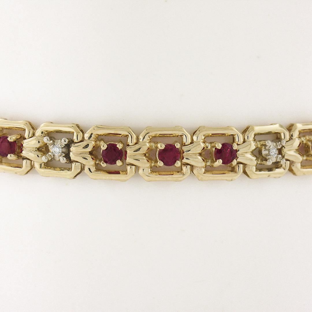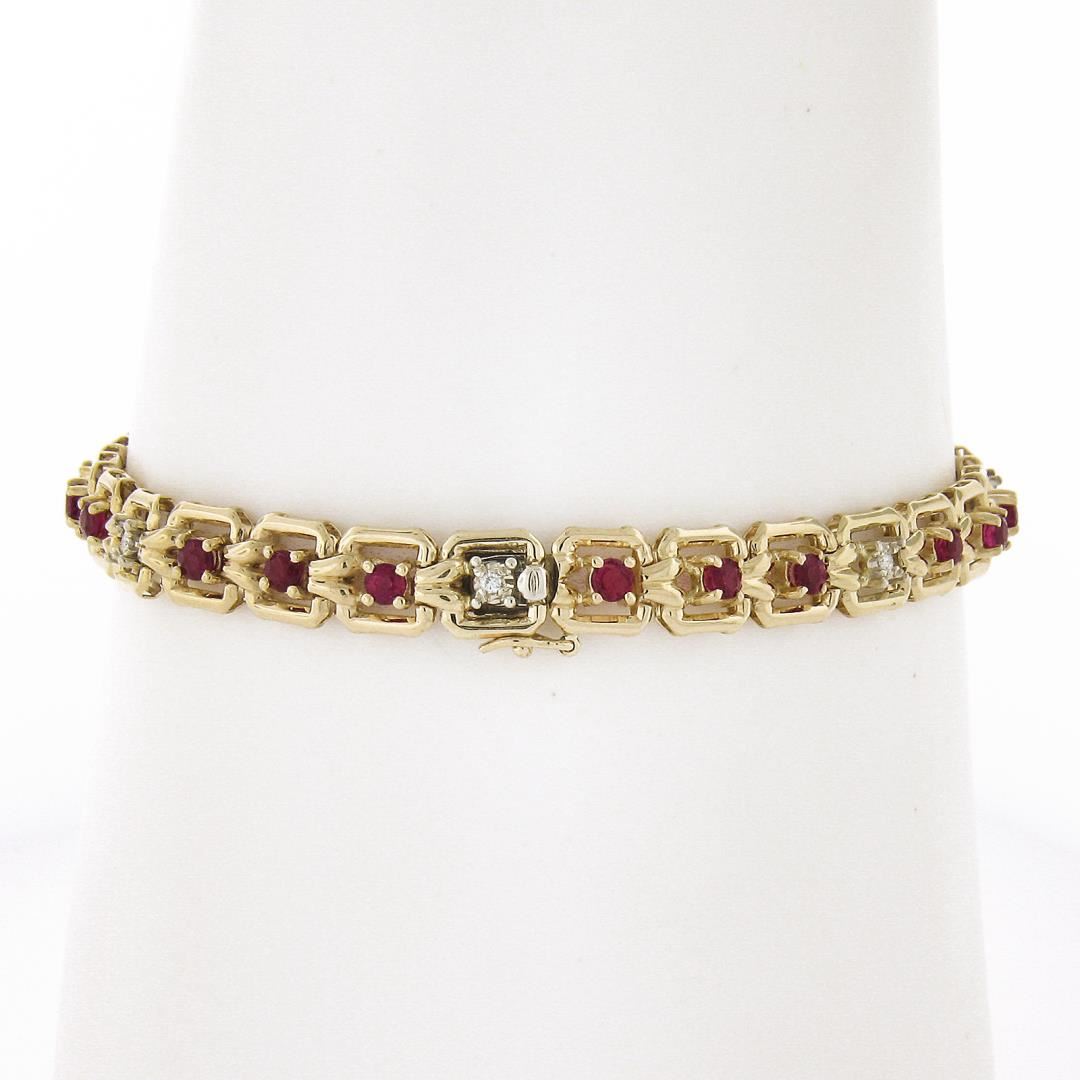 A solid 14k yellow gold square link chain bracelet, featuring 21 round cut natural rubies (2.0ctw), alternated with 7 round cut natural diamonds (G/H - SI2/I1 ; 0.14ctw). It weighs a total of 7.64 grams, measures 6.5mm wide, and measures 6.5 inches in length.