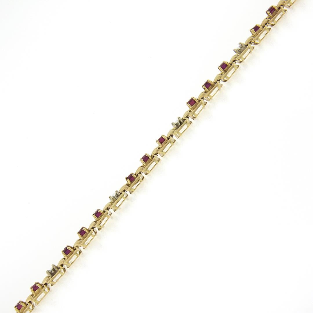 A solid 14k yellow gold square link chain bracelet, featuring 21 round cut natural rubies (2.0ctw), alternated with 7 round cut natural diamonds (G/H - SI2/I1 ; 0.14ctw). It weighs a total of 7.64 grams, measures 6.5mm wide, and measures 6.5 inches in length.