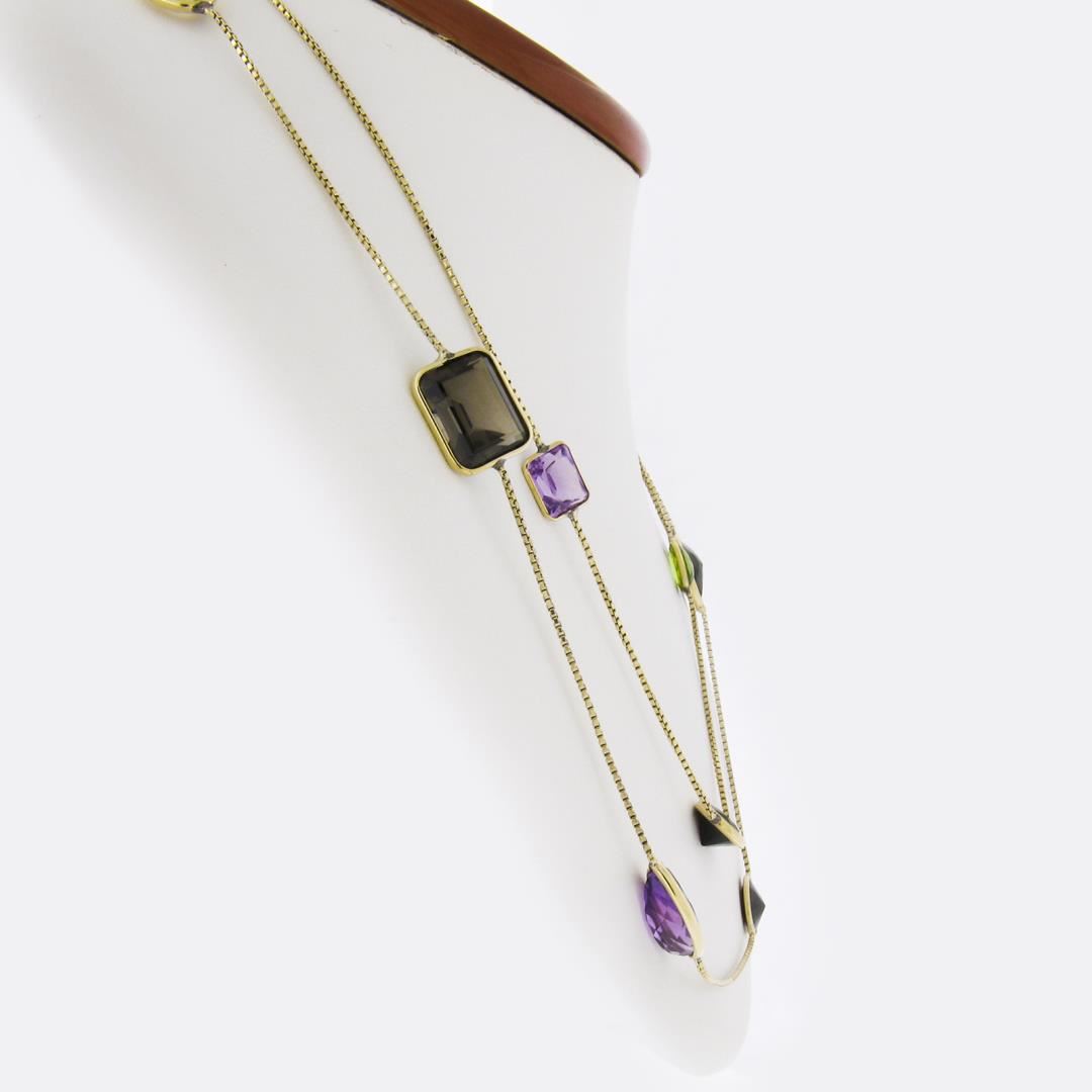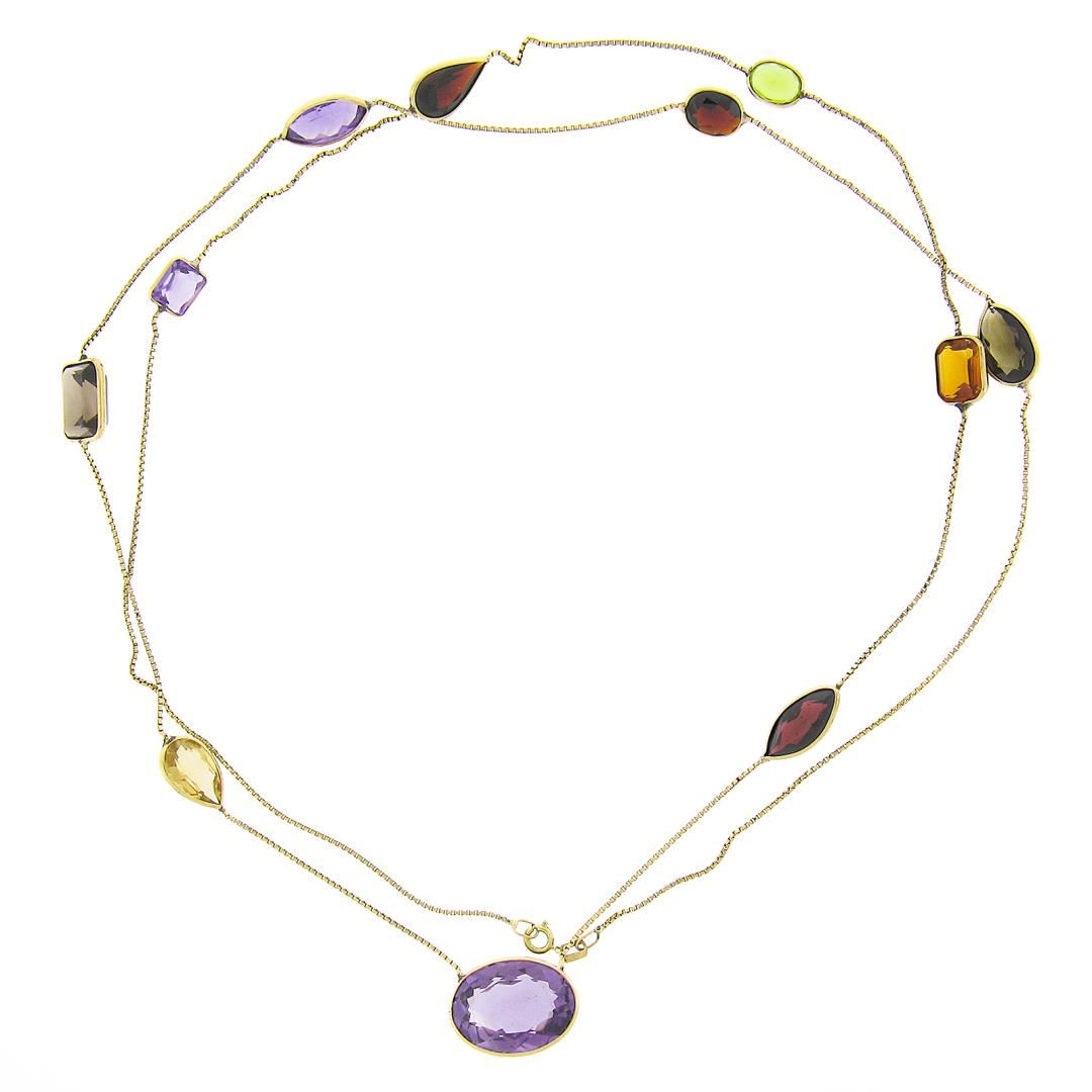 A solid 14k yellow gold long by the yard necklace, with 11 oval, pear, cushion, & marquise brilliant cut natural amethyst, citrine, garnet, quartz & peridot (center oval stone - approx.), 8.6x6.4mm (smallest oval stone). It weighs a total of 15.82 grams, measures 15.8mm wide, and measures 37 inches in length.