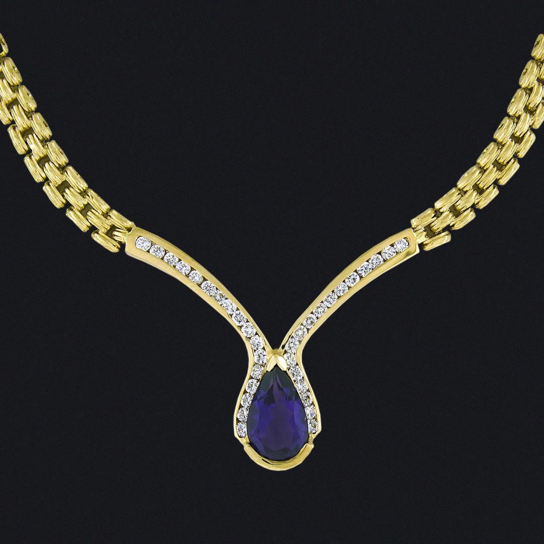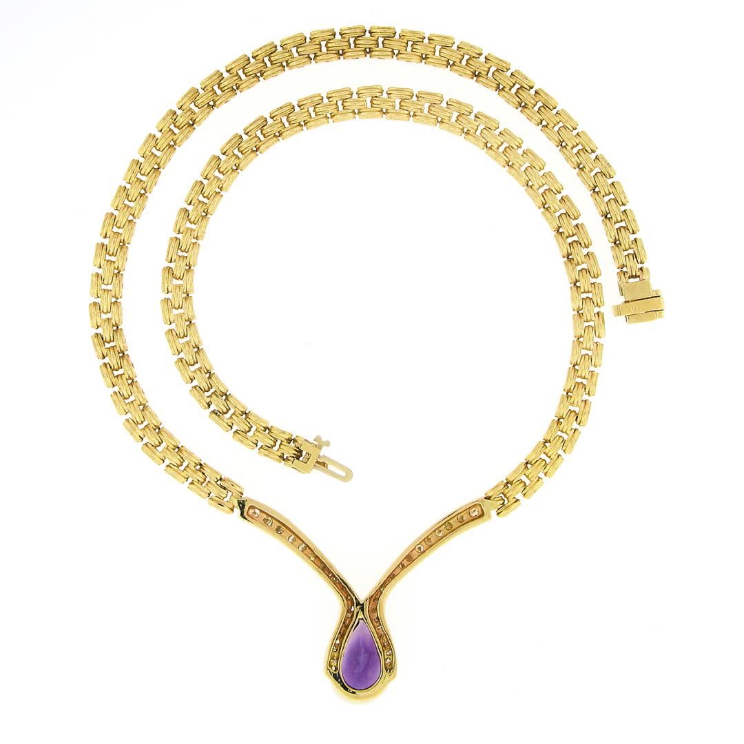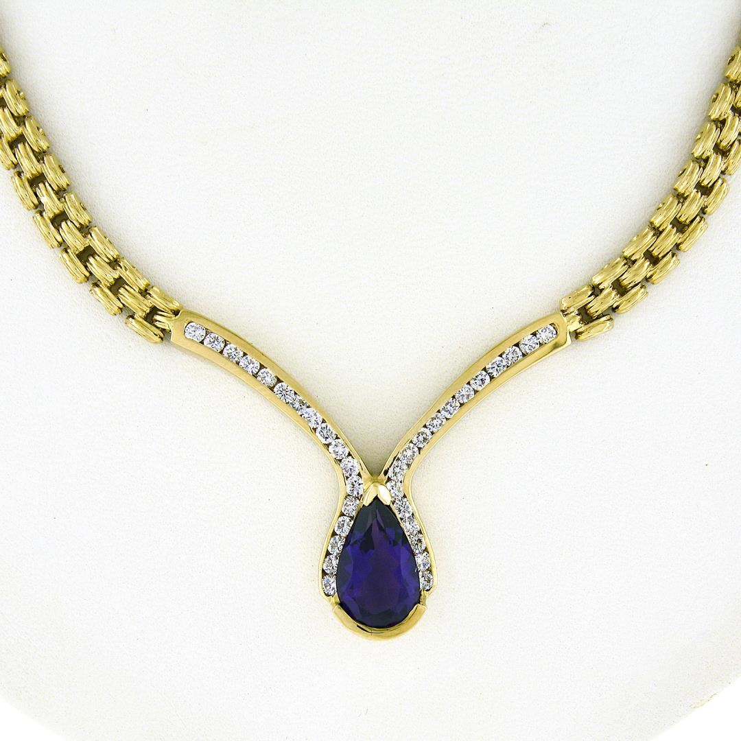 A solid 14k yellow gold chevron necklace, with 1 pear cut natural amethyst (3.17ct), and 34 round brilliant cut natural diamonds (G/H - VS2/SI1 ; 1.0ctw). 16 inch panther link chain, 45.42 grams total weight, center piece measures 34.5x42.9mm.