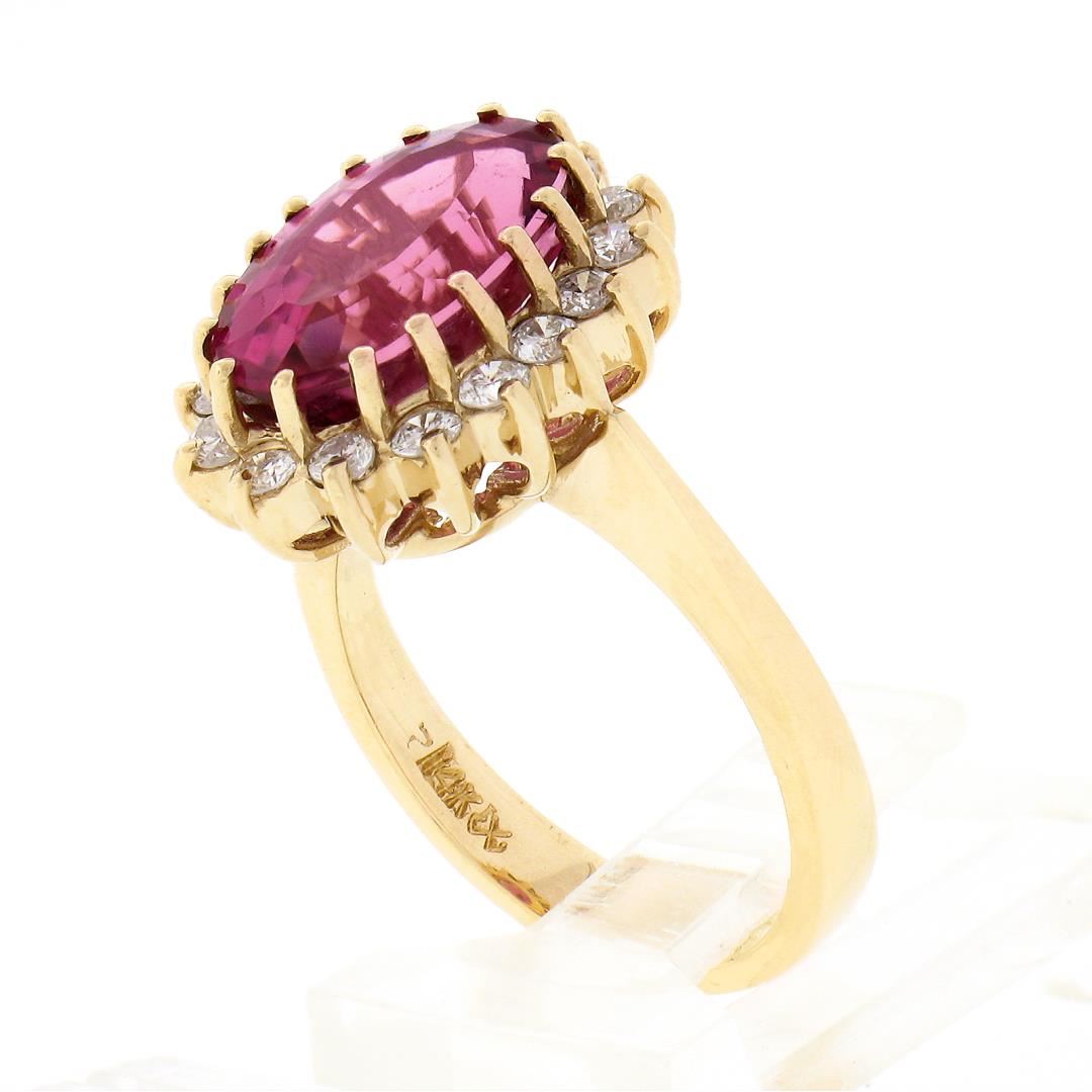 A solid 14k yellow gold engagement ring, featuring 1 oval cut natural tourmaline (3.90ct), surrounded with a halo of 16 round brilliant cut natural diamonds (G/H - VS1/VS2 ; 0.40ctw). The ring is size 5.5, weighs a total of 5.21 grams, and measures 16.20mm wide.