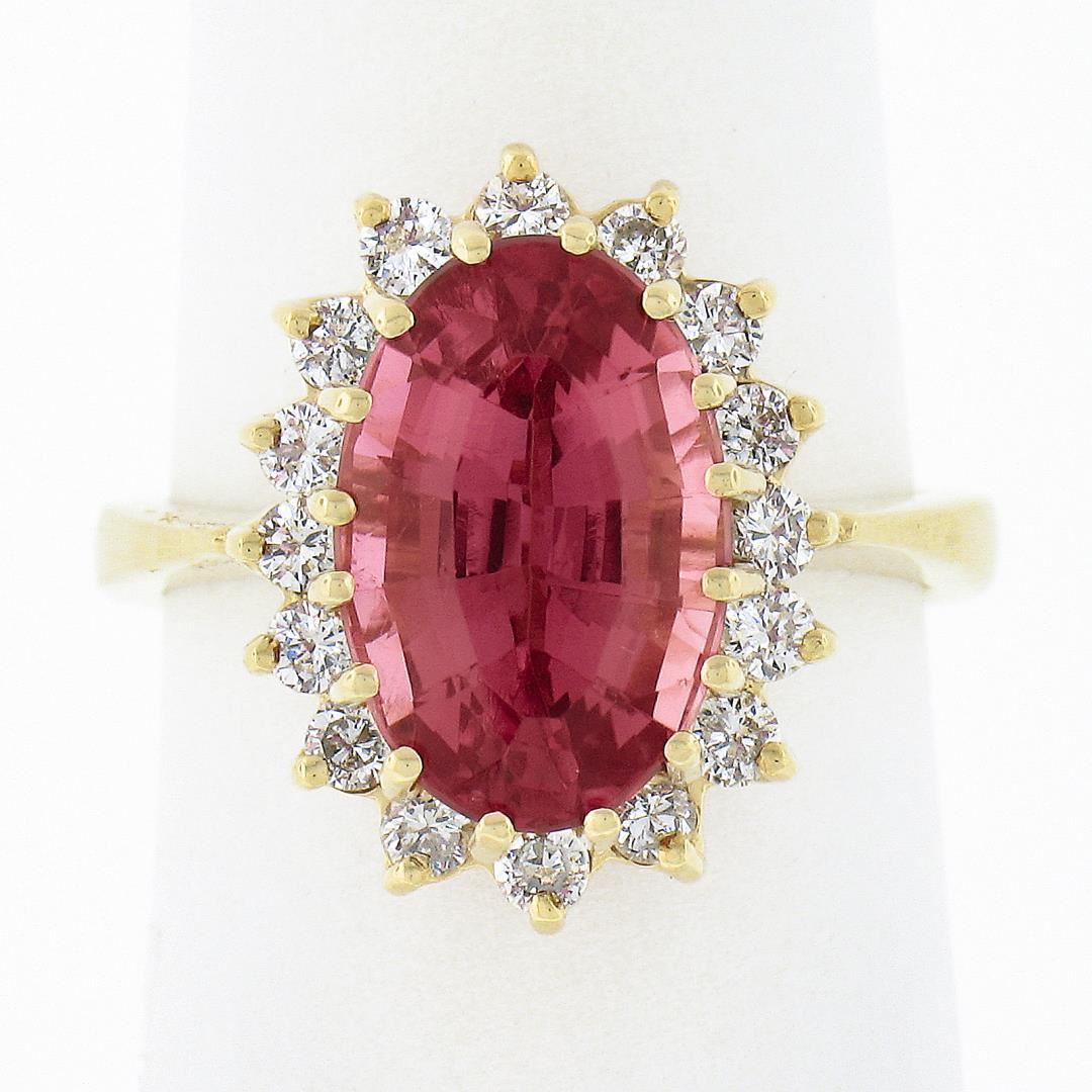A solid 14k yellow gold engagement ring, featuring 1 oval cut natural tourmaline (3.90ct), surrounded with a halo of 16 round brilliant cut natural diamonds (G/H - VS1/VS2 ; 0.40ctw). The ring is size 5.5, weighs a total of 5.21 grams, and measures 16.20mm wide.