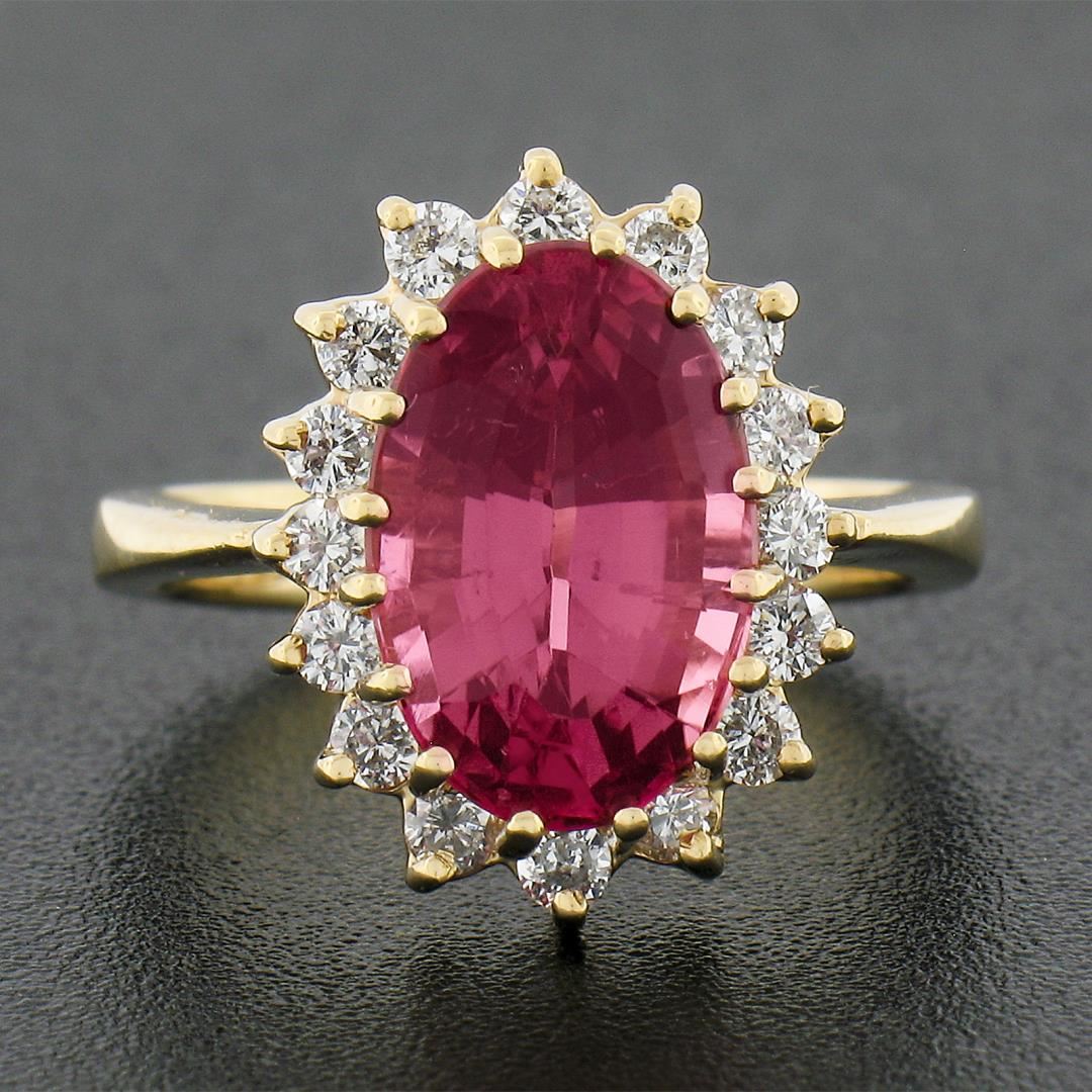 A solid 14k yellow gold engagement ring, featuring 1 oval cut natural tourmaline (3.90ct), surrounded with a halo of 16 round brilliant cut natural diamonds (G/H - VS1/VS2 ; 0.40ctw). The ring is size 5.5, weighs a total of 5.21 grams, and measures 16.20mm wide.