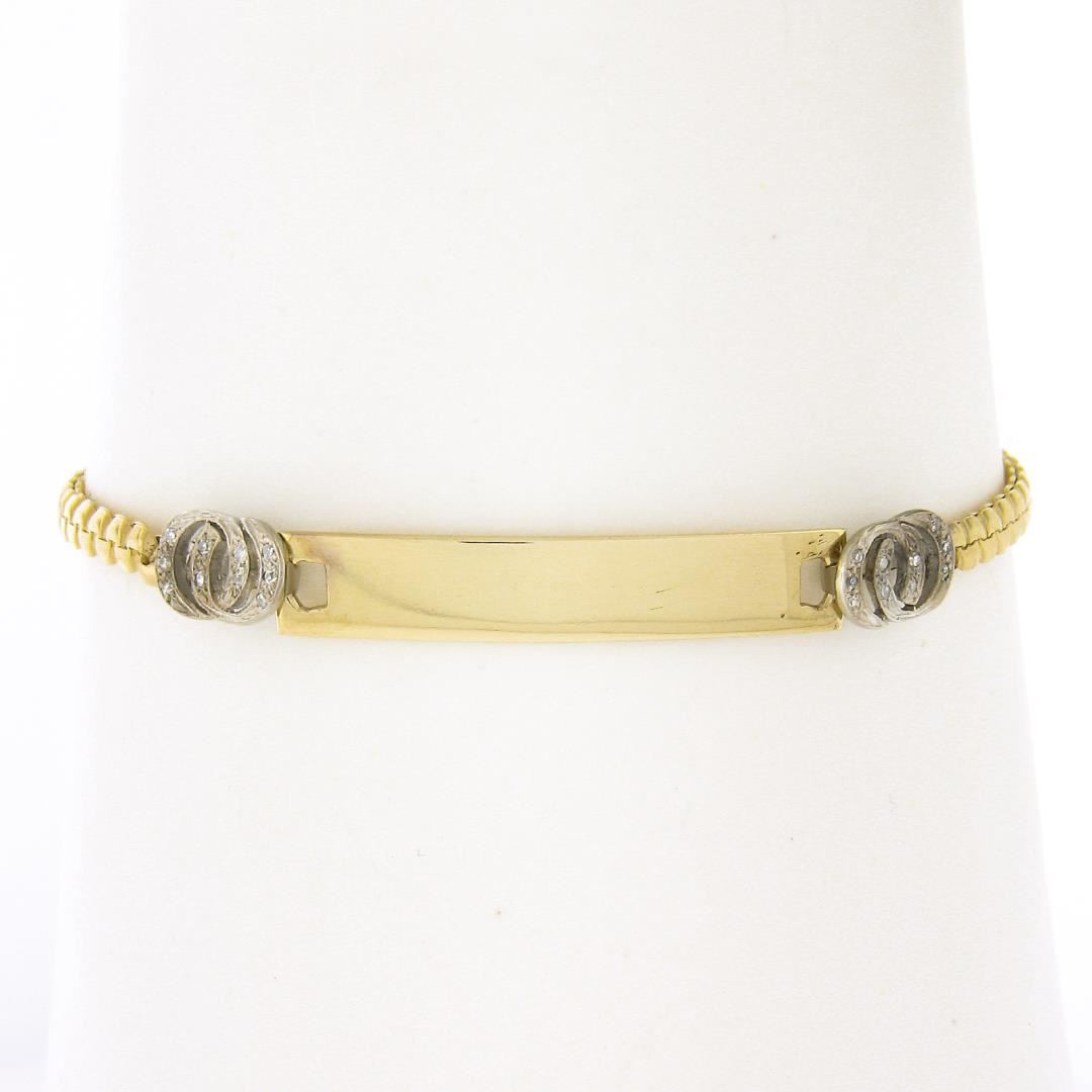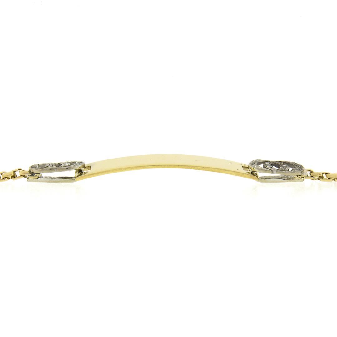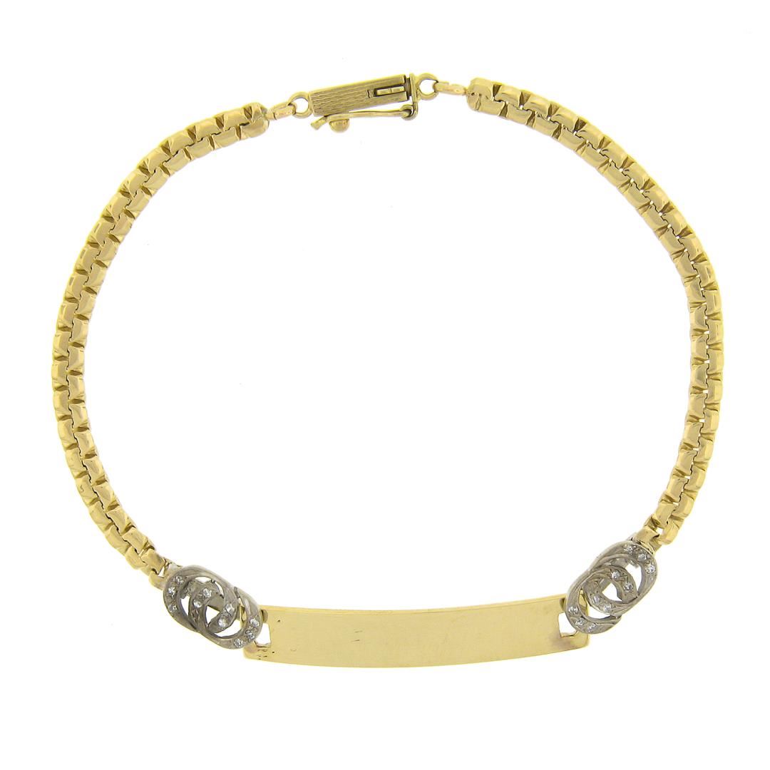 a solid 14k yellow & white gold ID bracelet, with 20 single cut natural diamonds (H/I - SI2-I2 ; 0.10ctw). It weighs a total of 6.10 grams, measures 5.6mm wide, and measures 6.25 inches in length.