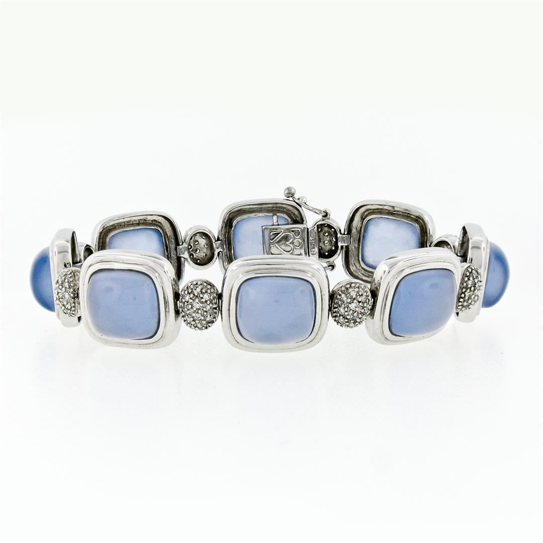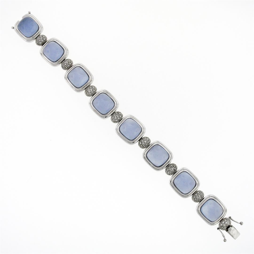 An estate solid 14k white gold bracelet, with 8 cushion cabochon cut natural jade (11.8x10.8mm), and 80 round brilliant cut natural diamonds (I - SI1/SI2 ; 0.40ctw). It weighs a total of 27.17 grams, measures 15.6mm wide, and measures 6.75 inches in length.