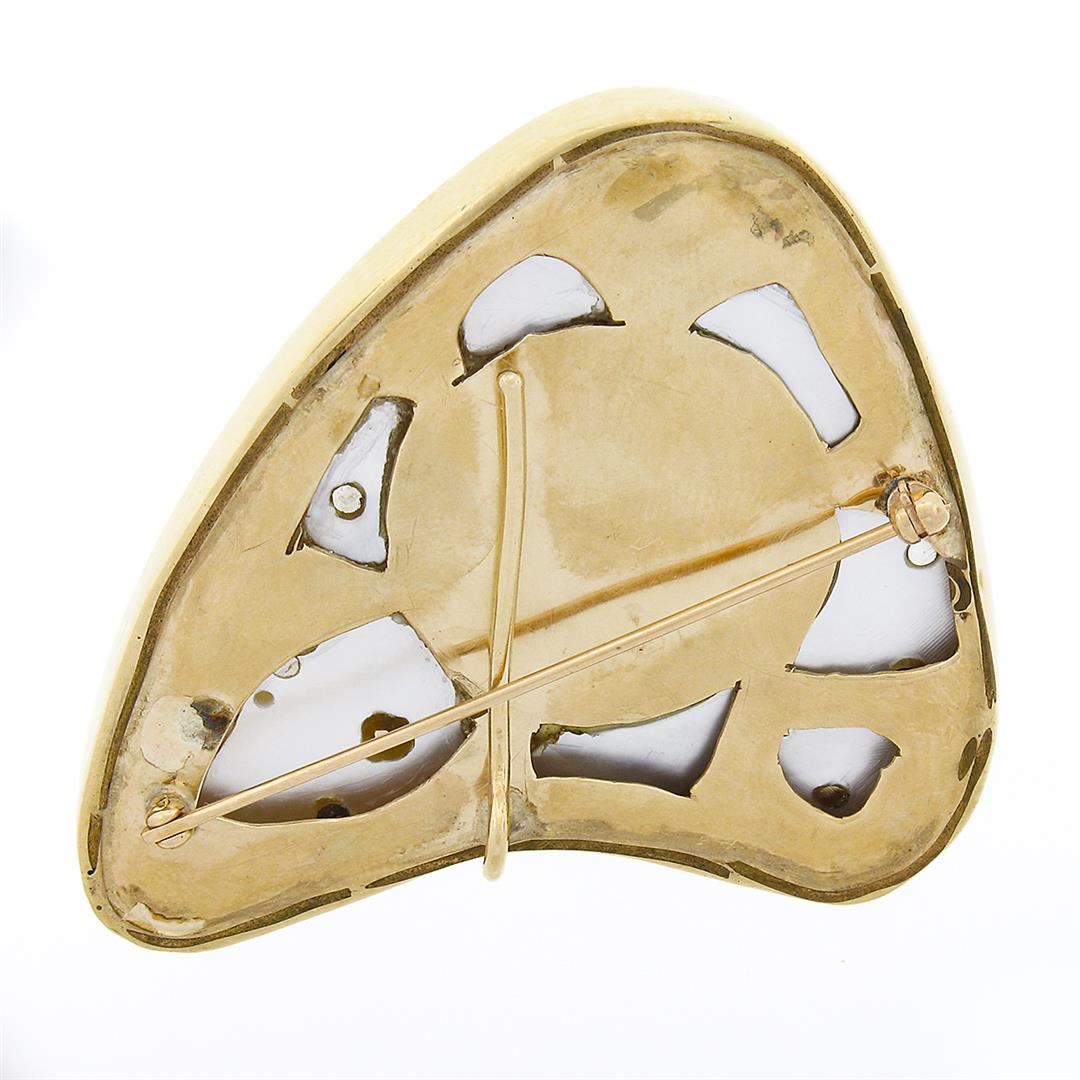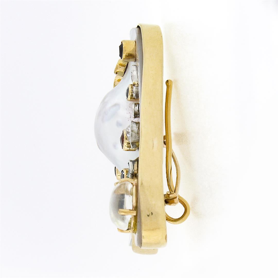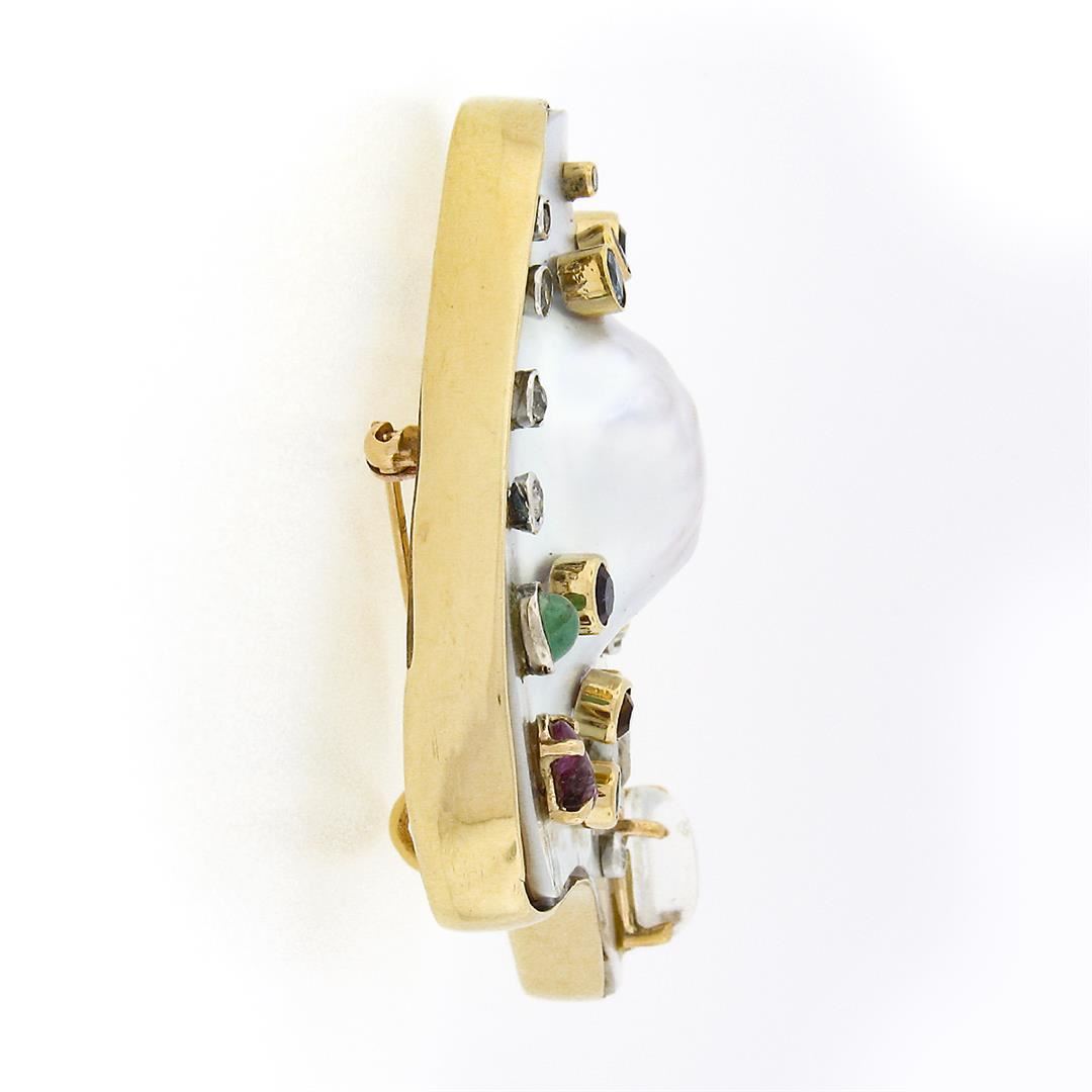 A solid 14k yellow gold brooch pendant, featuring 12 multi shapes natural diamonds (G/K - VS2/I2 ; 1.37ctw), and old marquise cut natural ruby, aquamarine, moonstone, citrine, emerald, amethyst & garnet, with 1 baroque shape cultured pearl. Measures 53.10x52.10mm and weighs a total of 42.47 grams.
