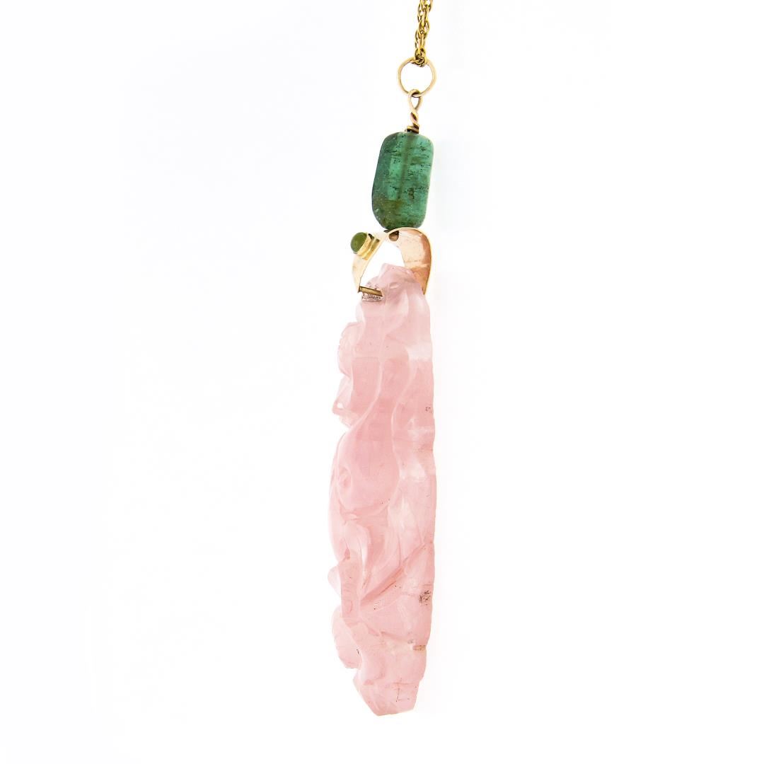 A solid 14k white gold pendant necklace, with 1 GIA graded floral carved natural rose quartz (60.33x 27.70x10.58 mm), and 1 round cabochon cut natural lemon quartz (3.1mm ), and 1 elongated bead shape natural green tourmaline (13x7.5mm). 22 inch rope link chain, 28.86 grams total weight, pendant measures 77.7x27.7mm. Comes with all original relevant certifications.