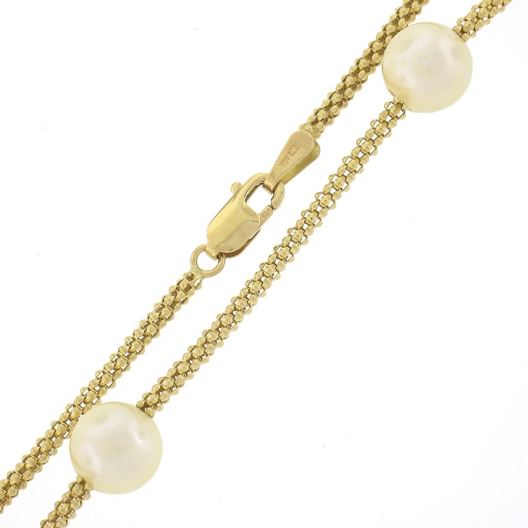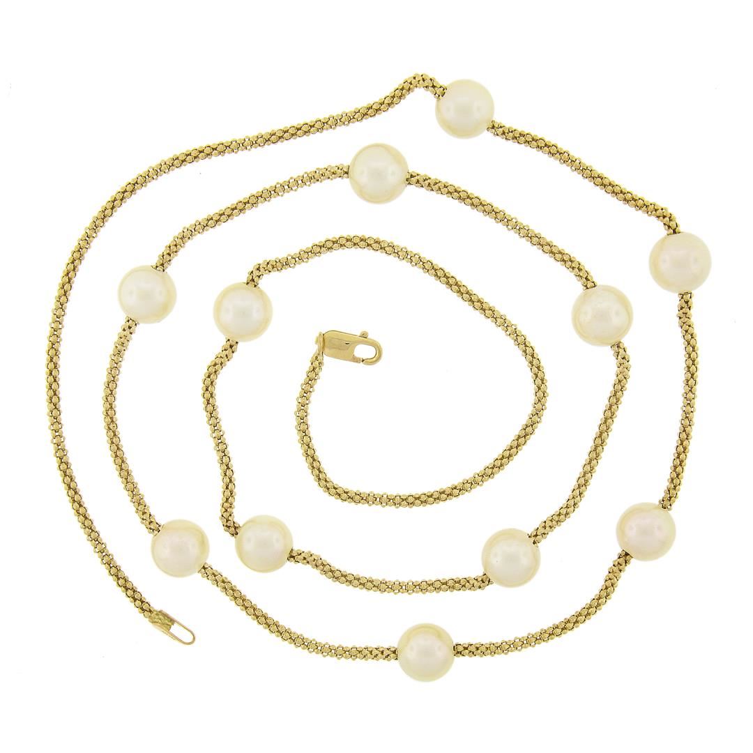 A solid 14k yellow gold by the yard necklace, with 11 round shape cultured pearls (7.1-7.4mm each). It weighs a total of 10.19 grams, measures 7.4mm wide, and measures 24 inches in length.