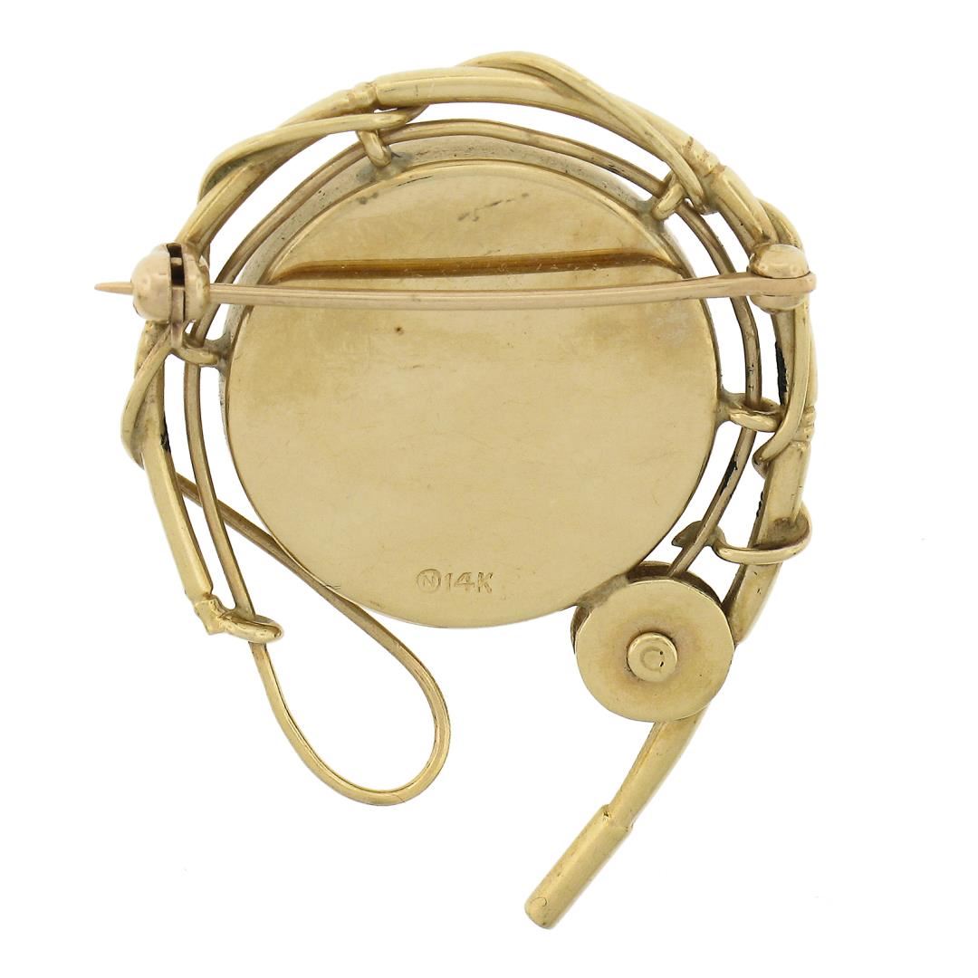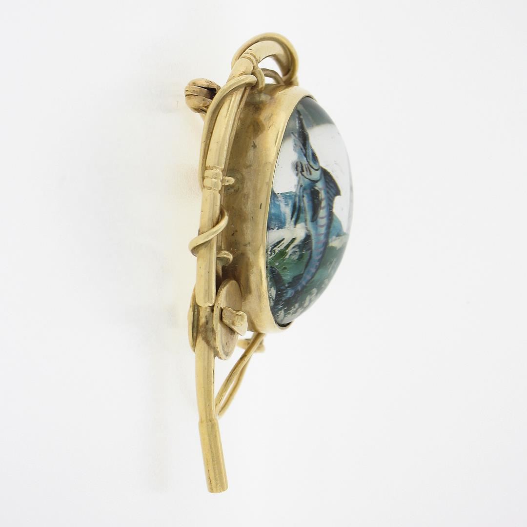 A solid 14k yellow gold fishing brooch, with intaglio painting scene. Measures 39.6x29mm and weighs a total of 11.21 grams.