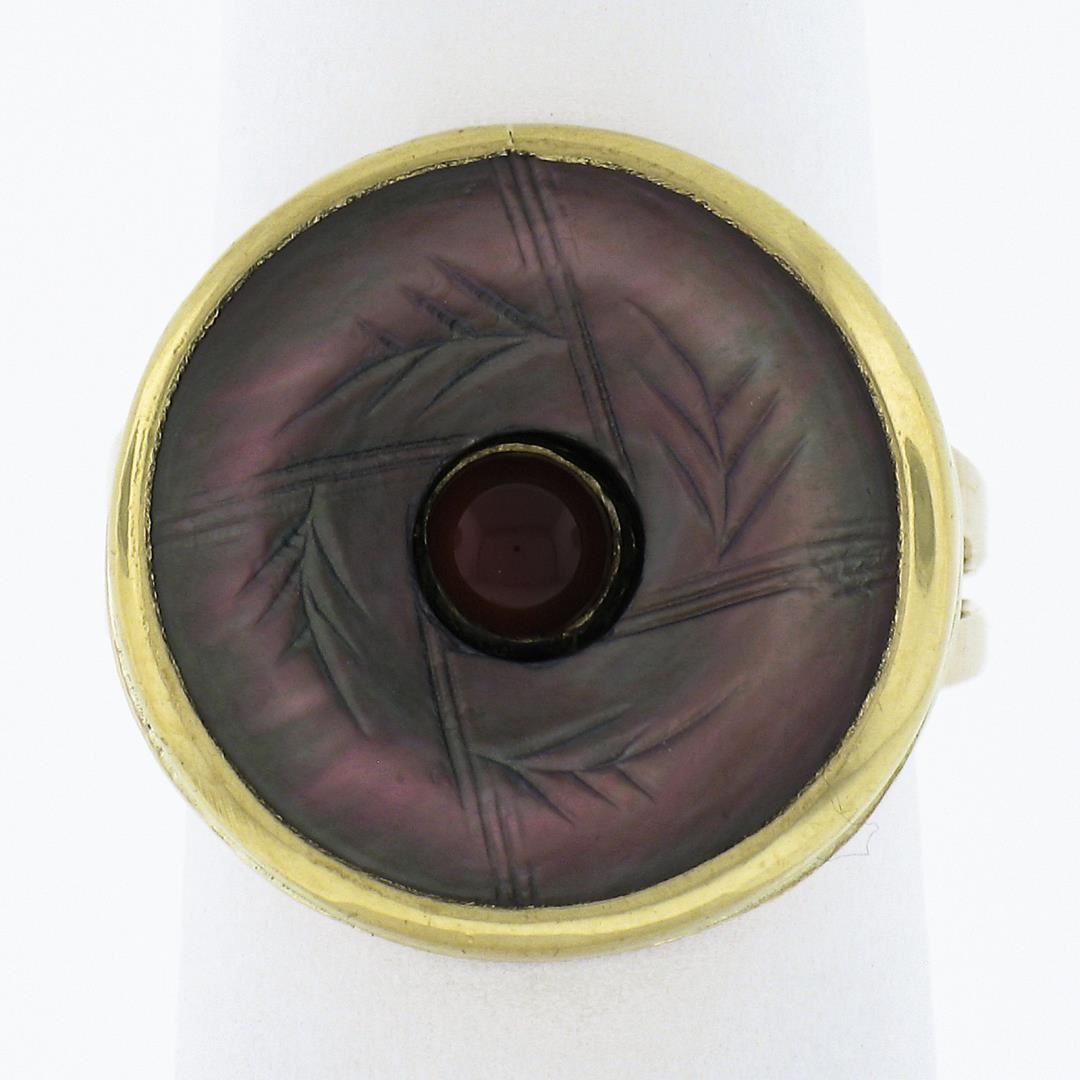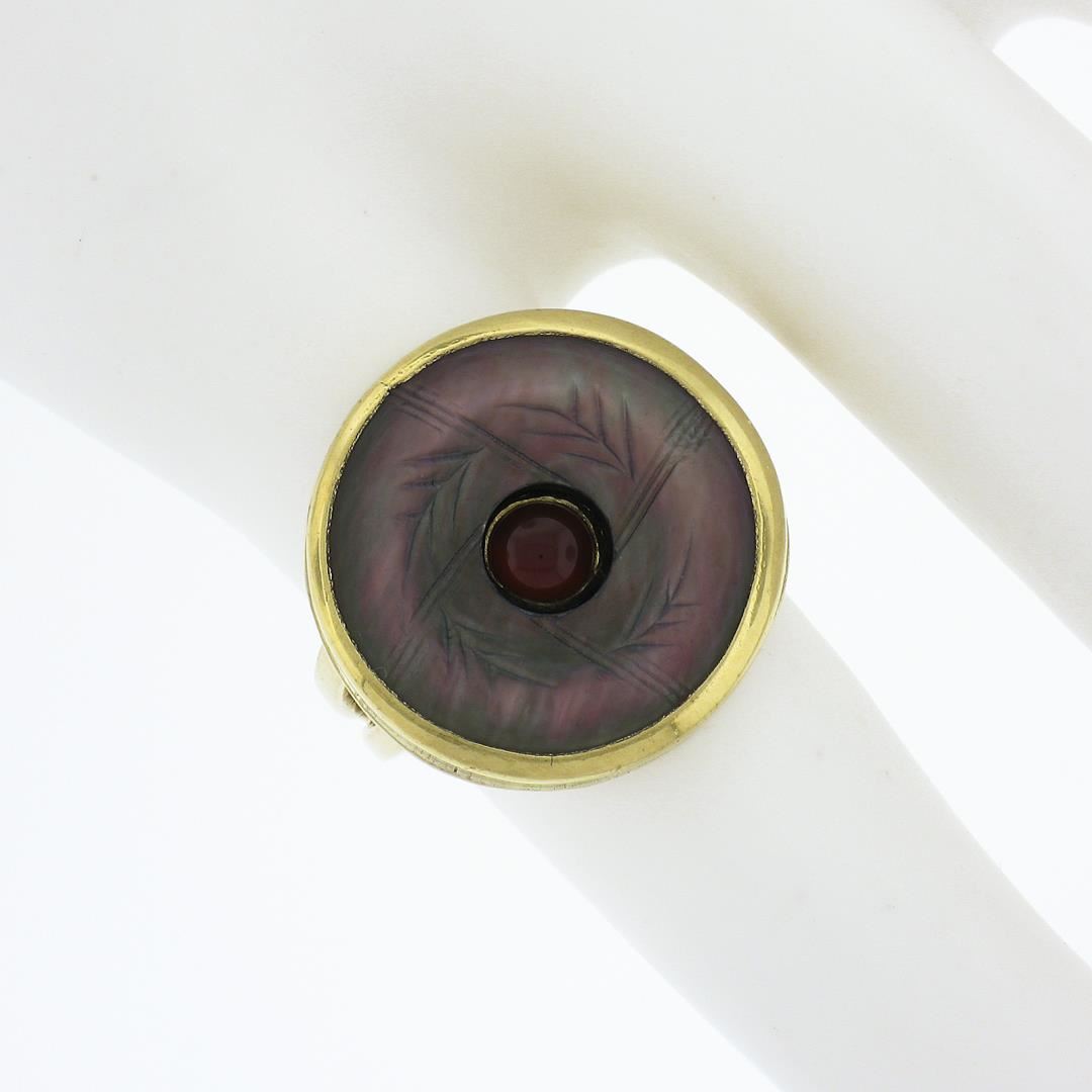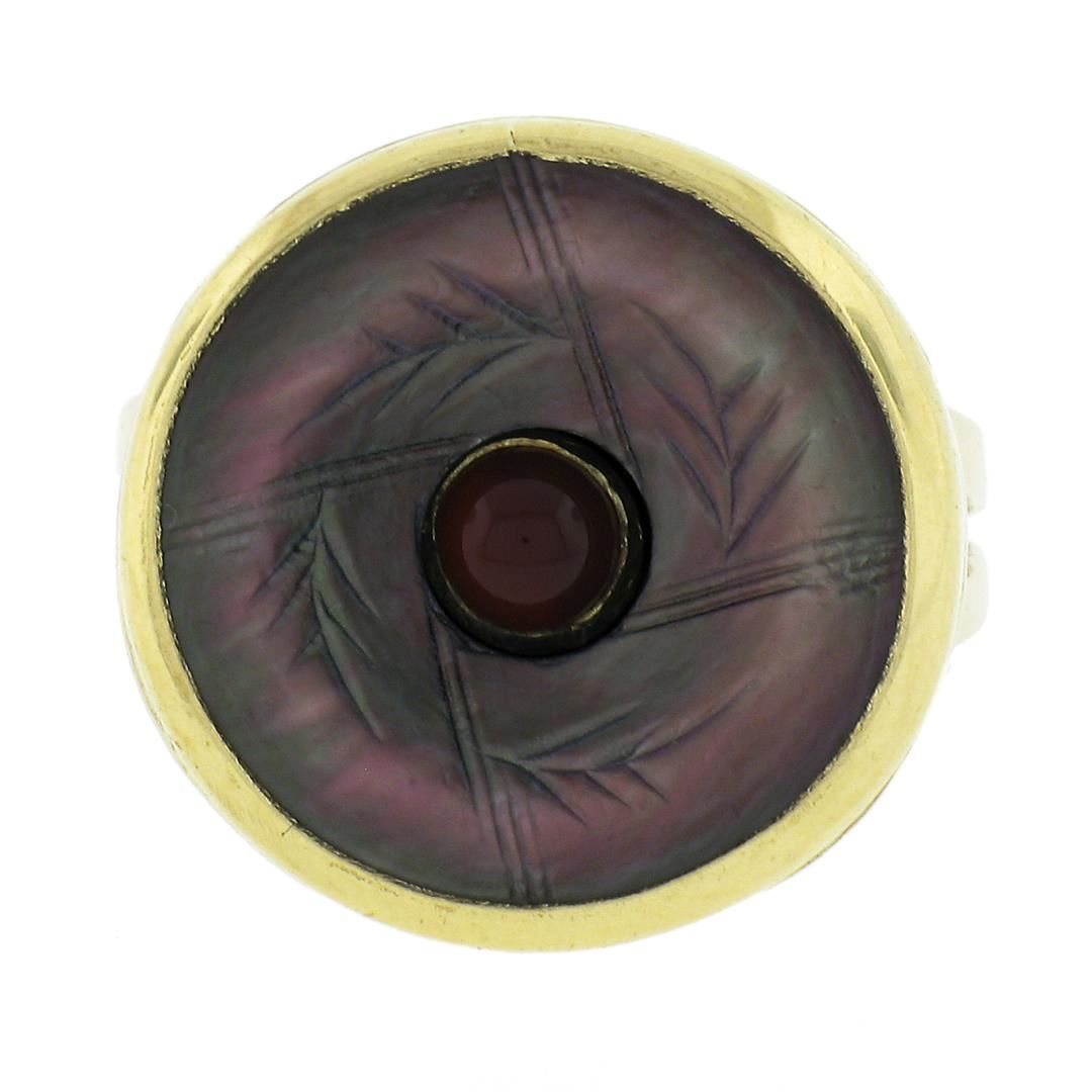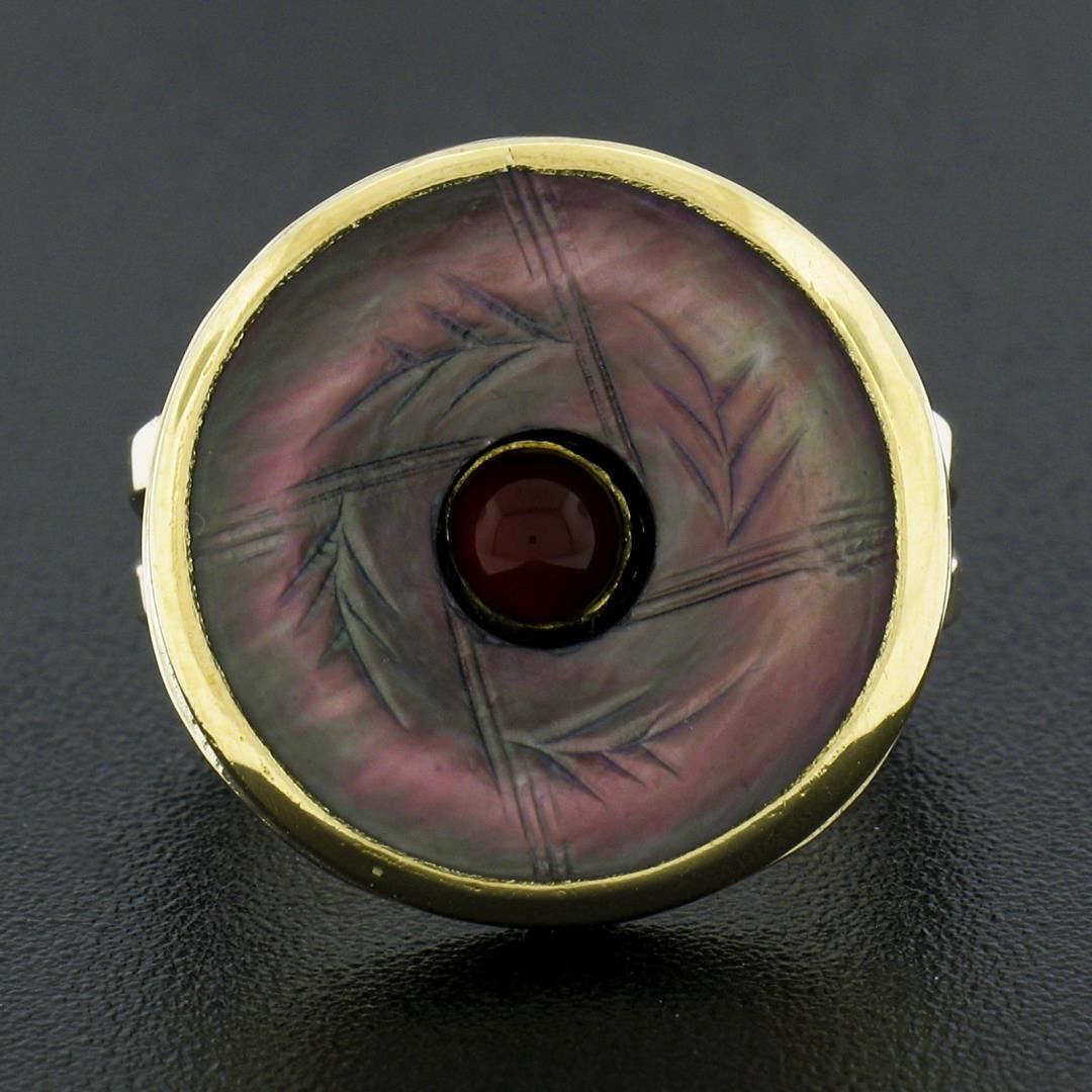 A solid 14k yellow gold button earrings, with 1 carved mother of pearl (15.7mm), and 1 round cabochon cut natural carnelian (3.9mm). The ring is size 5.0, weighs a total of 6.59 grams, and measures 17.6mm wide.