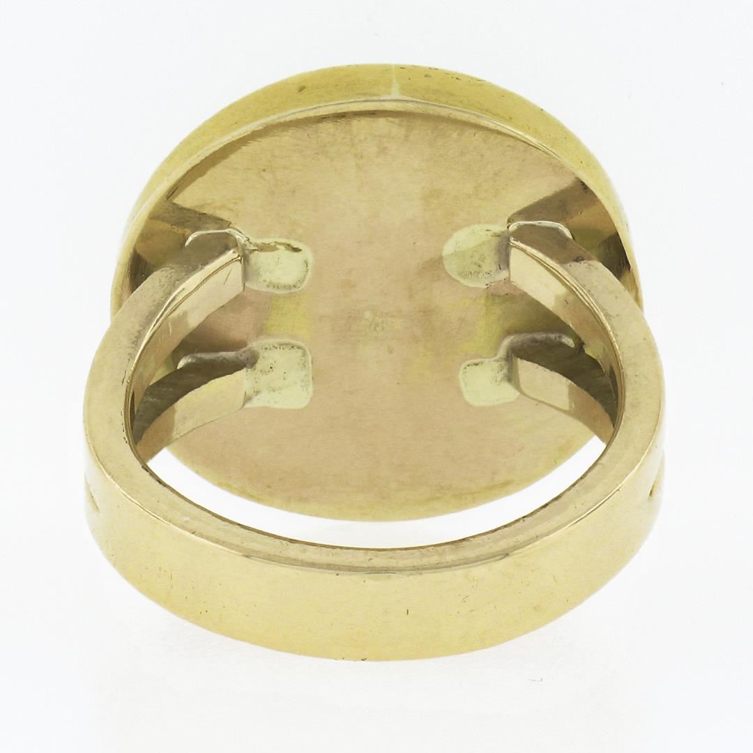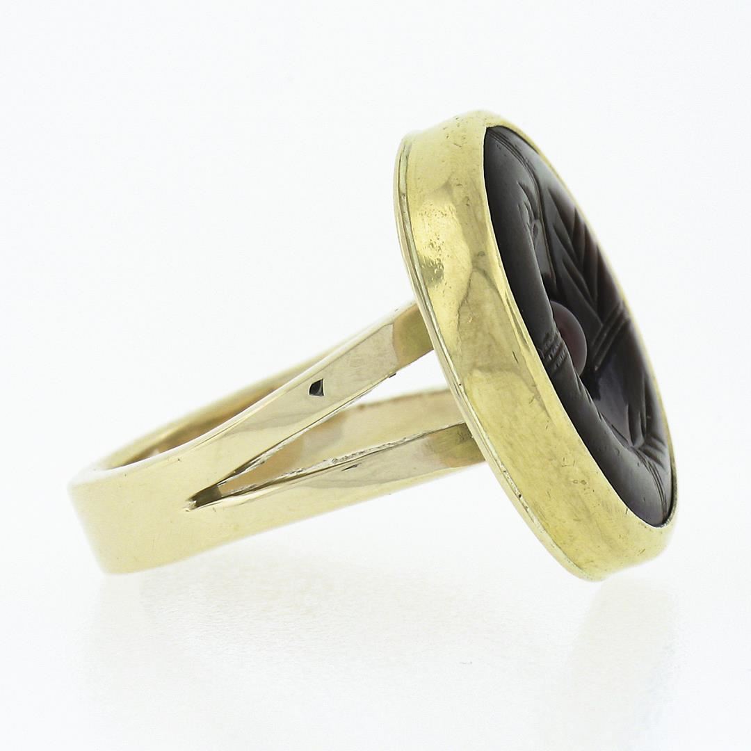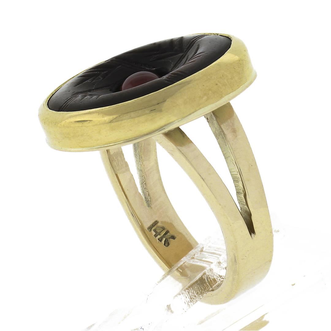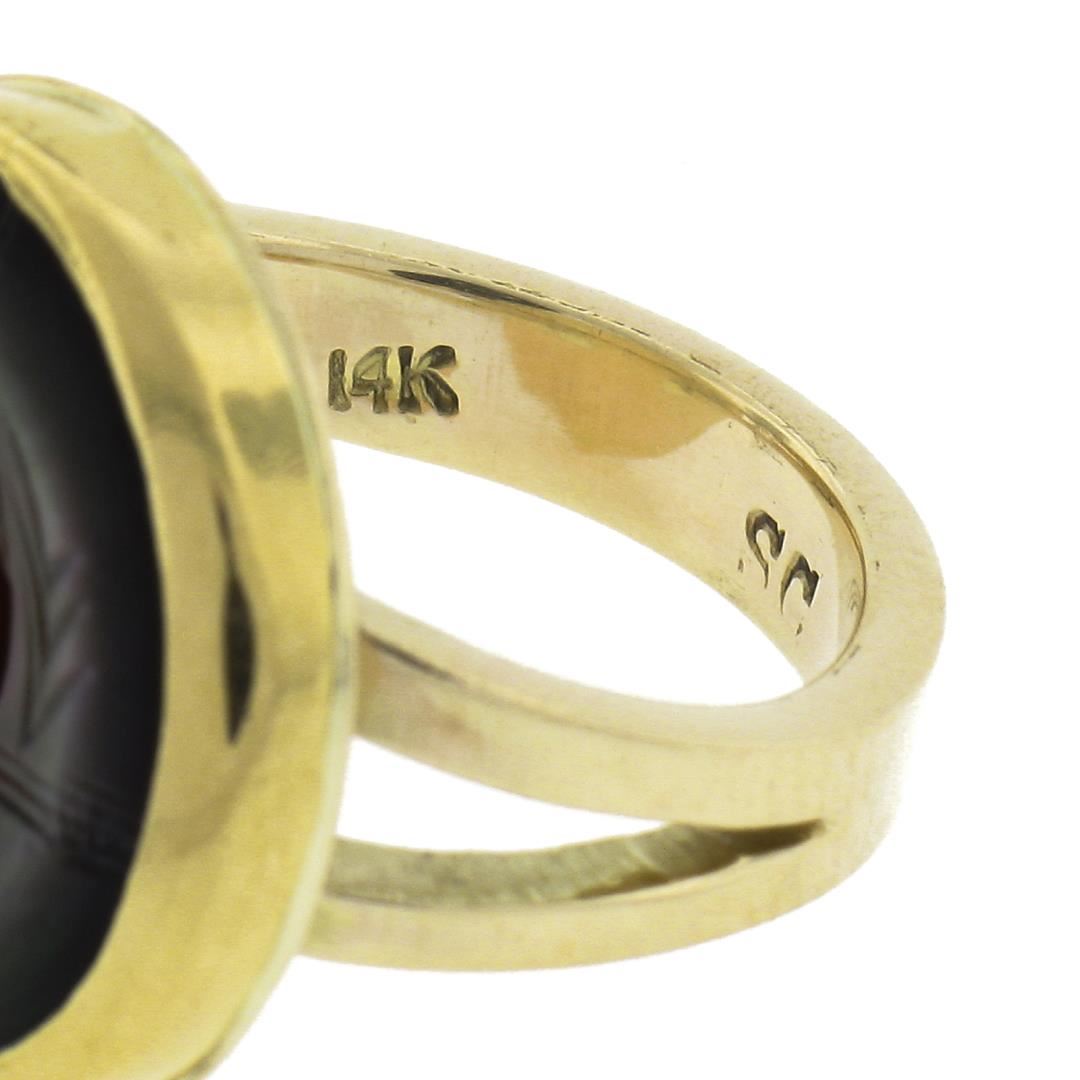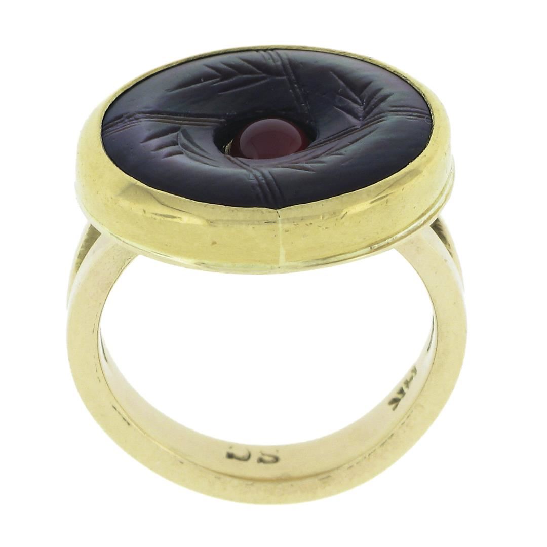 A solid 14k yellow gold button earrings, with 1 carved mother of pearl (15.7mm), and 1 round cabochon cut natural carnelian (3.9mm). The ring is size 5.0, weighs a total of 6.59 grams, and measures 17.6mm wide.